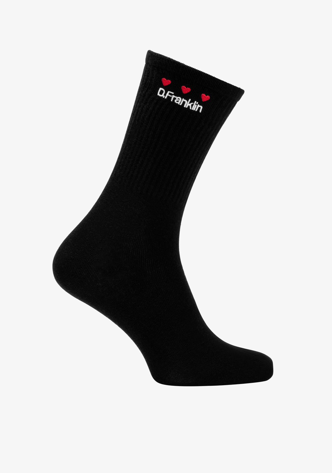 We dare not define love, but we do dedicate a pair of mid-cut cotton socks to it. Softly quilted design on the bottom. D.Franklin logo and three red hearts embroidered on the top, distinctive of the From Heart To Heart collection.