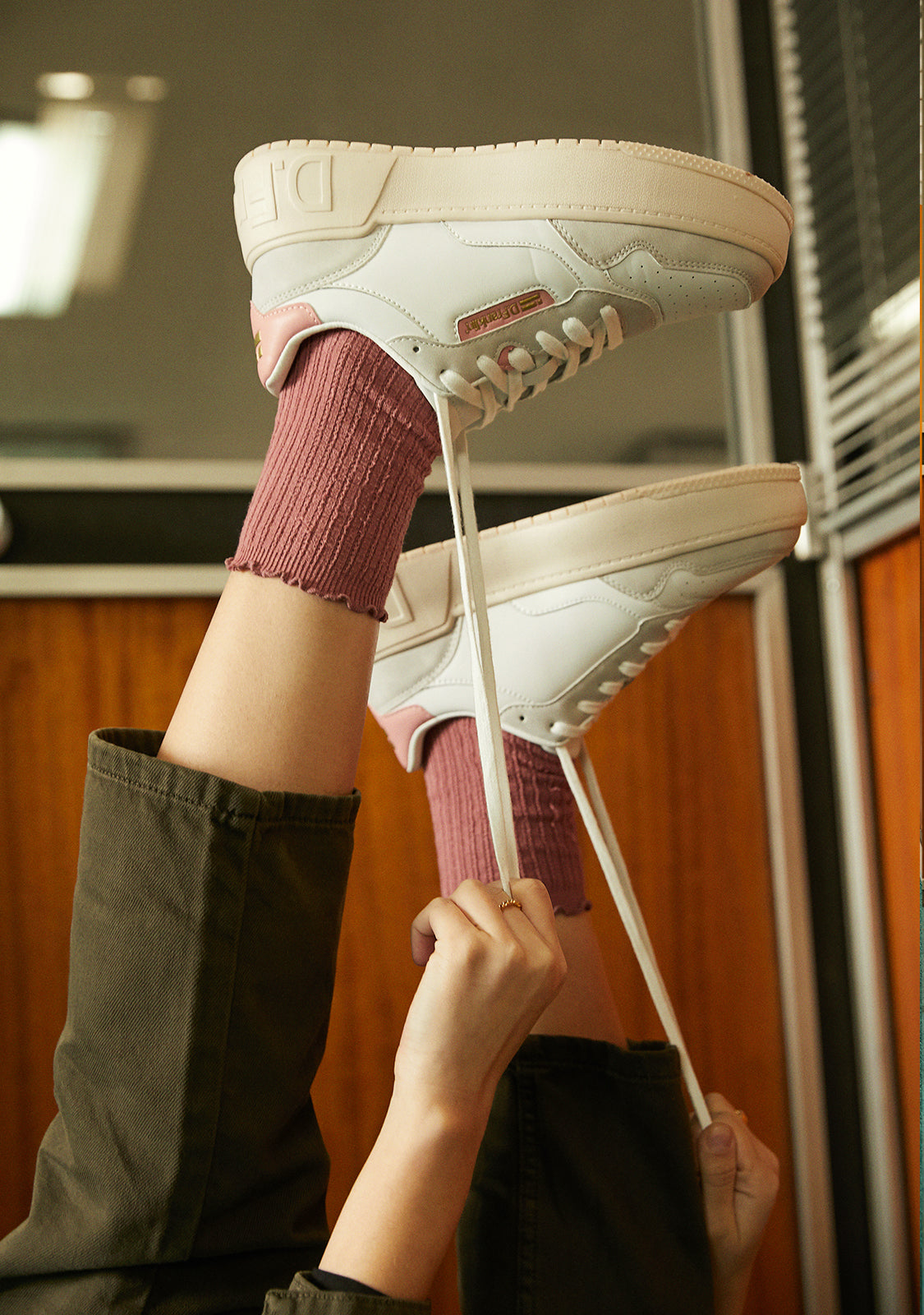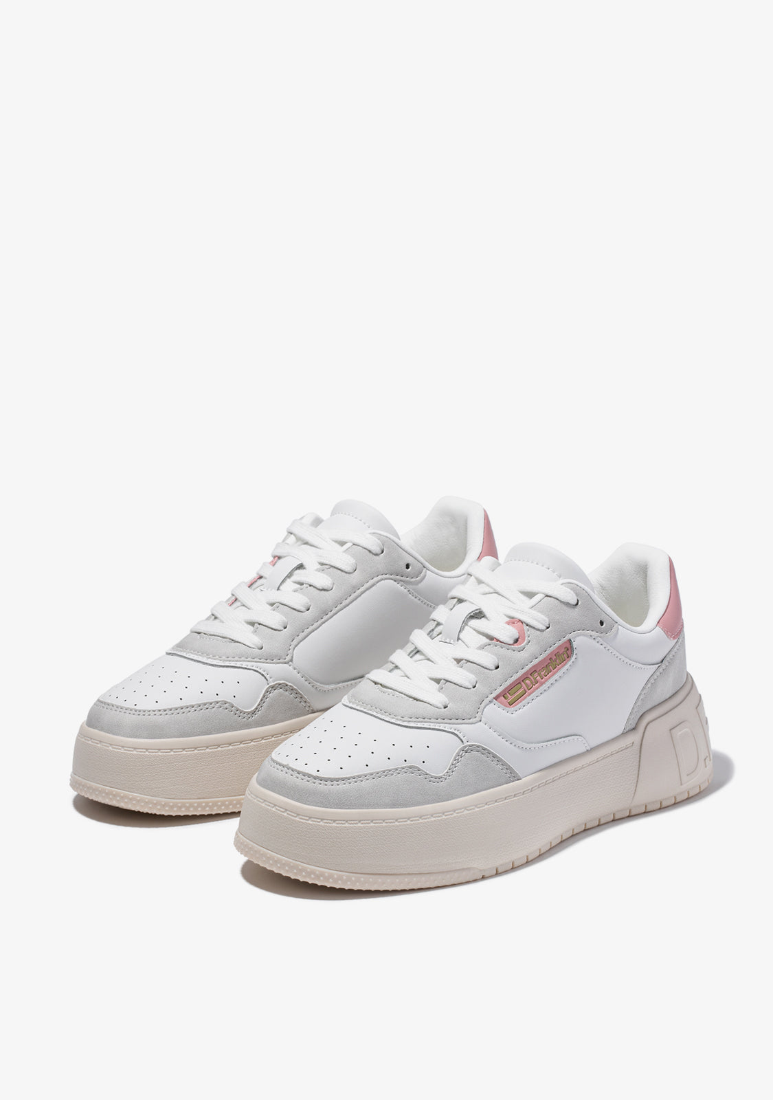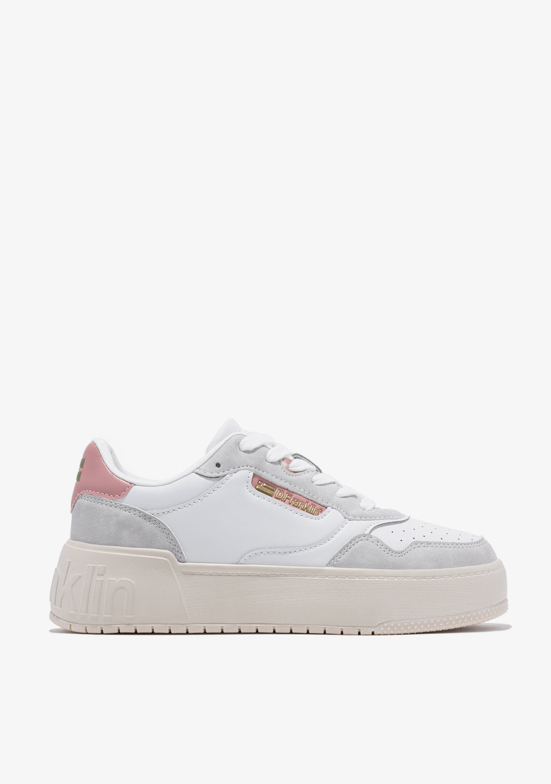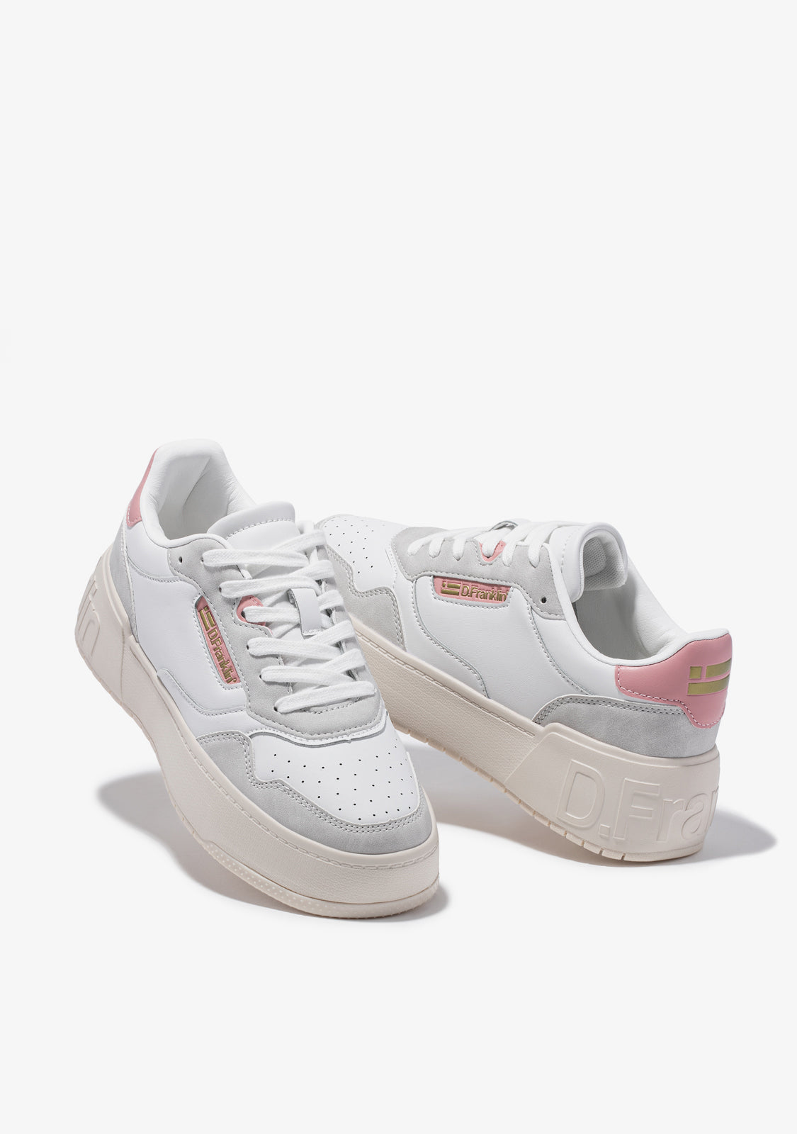 A refined approach inspired by the '90s basketball scene. Minimalist trainer with heel and D.Franklin emblem on the side in pink. Contrasting grey parts on white vegan synthetic leather. Constructed with rubber sole. Embossed D.Franklin logo on heel. Cotton laces. 4 cm sole.