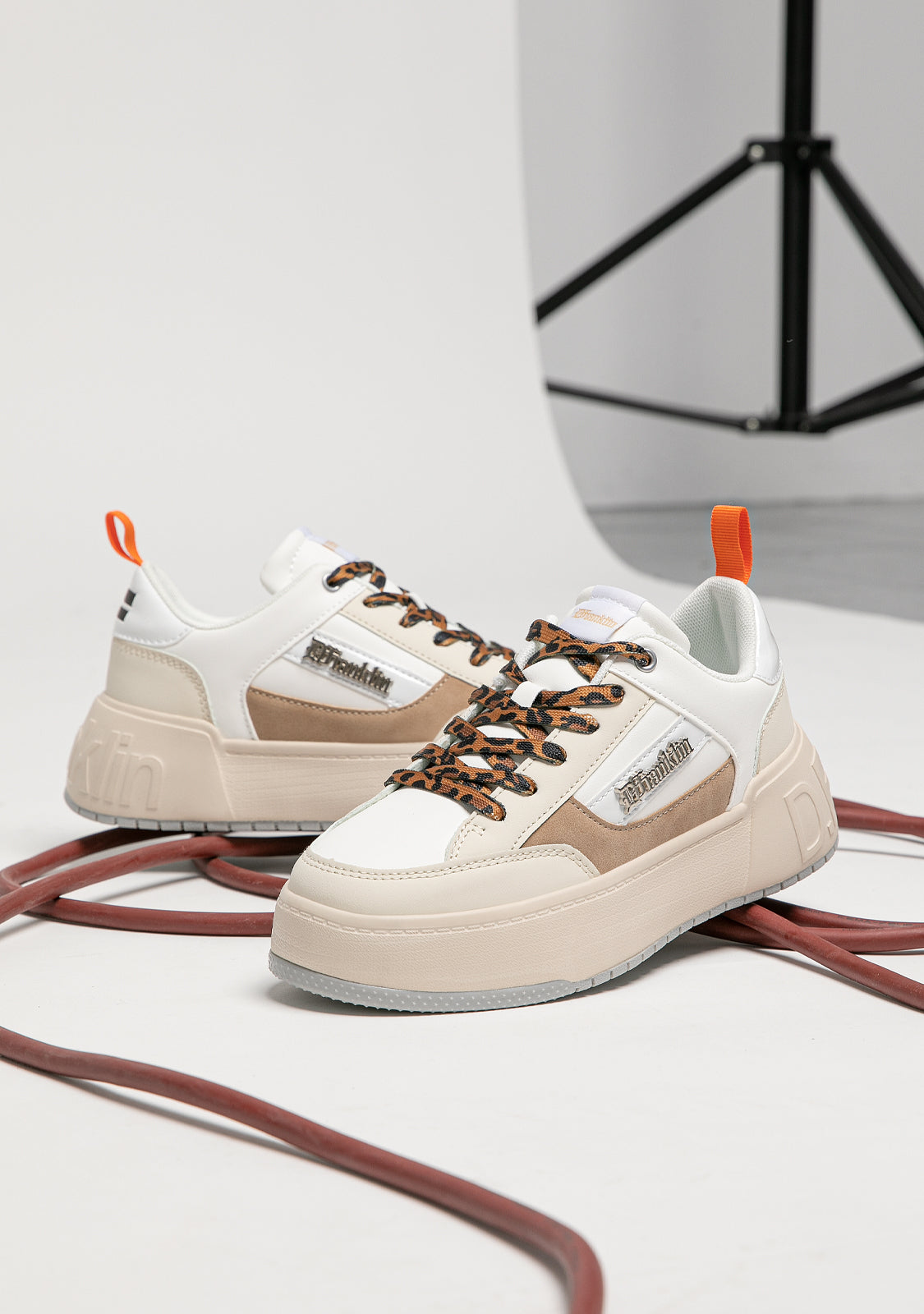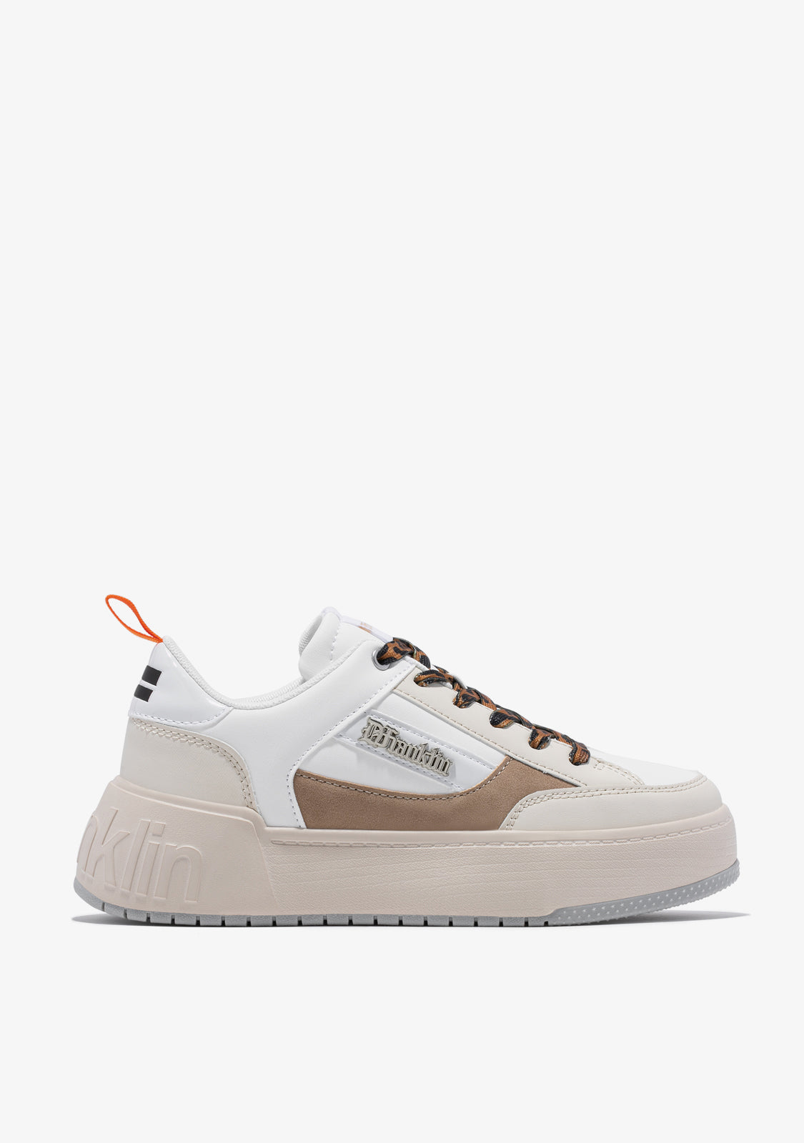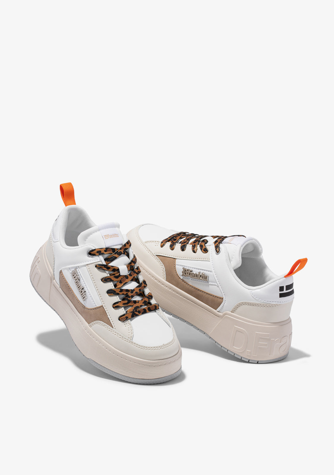 A refined approach inspired by the '90s basketball scene, with a contemporary twist. Beige suede side and silver D.Franklin emblem. Constructed with rubber sole and vegan synthetic leather. Embossed D.Franklin logo on heel. Cotton laces with animal print. 4 cm sole.