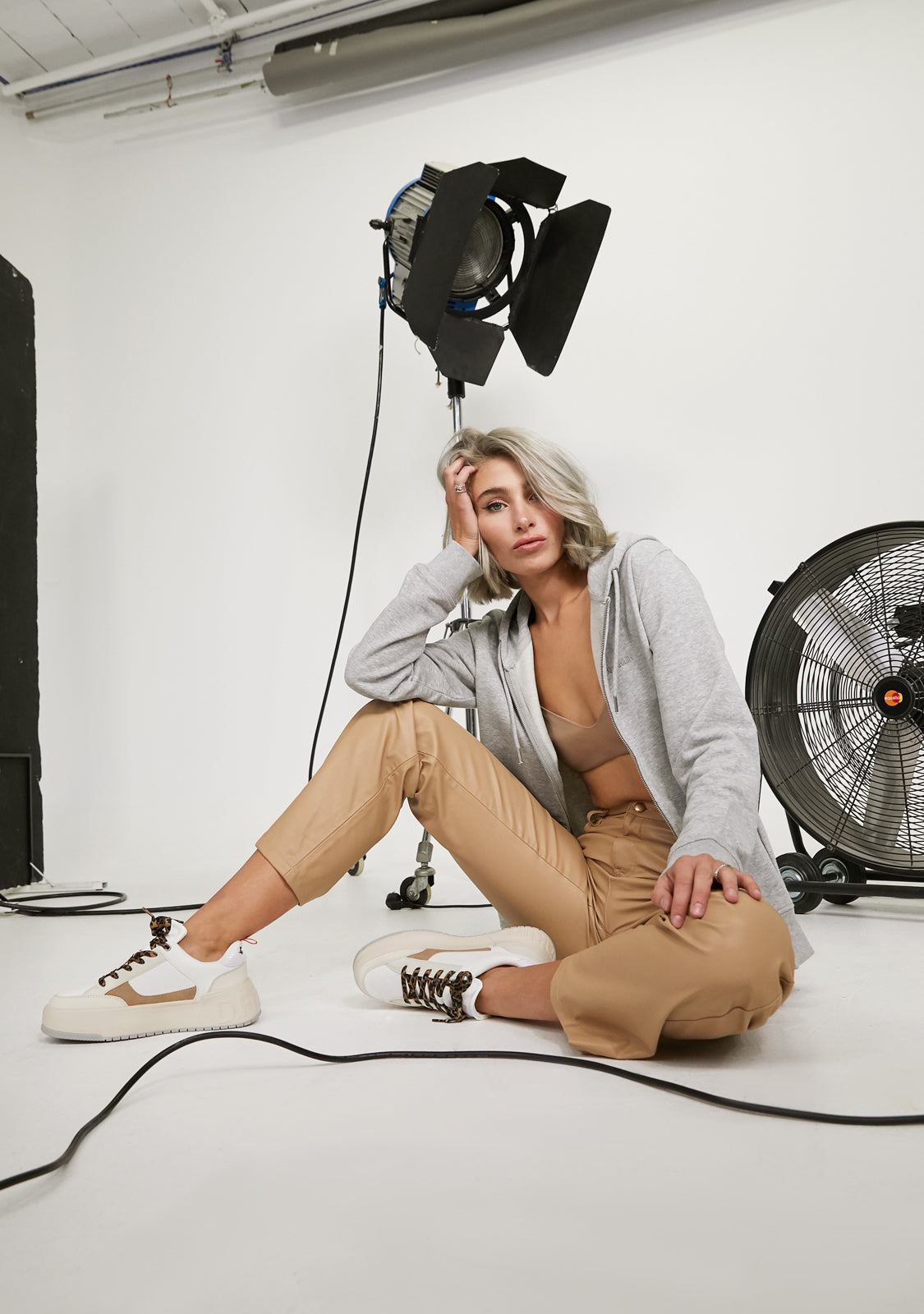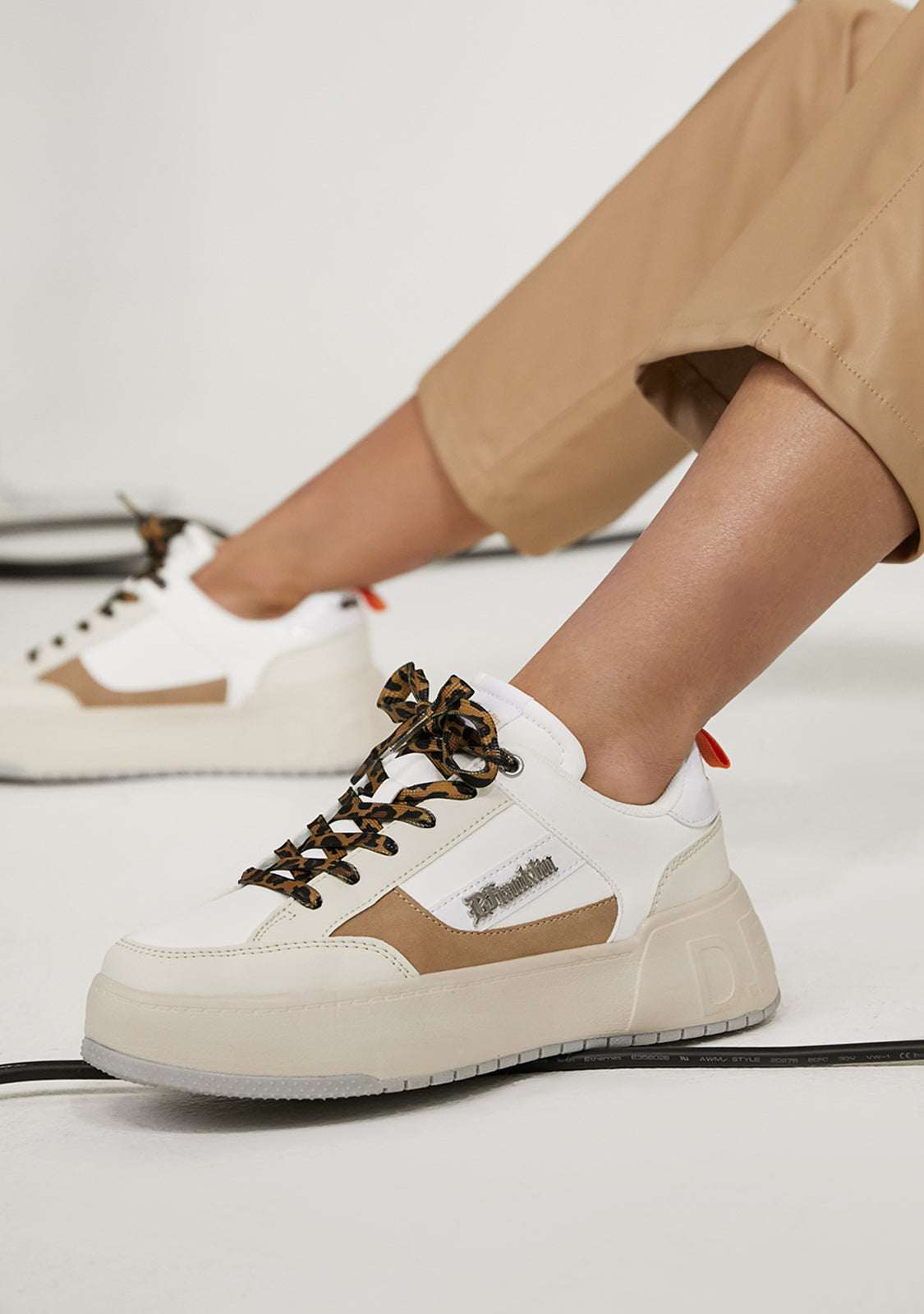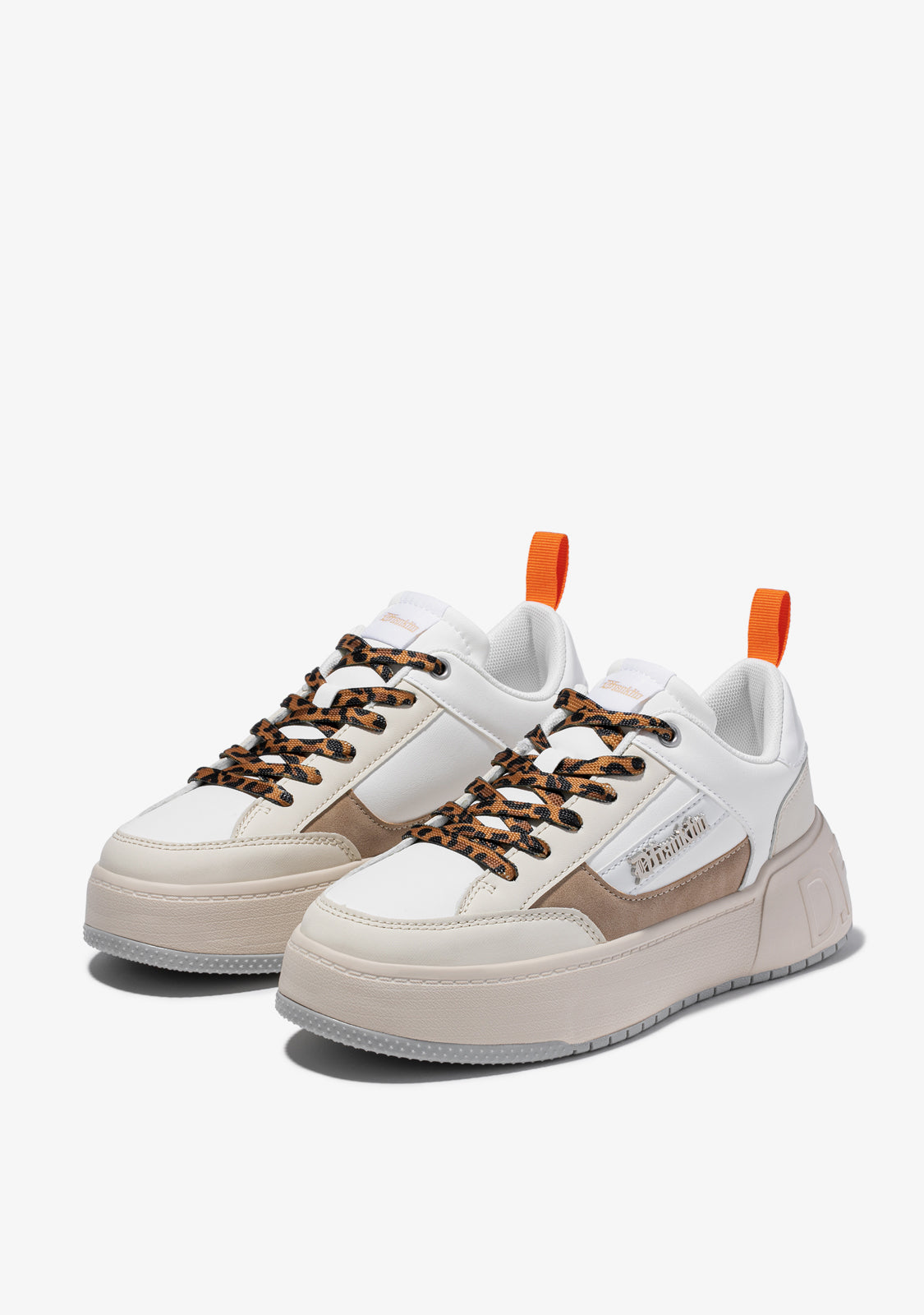 A refined approach inspired by the '90s basketball scene, with a contemporary twist. Beige suede side and silver D.Franklin emblem. Constructed with rubber sole and vegan synthetic leather. Embossed D.Franklin logo on heel. Cotton laces with animal print. 4 cm sole.