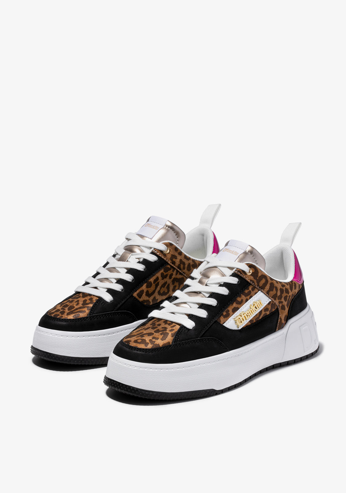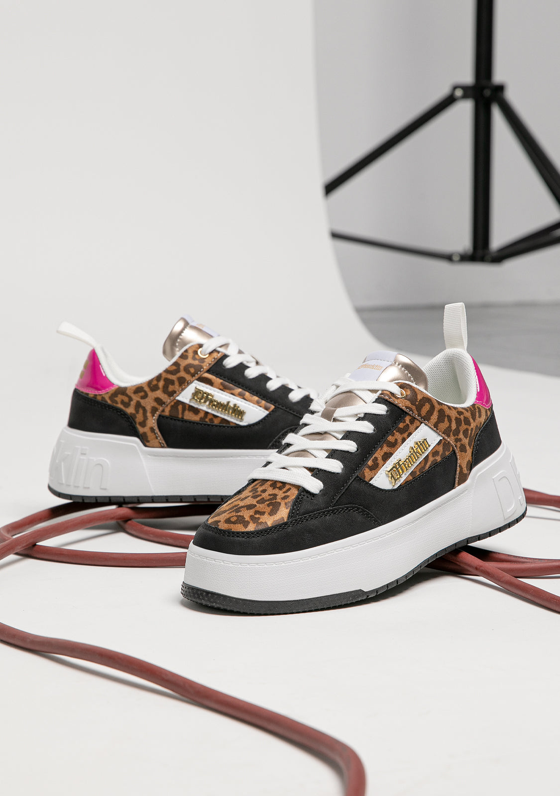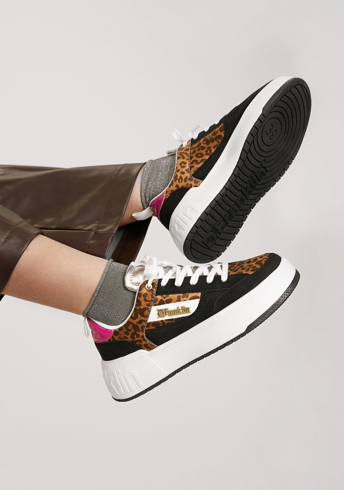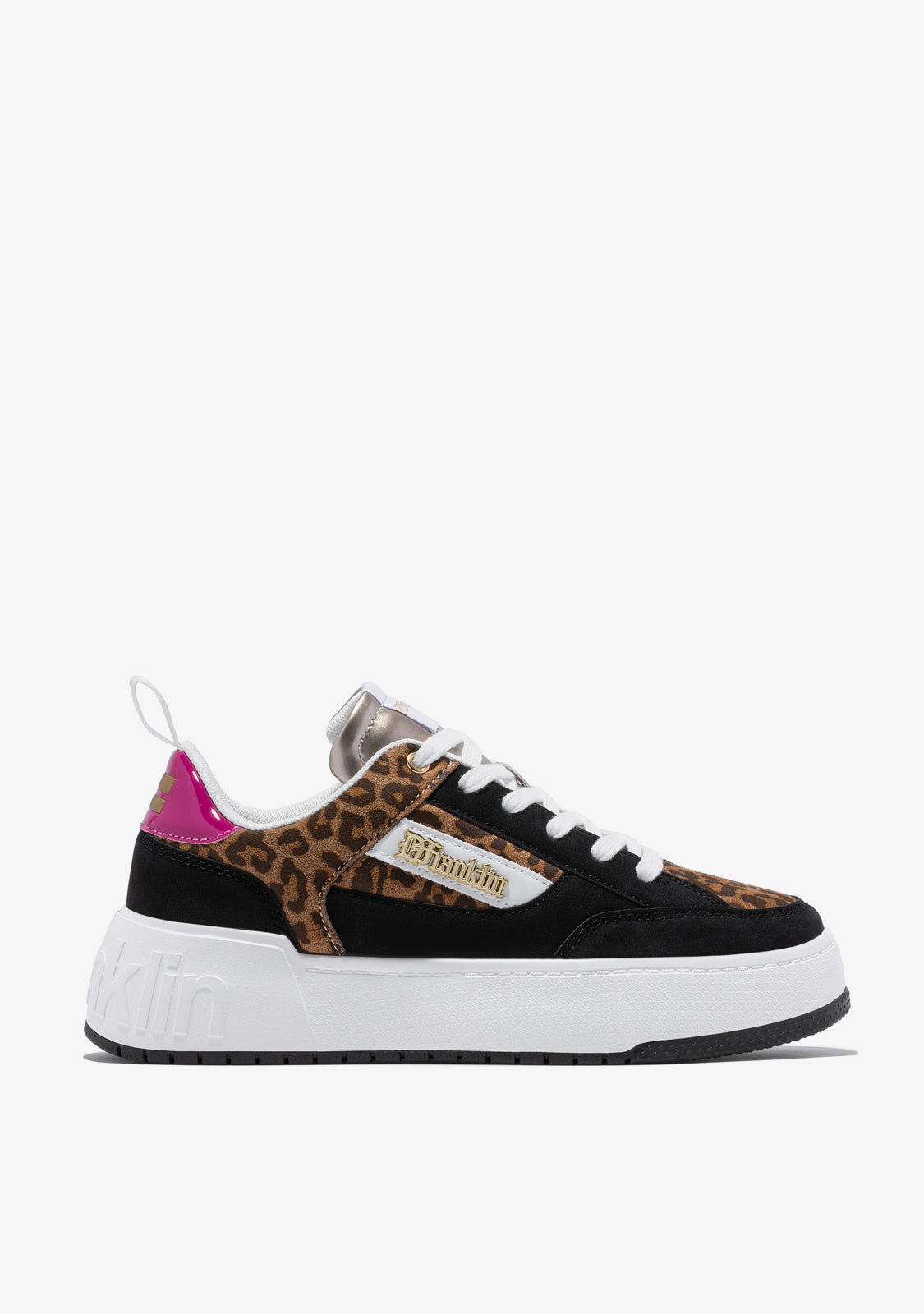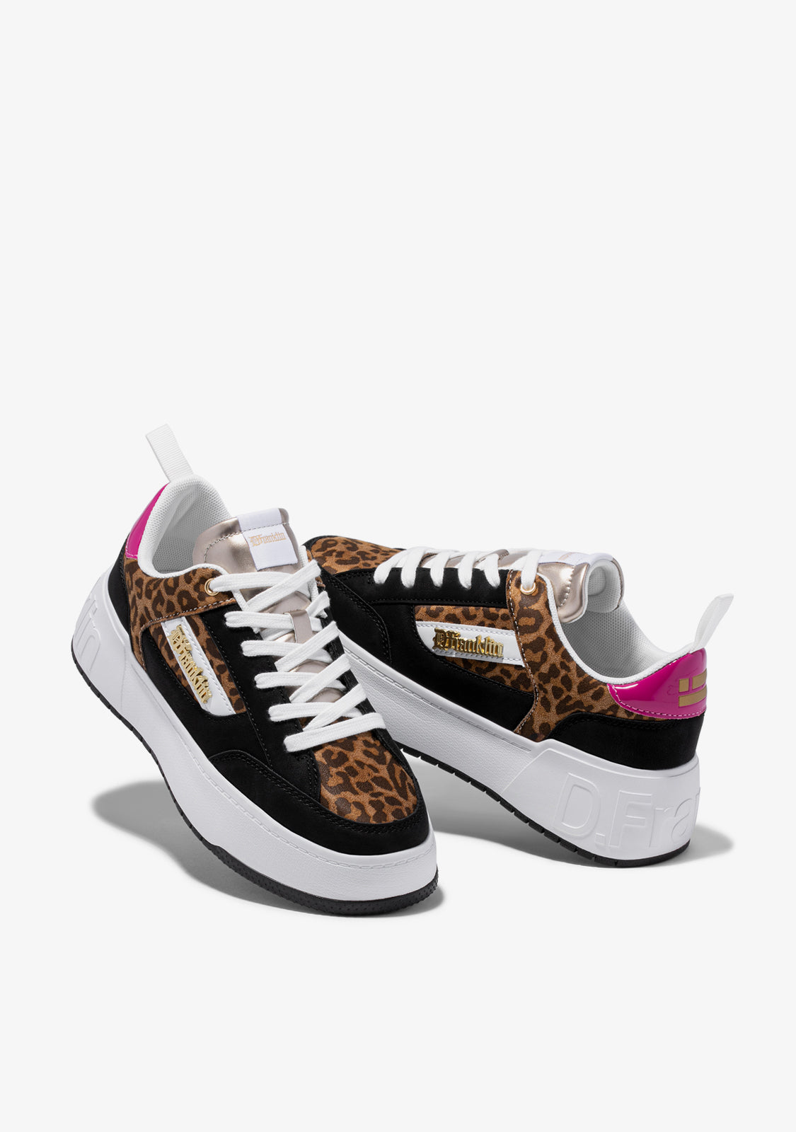 Designed to bring back the adrenaline rush of our iconic Court shoe. A model inspired by the basketball trend of the 90s. Contrast animal print on the upper and sides. Fuchsia heel and black elements. Constructed with rubber sole and synthetic vegan leather. Embossed D.Franklin logo on heel. Cotton laces. 4 cm sole.