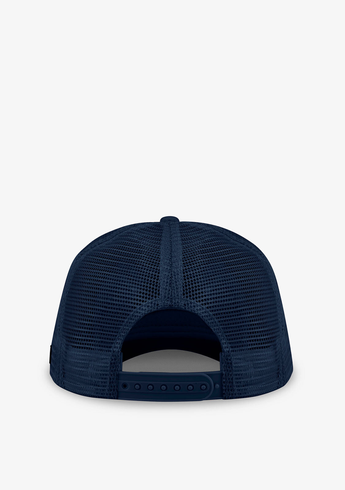 Mont Baker Cap, a baseball trucker cap, with embroidered patch on the front and breathable grille on the back. An urban style of outdoor inspiration, classic curved visor and dome in navy. A call to the classics, adapted to current trends.