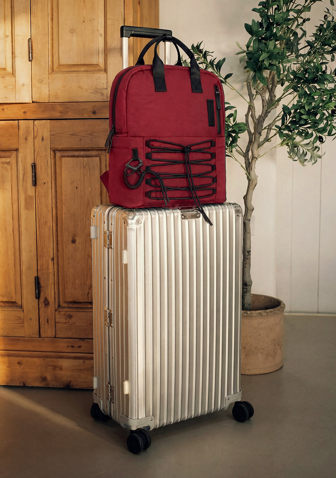 The D.Franklin multi-compartment backpack in red finish is made with technical materials that provide lightness and resistance. Its interior features a padded pocket for laptops up to 14 inches, as well as two small organiser compartments. It also has an interior strap from which you can hang your carabiner keychain located on the front.
