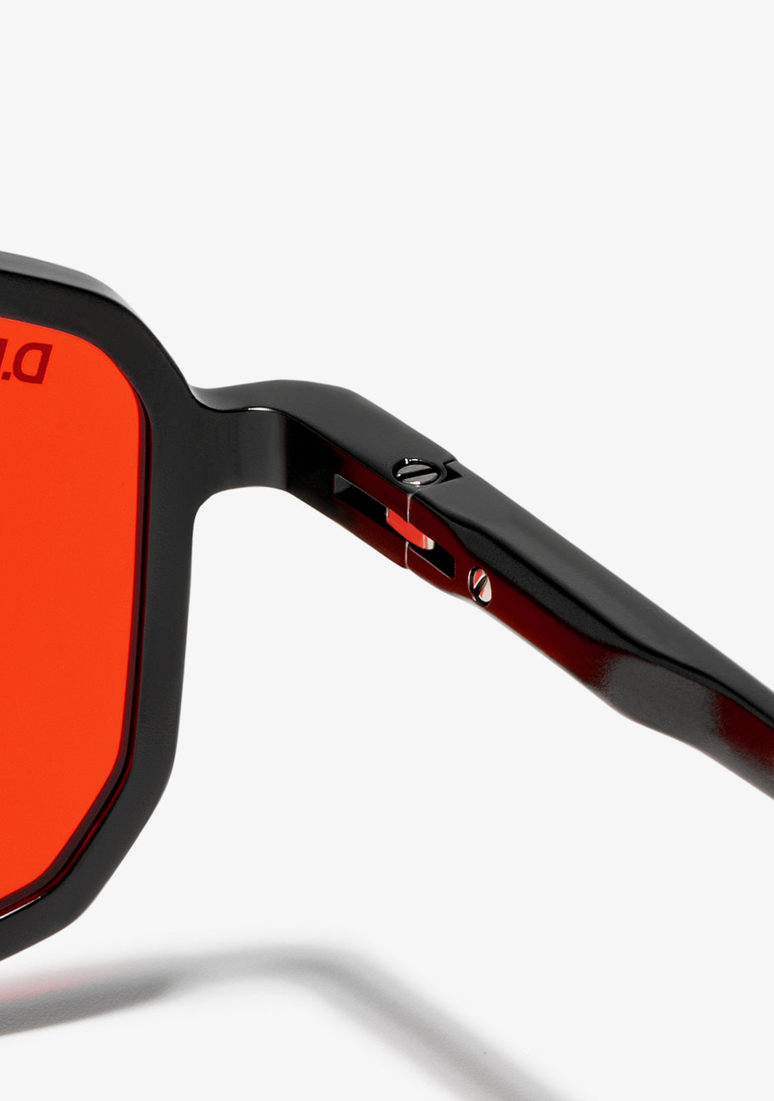 Thanks to their aluminium construction, these glasses are ultra-lightweight. They feature red polarized lenses and a matte black frame for a distinctive aesthetic. The design features our emblem on the right lens and a metallic logo on the side of the temples. It has a 143 mm front frame and a lens width of 52 mm, which fits most faces. The temples are 138 mm long.
