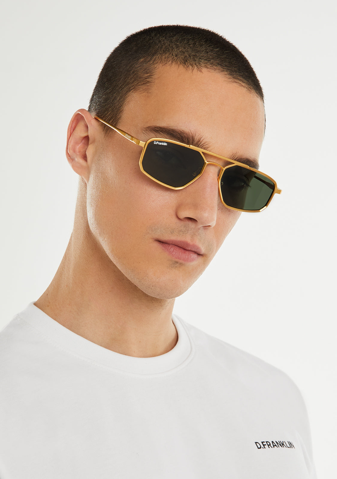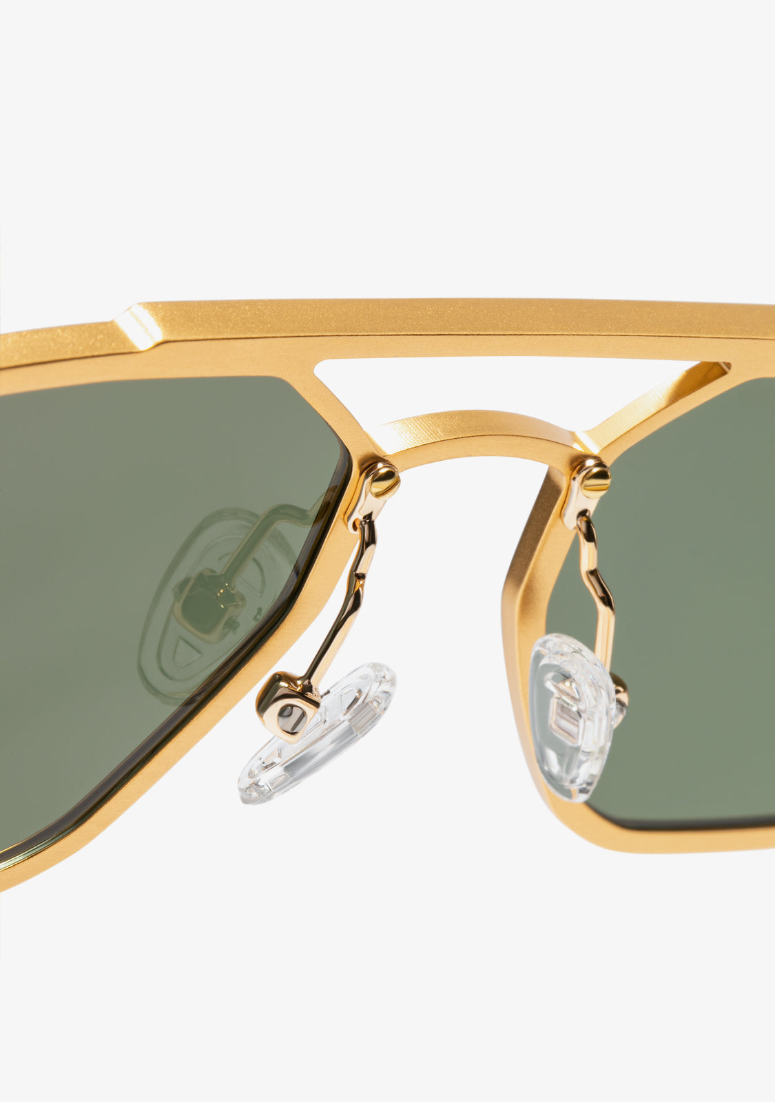 Thanks to their aluminium construction, these glasses are ultra-lightweight. They feature green polarised lenses and a matte gold frame for a distinctive aesthetic. The design features our emblem on the right lens and metallic logo on the side of the temples. It has a 143 mm front frame and a lens width of 52 mm, which fits most faces. The temples are 138 mm long.