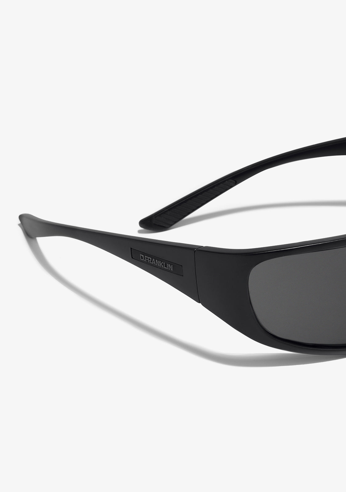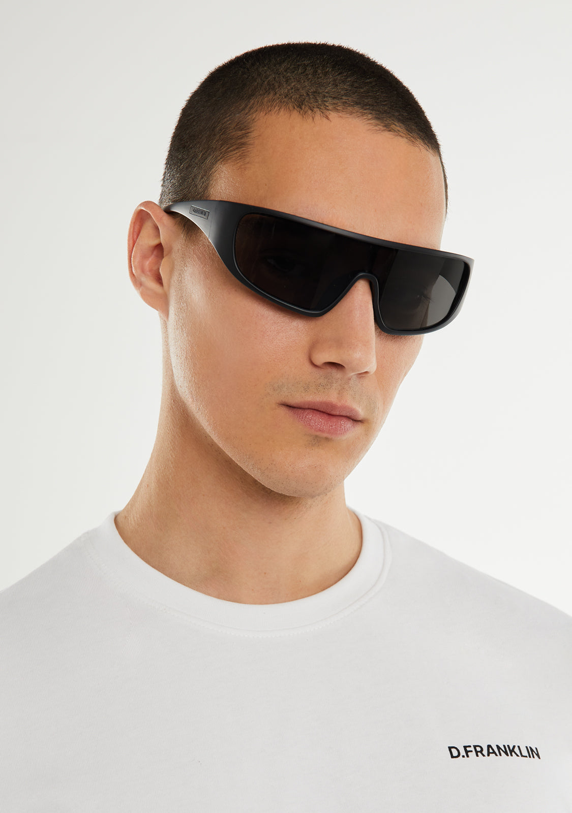 This model features a black matte finish frame with a curved aesthetic. It features smoke-tinted lenses and our signature emblem on the side of the temples. The uniform 131mm lens width and 145mm front frame are joined by a 130mm temple.