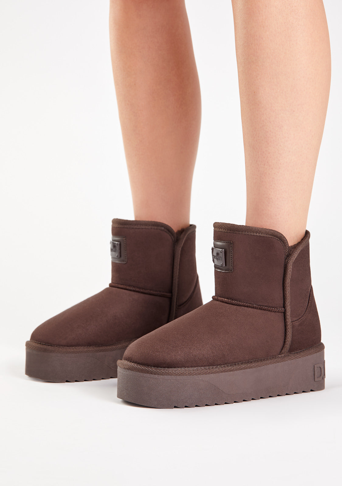 Asymmetrical cut design in brown tone with synthetic inner lining for superior warmth.