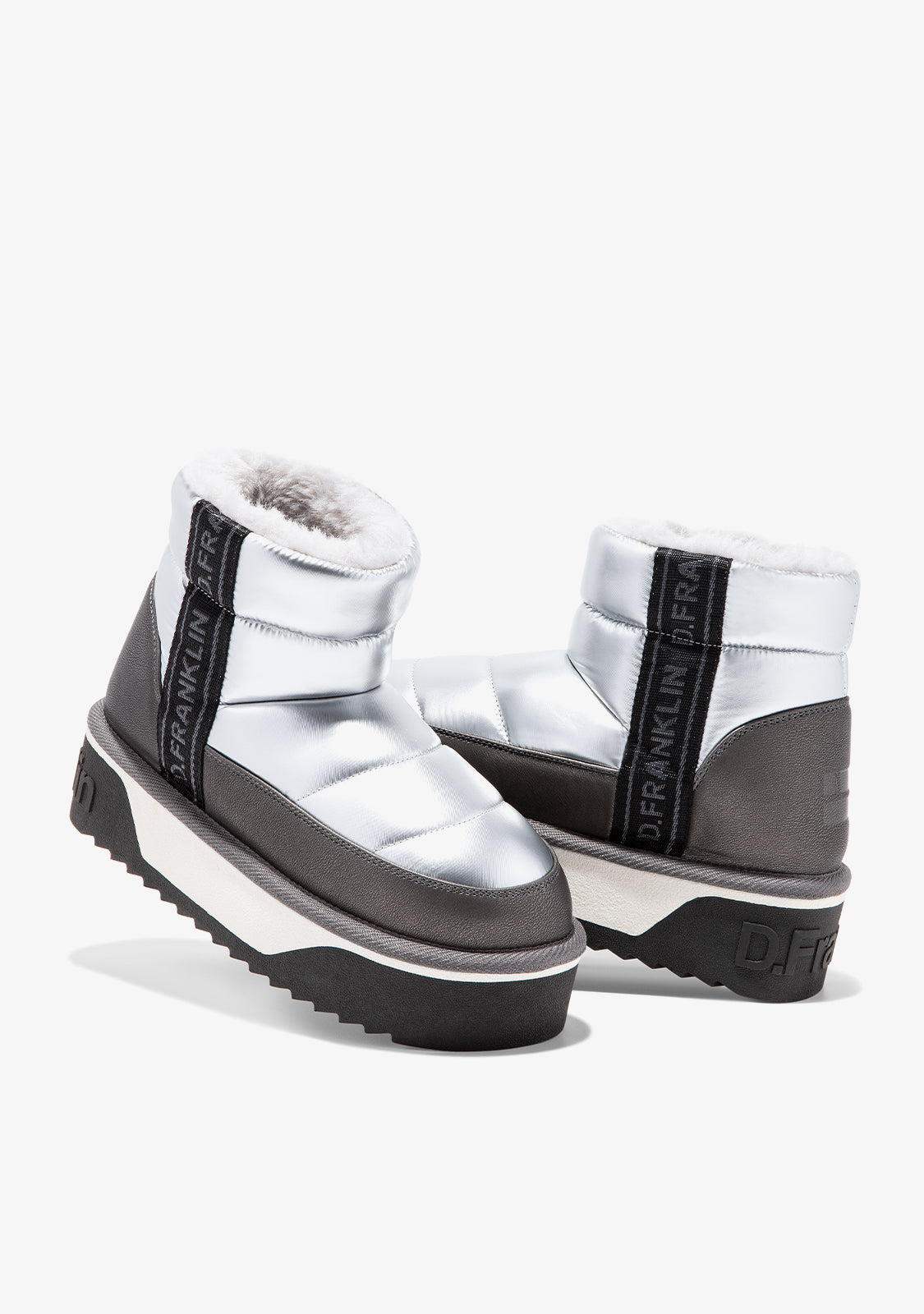 Straight-cut shaft design in silver tones and synthetic inner lining for superior warmth.