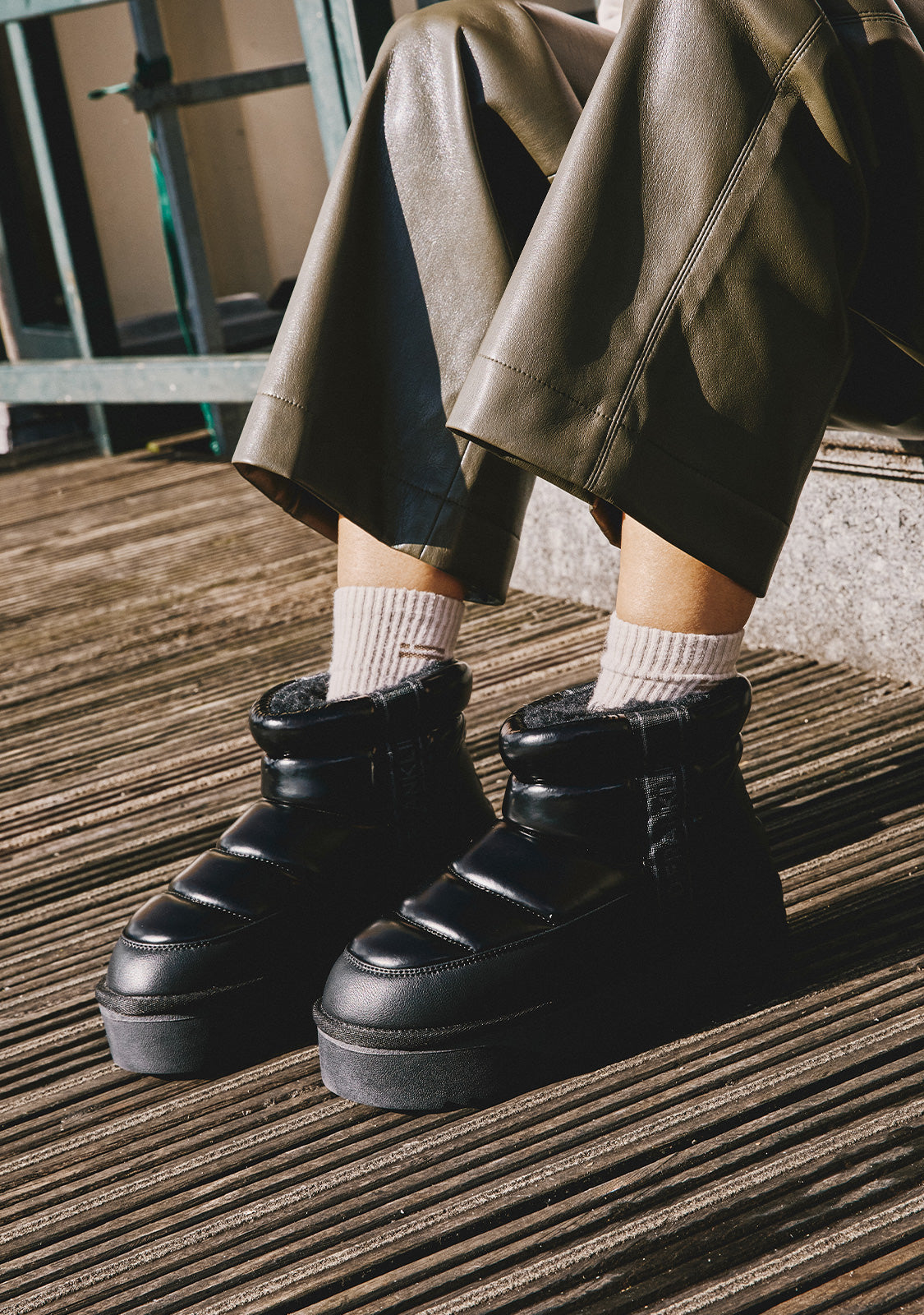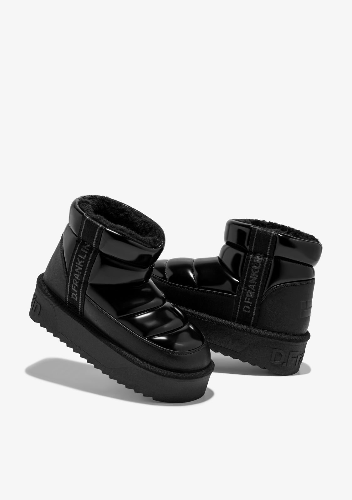 Straight-cut shaft design in dark tones, shiny aesthetic, and synthetic inner lining for superior warmth.