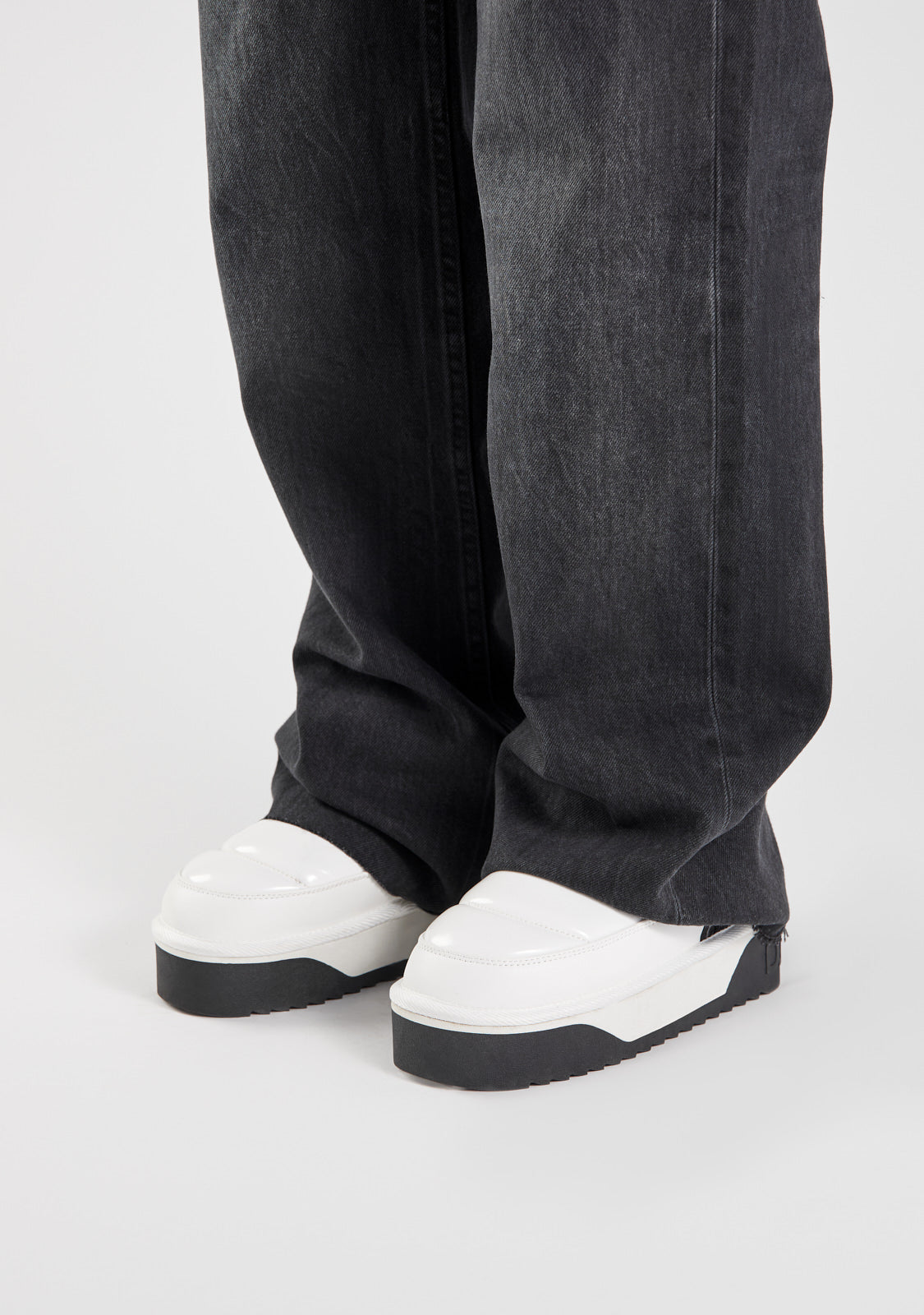 Straight-cut shaft design in white tones, shiny aesthetic, and synthetic inner lining for superior warmth.