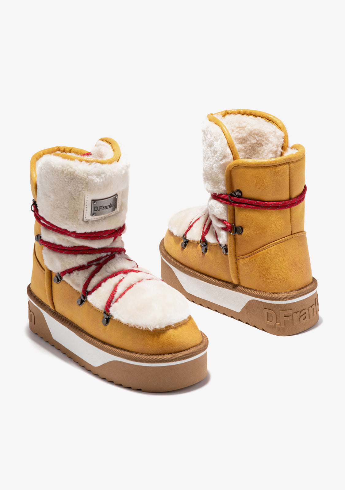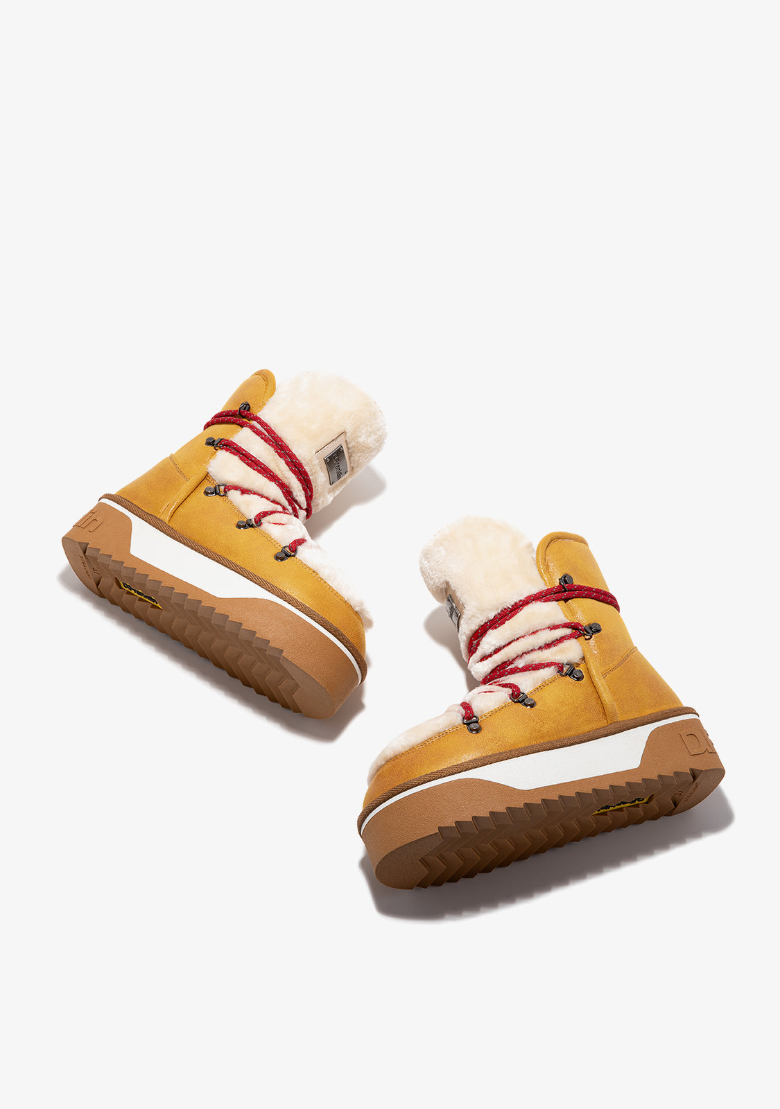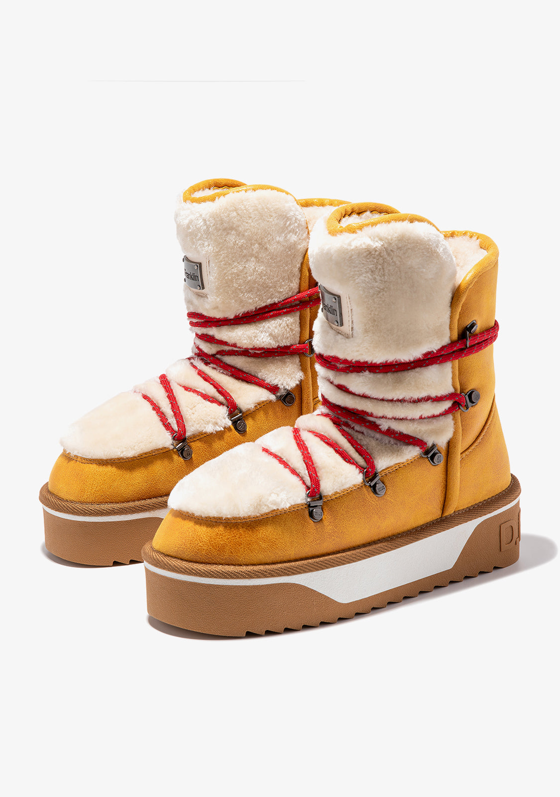 These mustard boots feature high-quality microfibre fabric. The redesigned sole provides a lighter weight for a more comfortable ride. It also features our custom heel badge. Multi-position mountain-style laces provide optimal support and reflective detailing. Plus, a faux fur lining adds the ultimate winter touch.