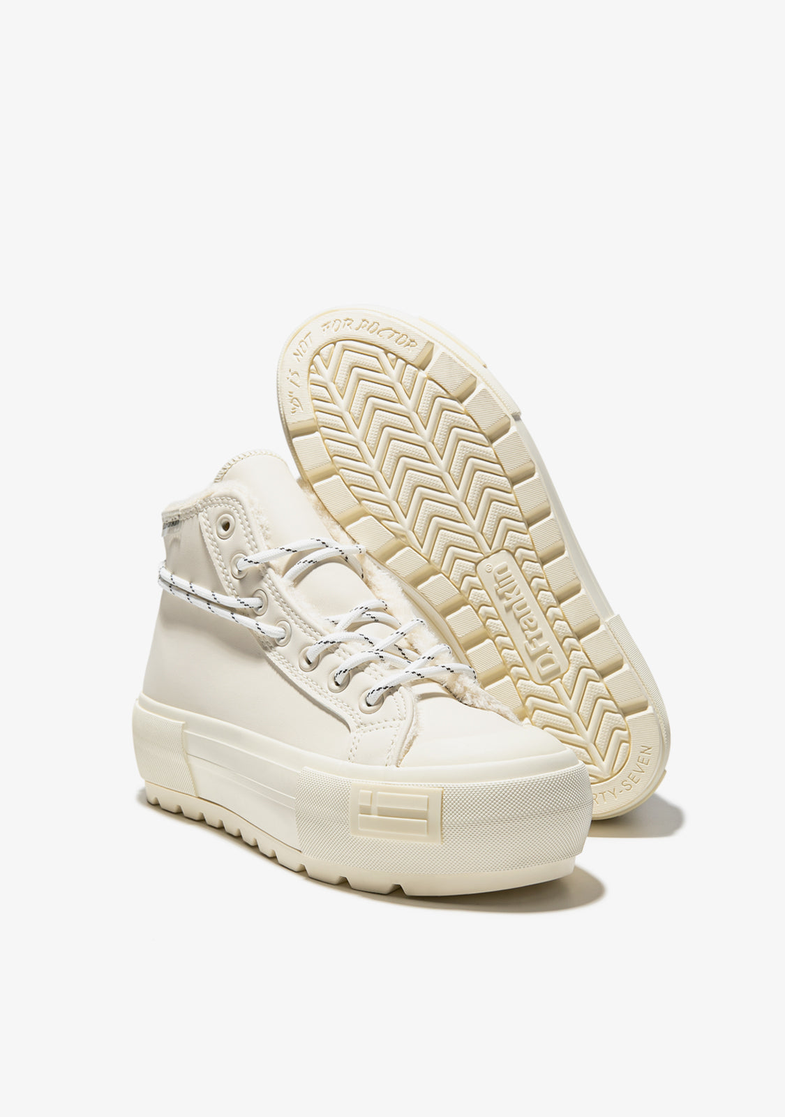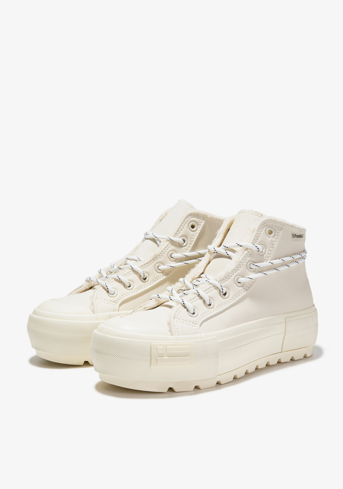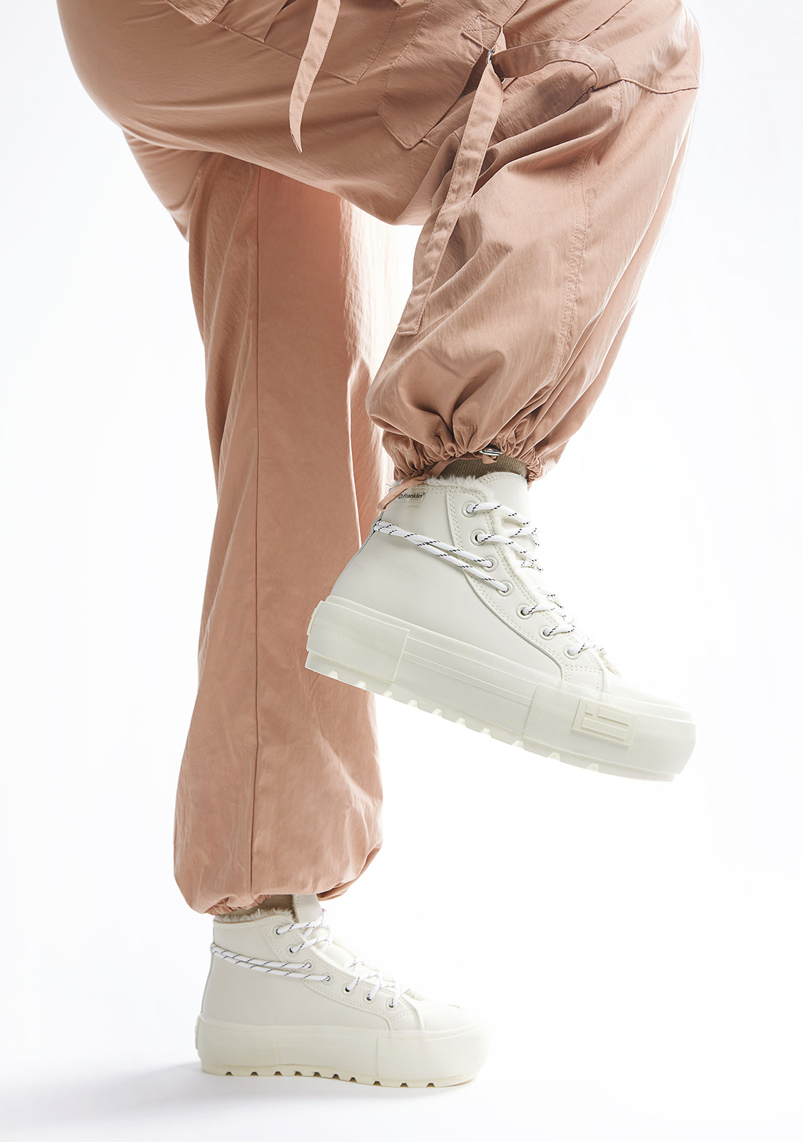 Our fur inside sneakers fuse comfort and warmth in a beige-toned bootie. Multi-position laces for urban aesthetics and a perfect fit. The 5cm sole features our emblem on both the heel and forefoot.