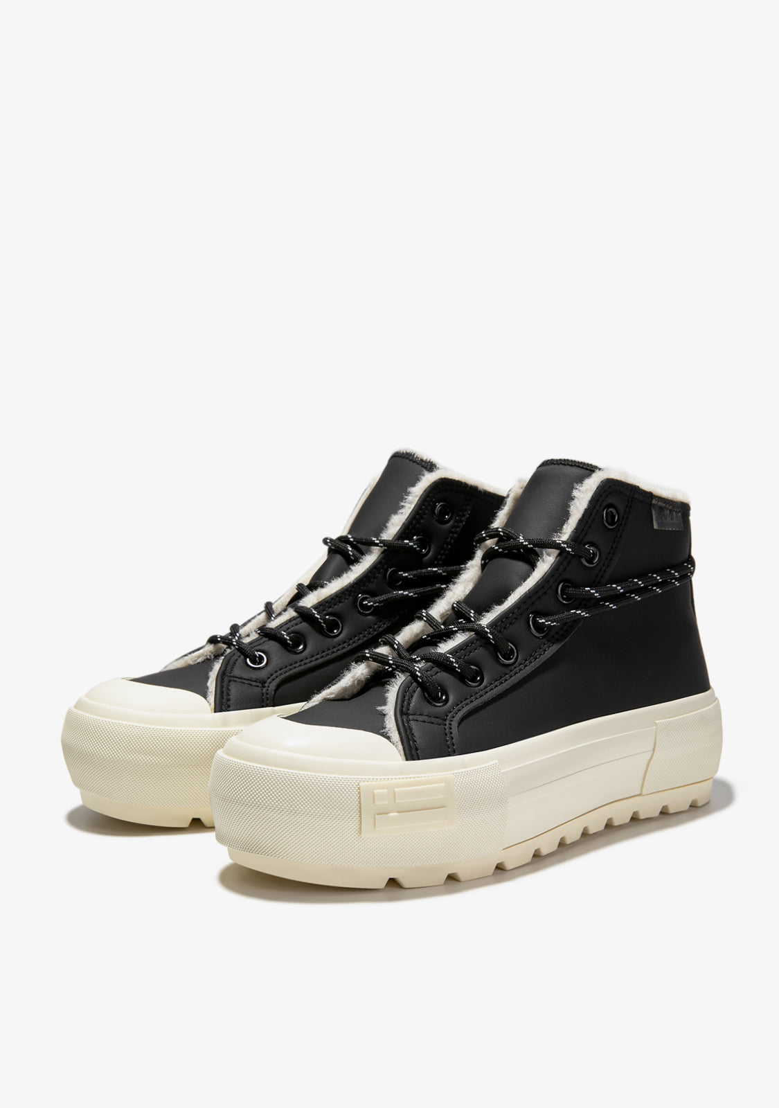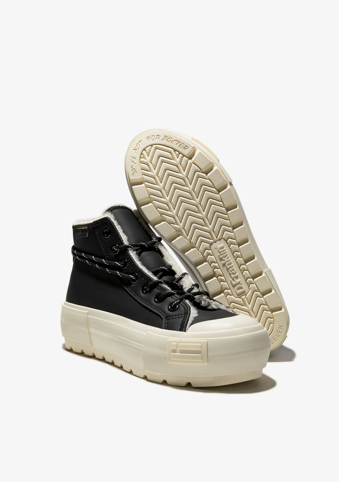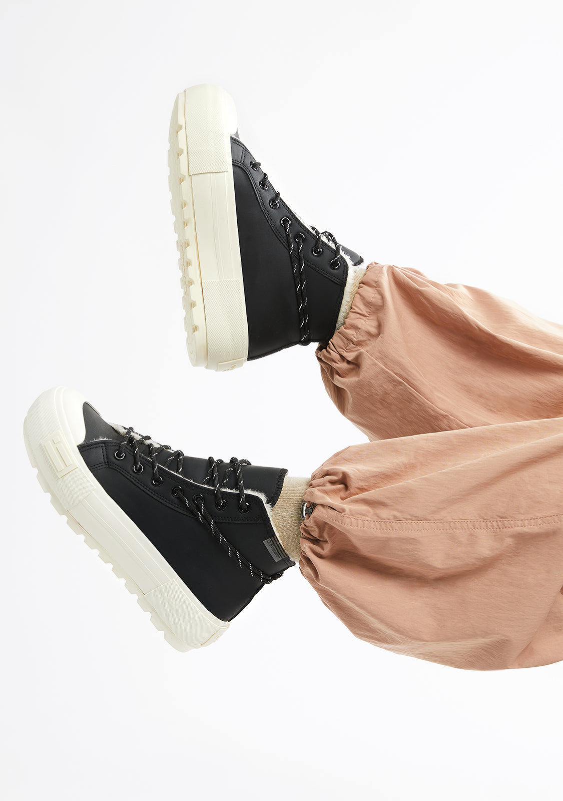 Our fur inside sneakers fuse comfort and warmth in a black ankle boot. Multi-position laces for urban aesthetics and a secure fit. The 5cm sole features our emblem on both the heel and forefoot.
