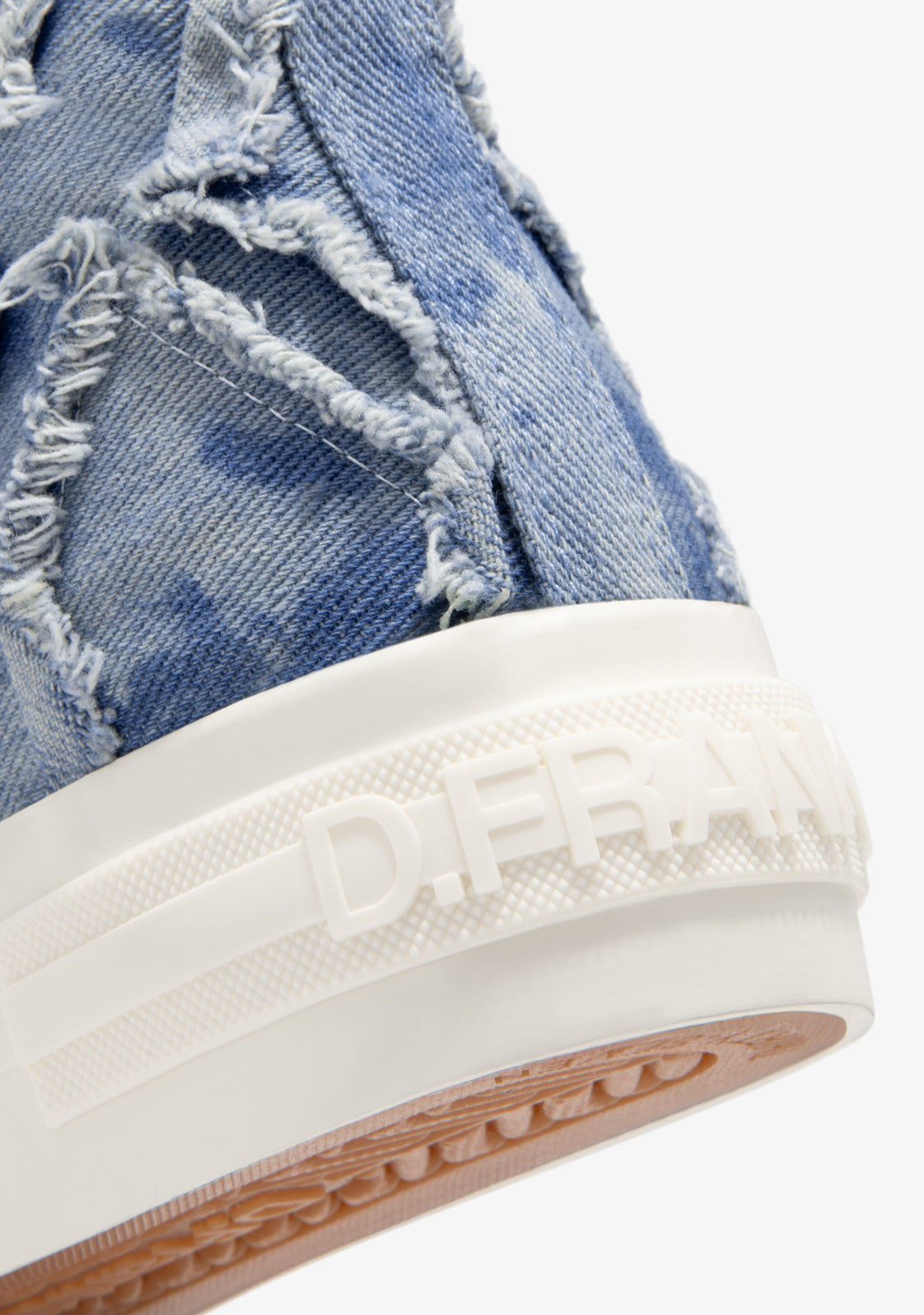 This high-cut model features a frayed look in a blue hue and denim texture. The white rubber sole is 4cm high. It also features personalised lettering on the heel.