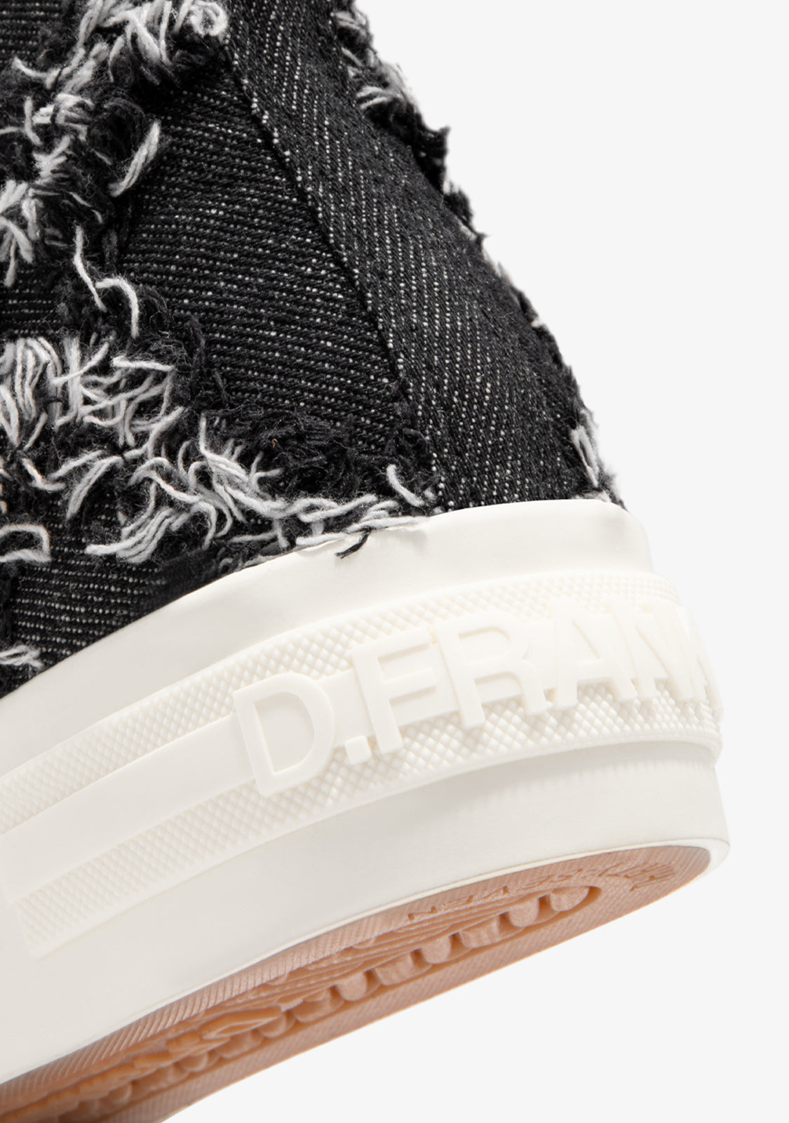 This high-cut model features a frayed look in black and denim texture. The white rubber sole is 4cm high. It also features personalised lettering on the heel.