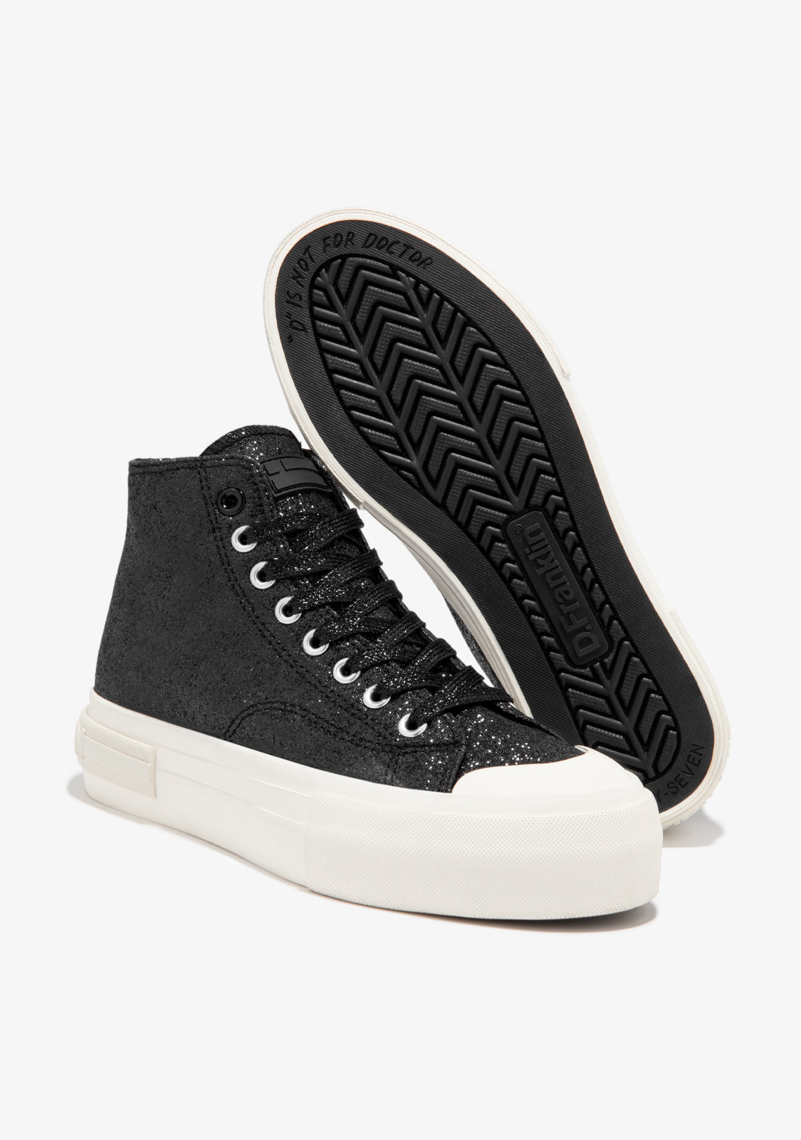 This high-cut model features a shiny black aesthetic. The white rubber sole is 4cm high. It also features personalised lettering on the heel.