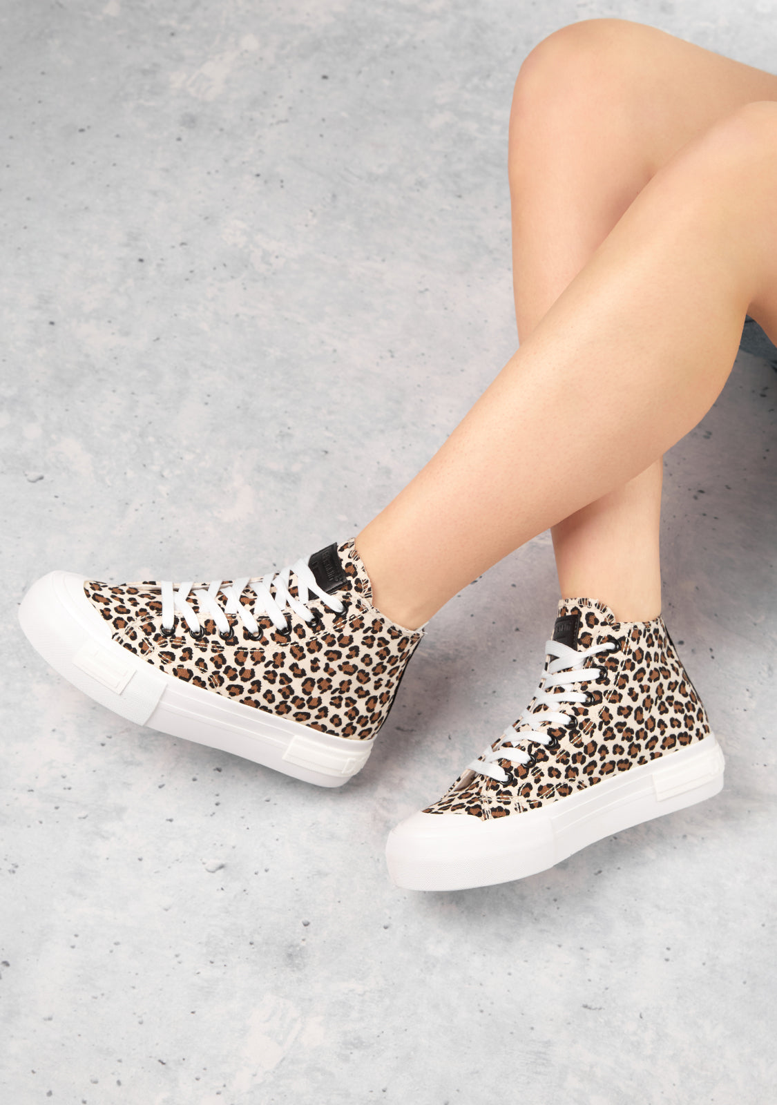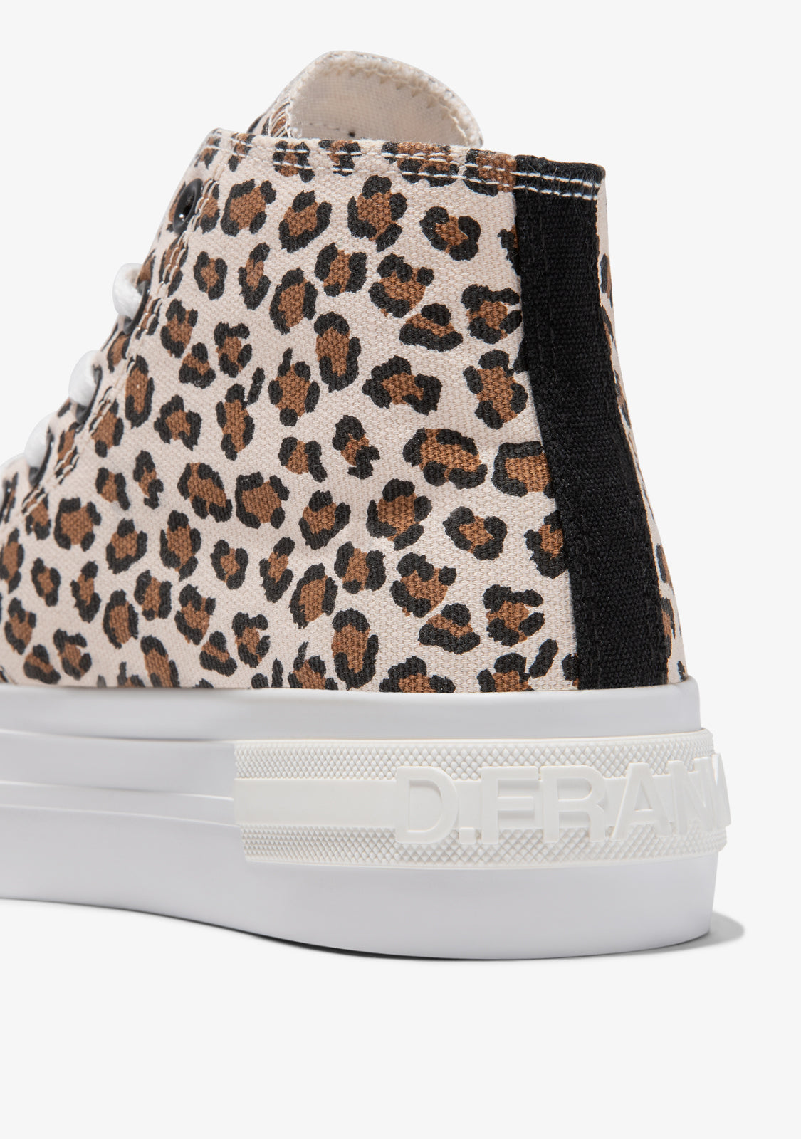 This ankle boot is made of canvas textile with a leopard print. White rubber sole and personalised lettering on the heel. It has a height of 4 cm and features our flag emblem on the side.