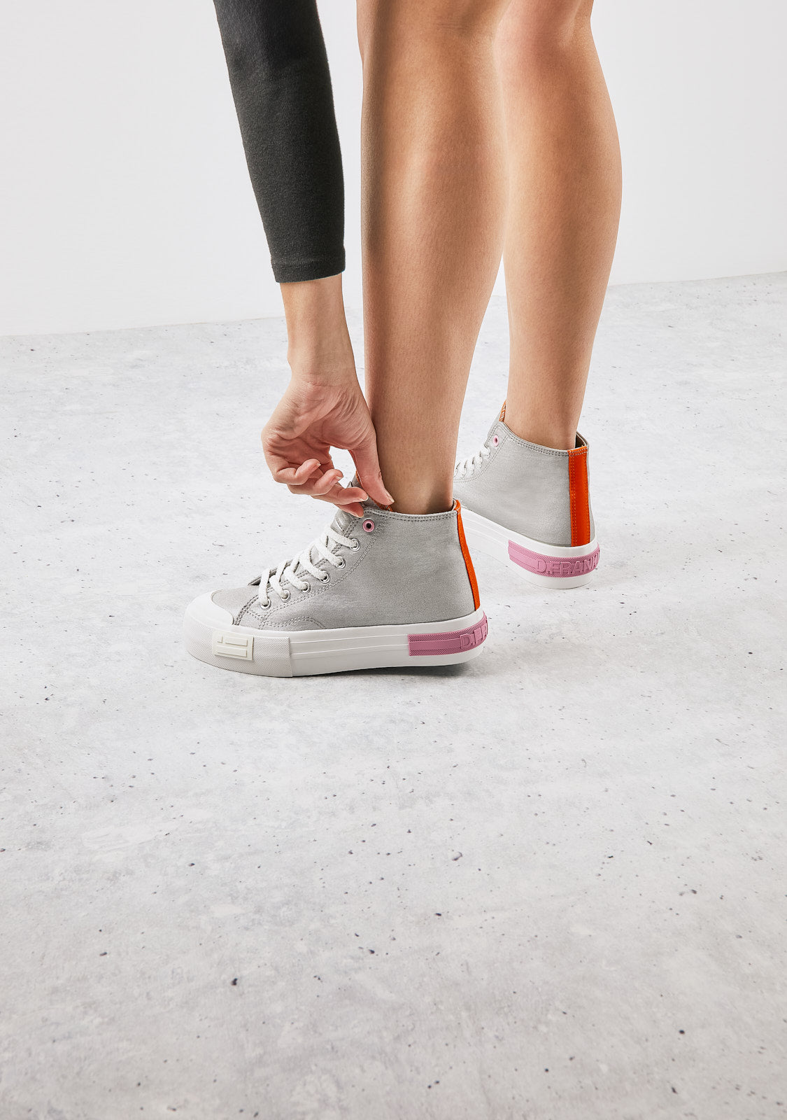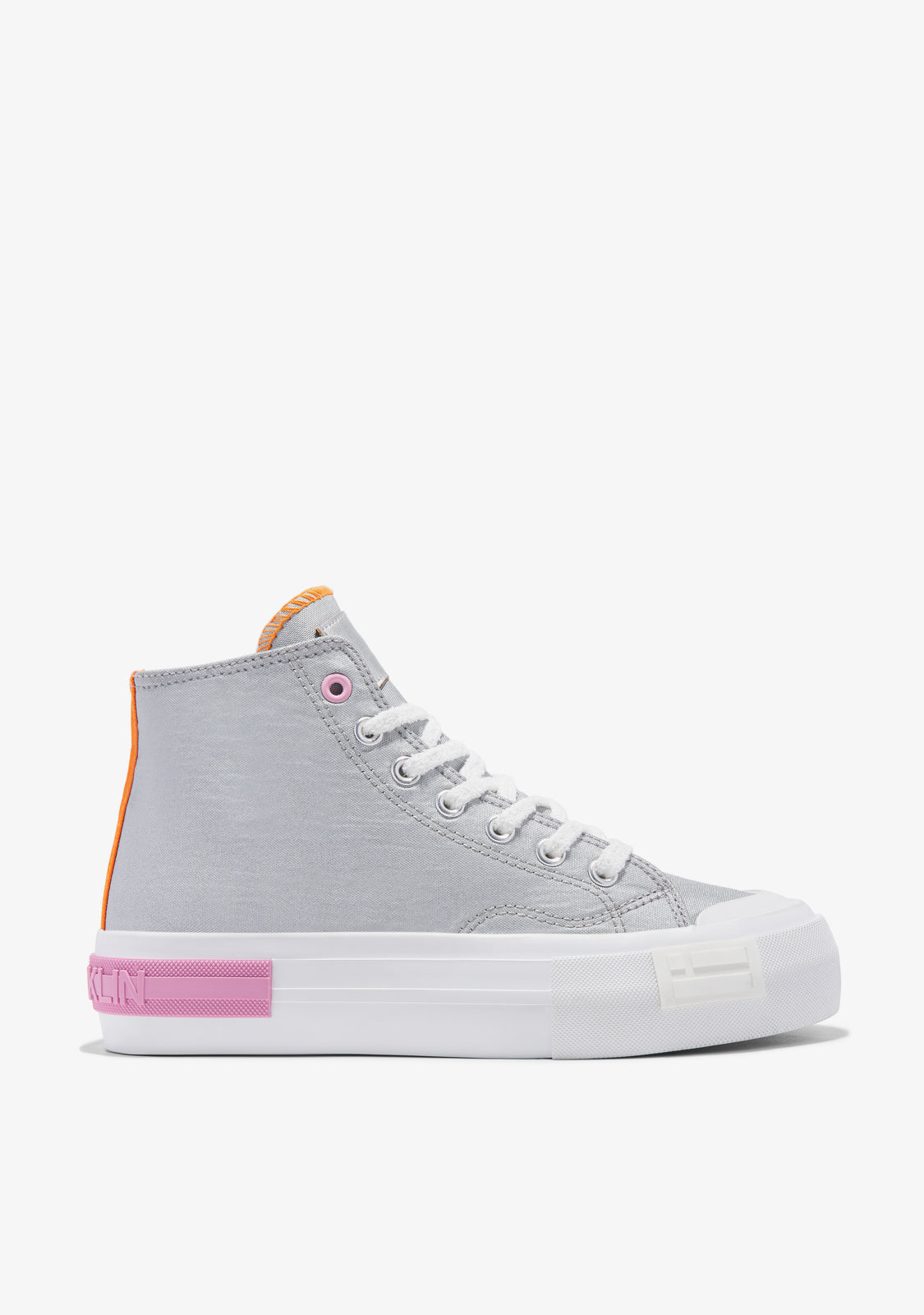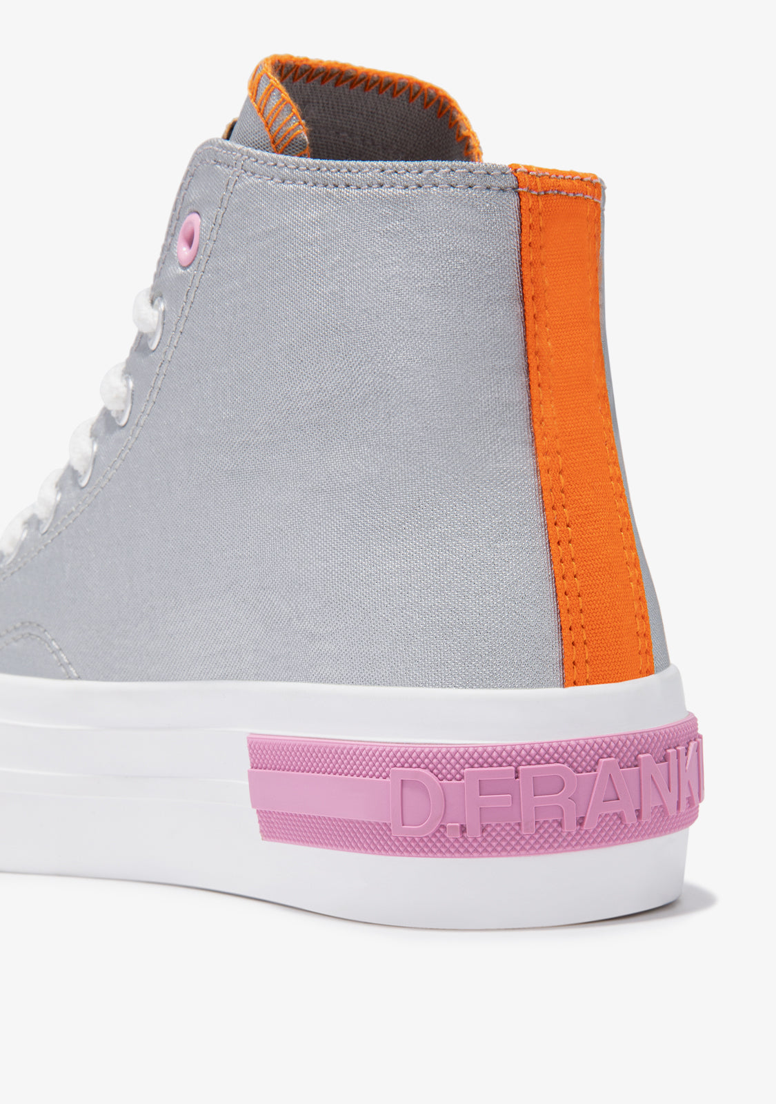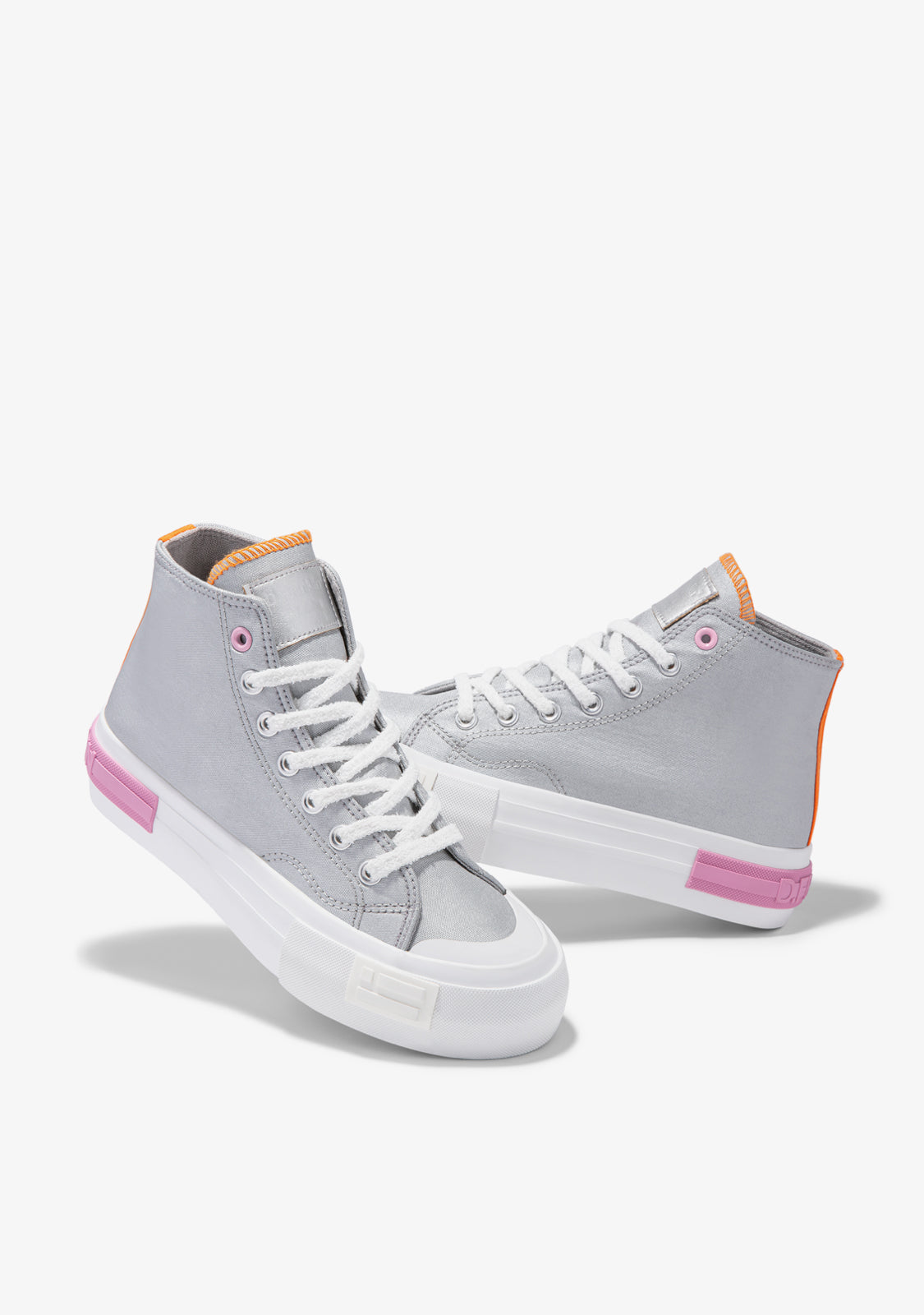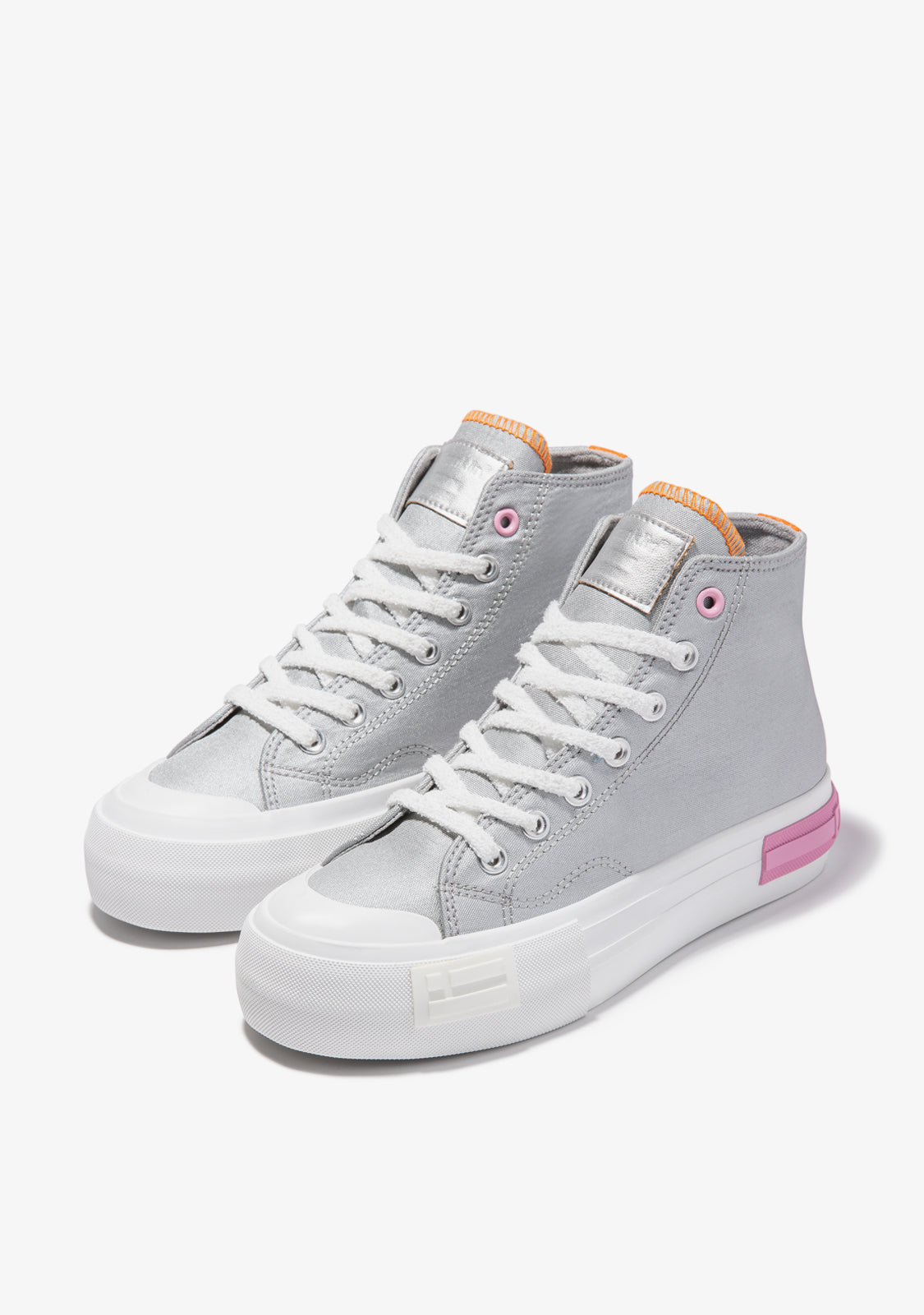 Our silver One Way design is made of canvas textile . White rubber sole and pink lettering detail. Featuring a 4cm height and our flag emblem on the side.
