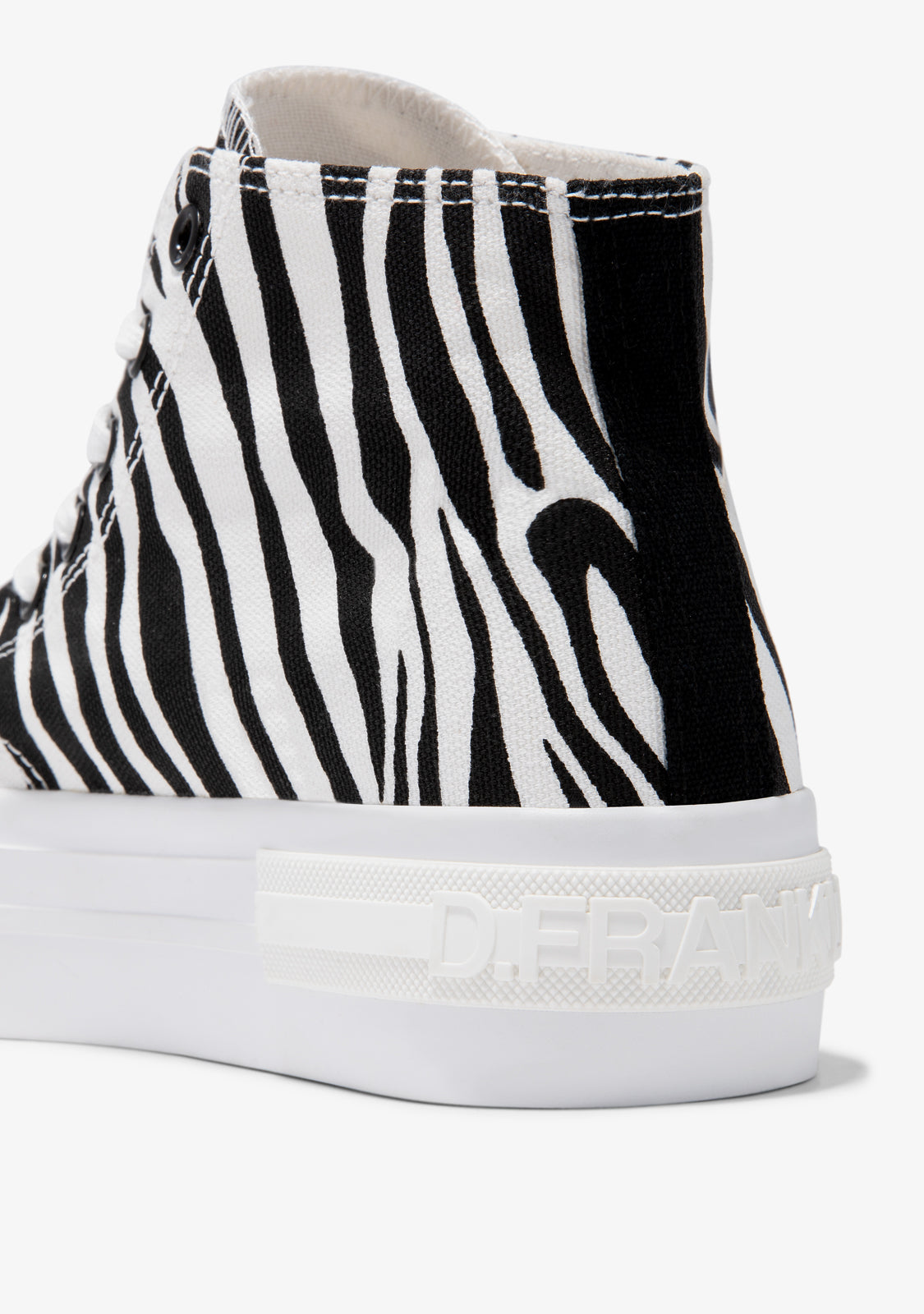 This ankle bootis made of canvas textile with a zebra pattern. White rubber sole and personalised lettering on the heel. It has a height of 4 cm and features our flag emblem on the side.