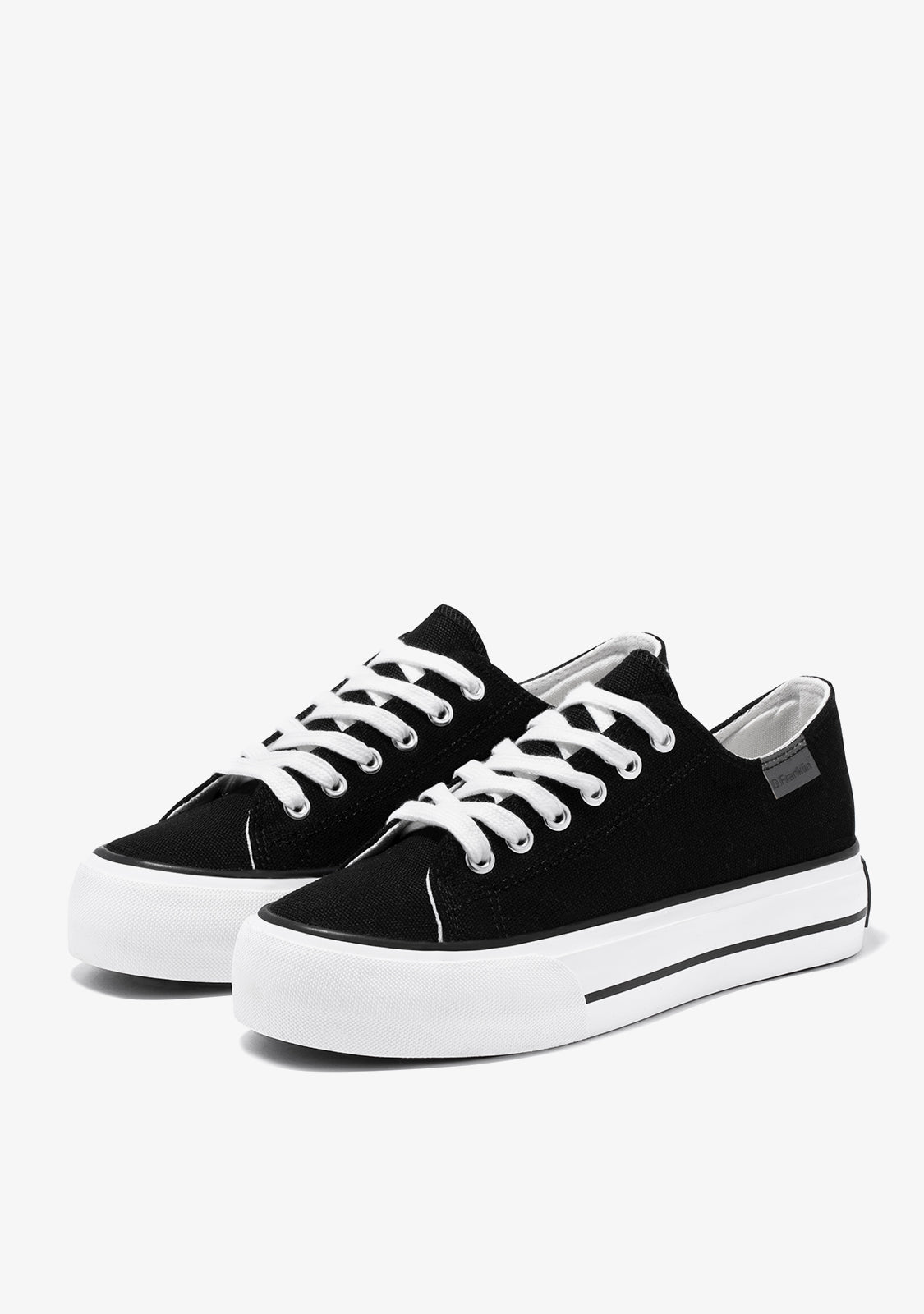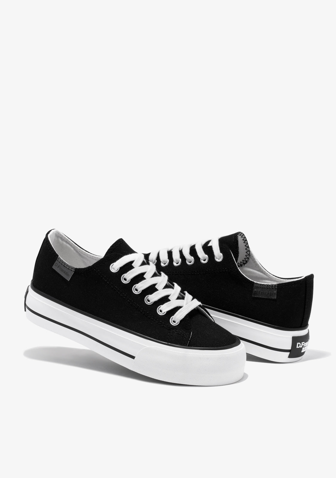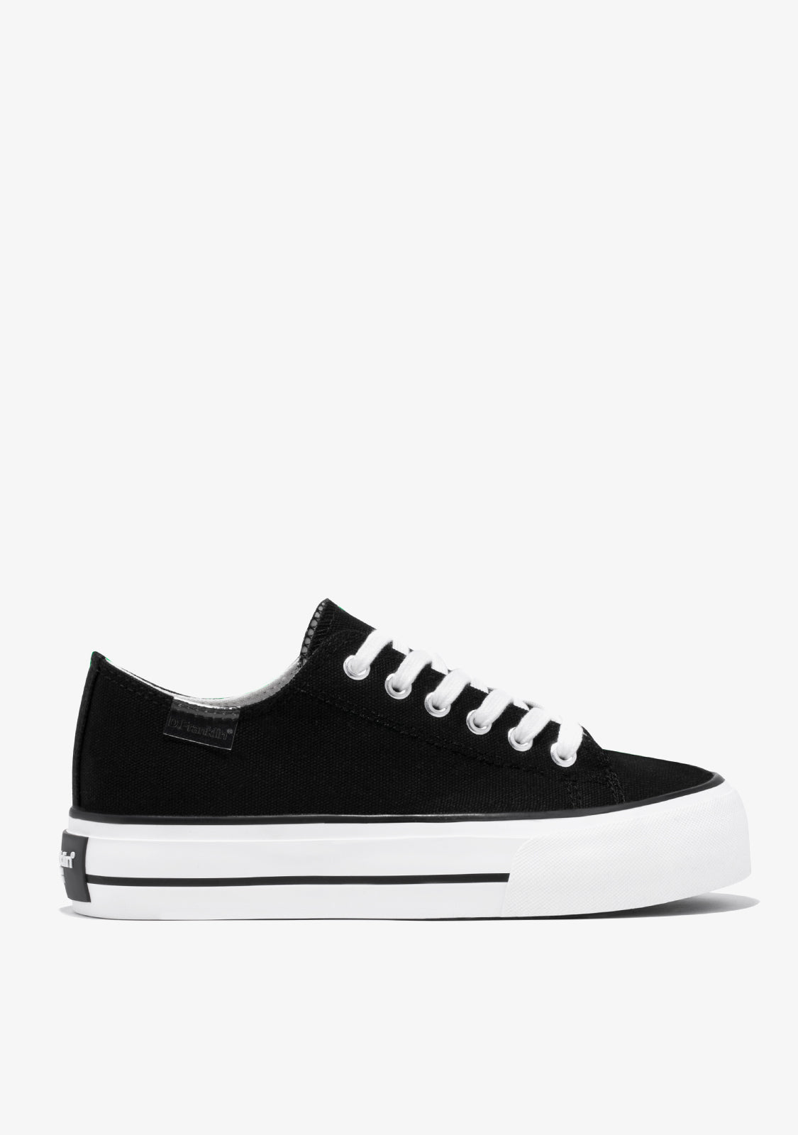 A new way to create your path. Inspired by the classic One Way low-cut trainer, with a timeless essence. Designed with recycled textile in black. Constructed with an extra-light 4cm white sole. Black embossed logo at heel. White cotton laces with white laces on top of white laces.