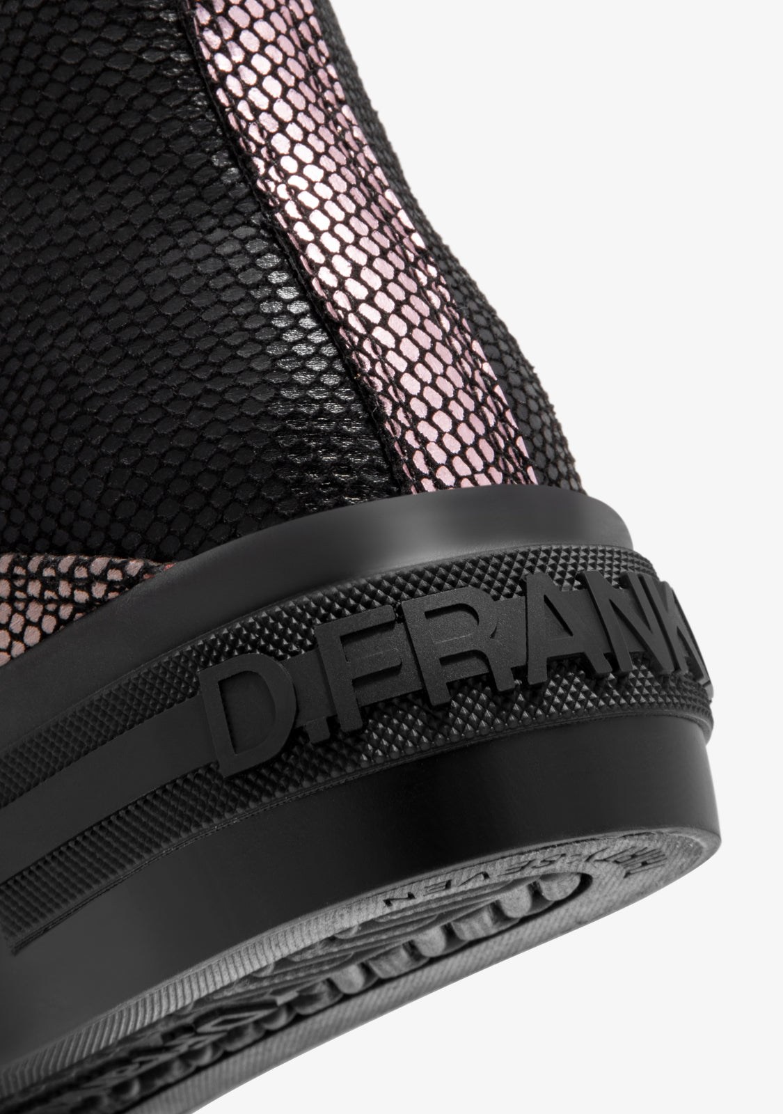 This high-cut model features a glossy finish aesthetic combined in different dark colours. The black rubber sole is 4cm high. It also features personalised lettering on the heel.