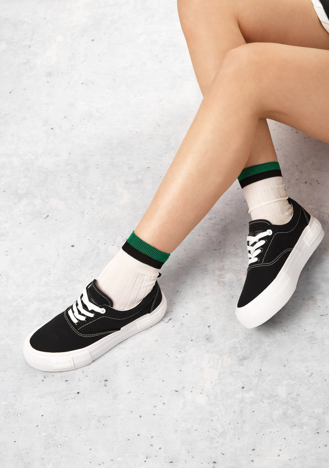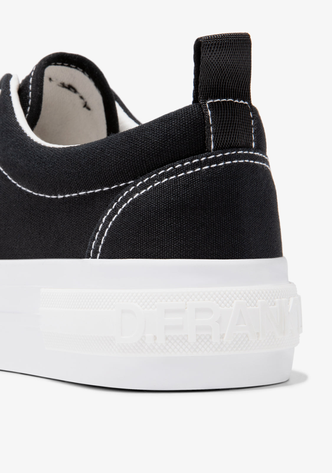 Our black One Way designis made of canvas textile . White rubber sole, padded collar and custom lettering on the heel. Featuring a 4cm height and our flag emblem on the side.