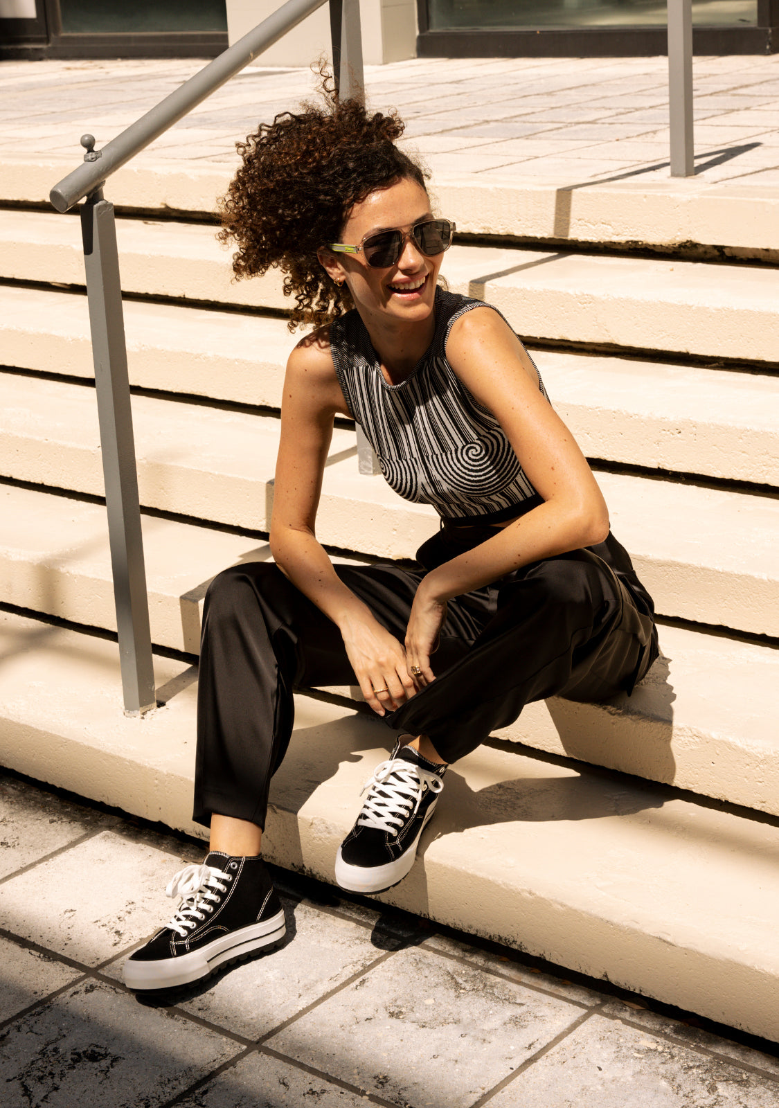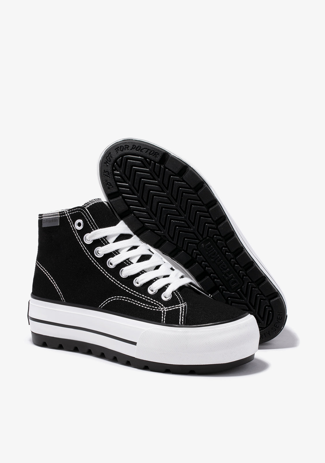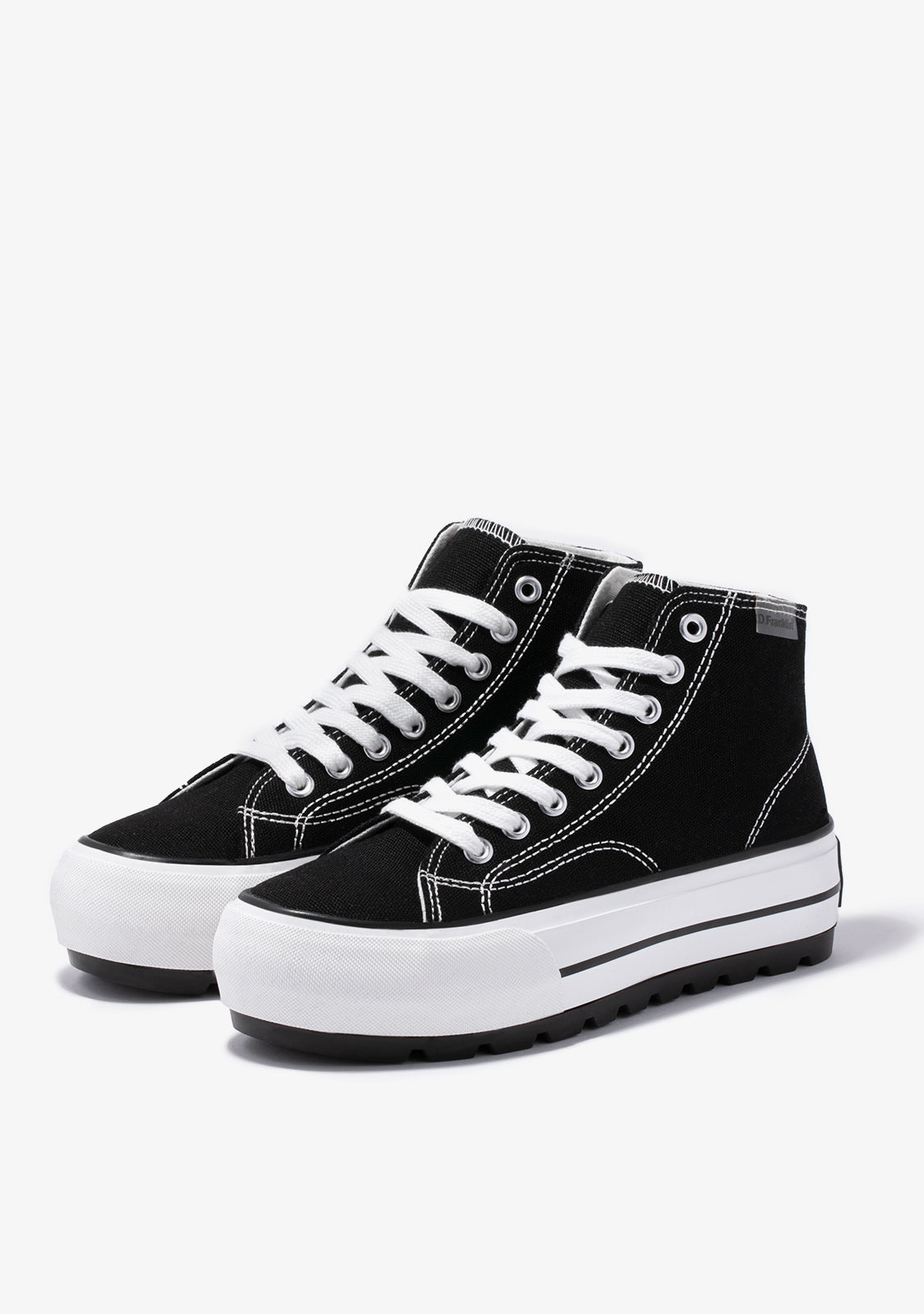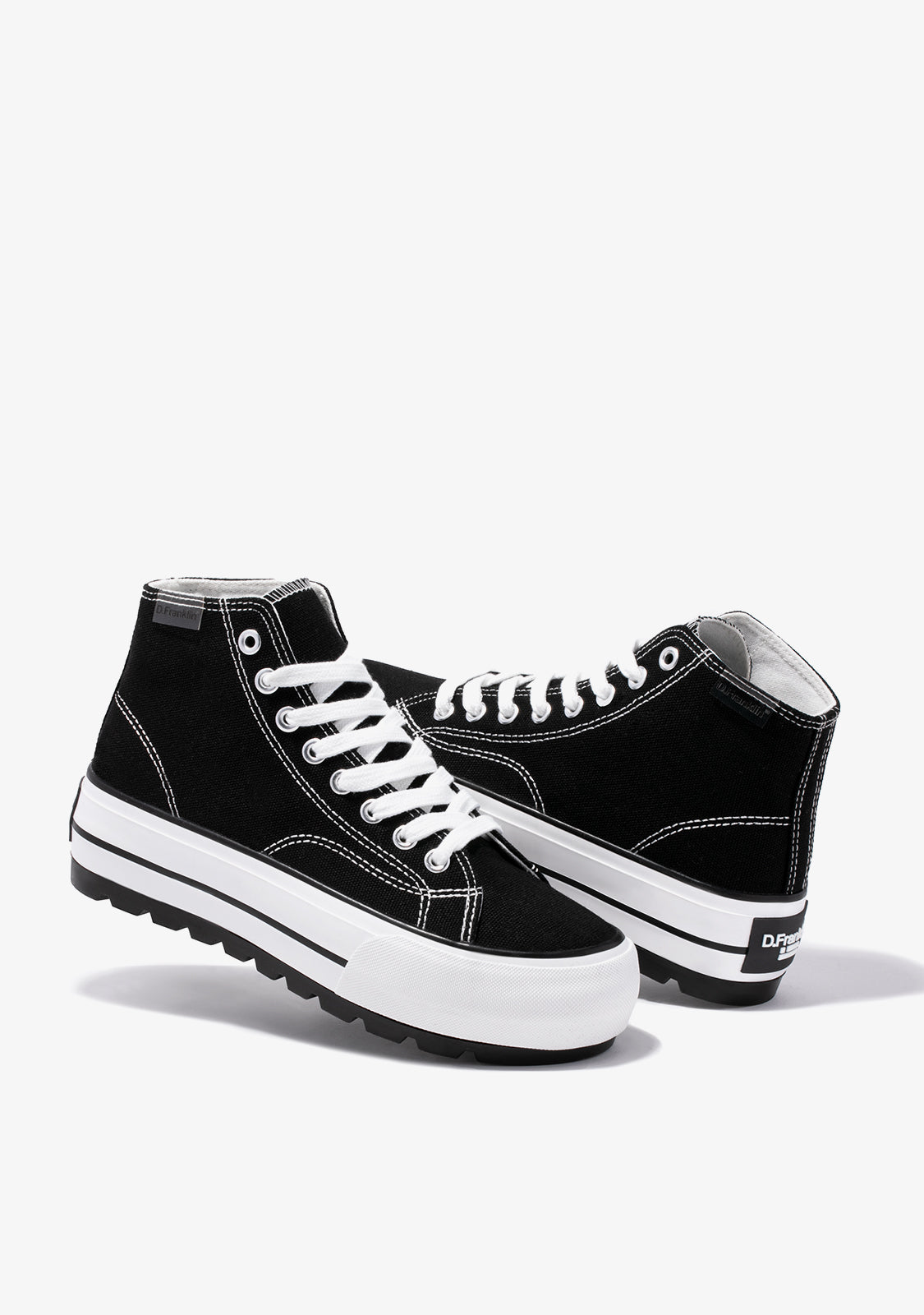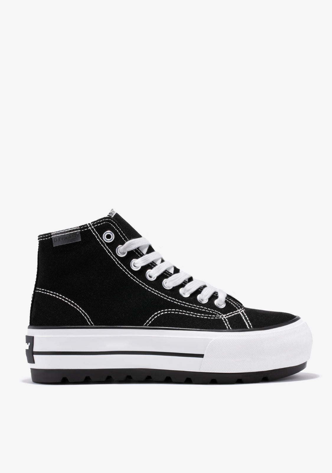A new way to create your path. Inspired by the classic One Way high top trainers, with a timeless essence. Designed with recycled textile in black with white laces. Constructed with a lightweight 5cm extra grip white sole. Black embossed logo on the heel.