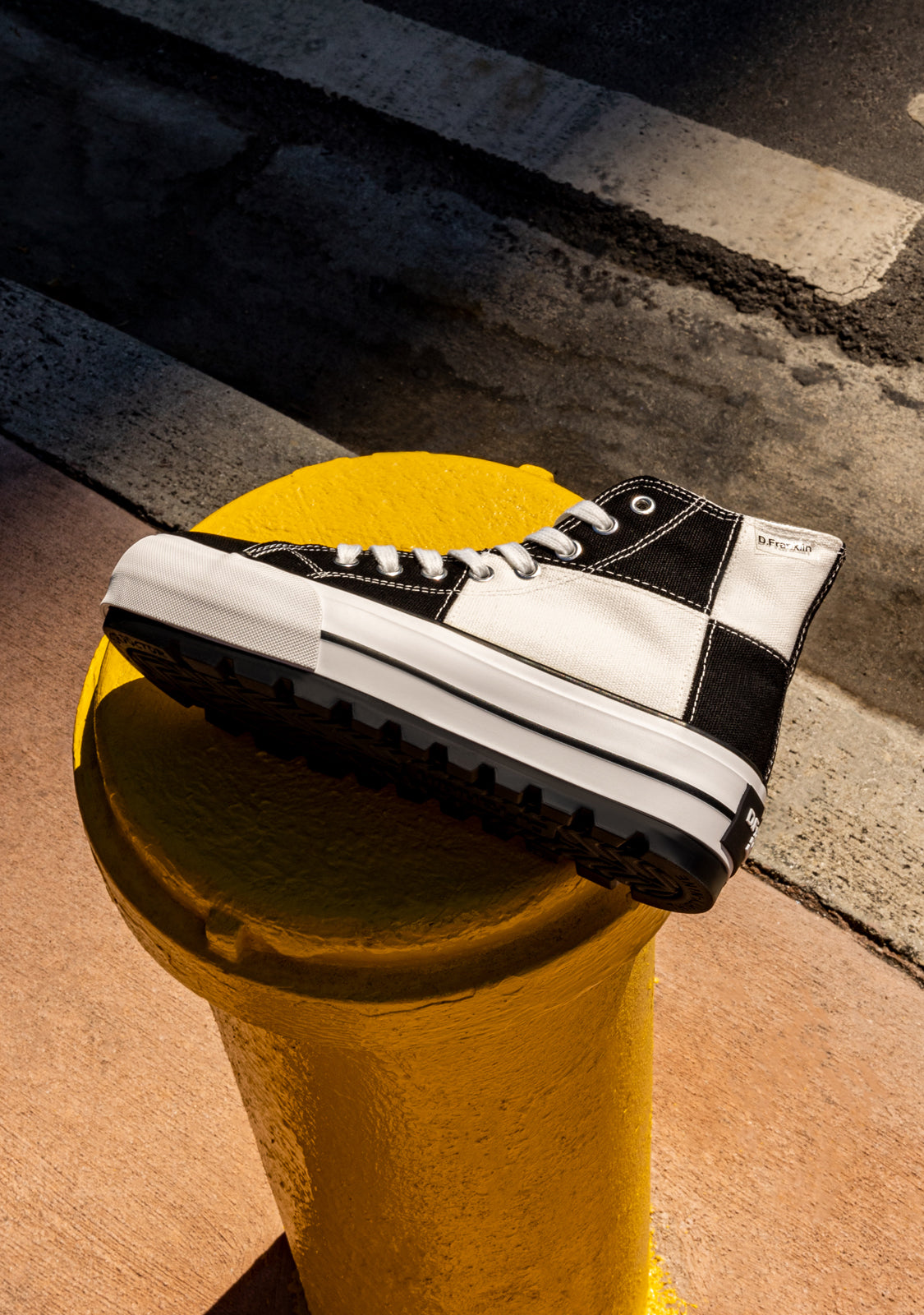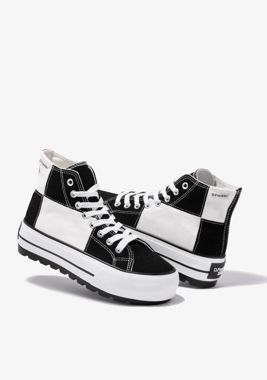A retro take on the classic One Way high top trainer. Designed in a black and white check pattern. Constructed with a 5cm extra grip lightweight white sole. Black embossed logo on the heel. White cotton laces.