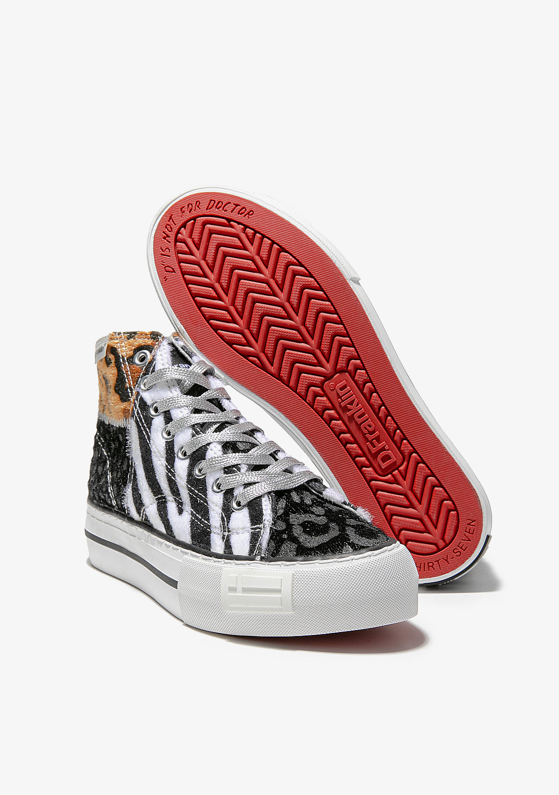 This model is constructed in synthetic leather with a combination of animal print. Zebra and leopard prints make up this ankle boot design. White monochrome 4cm rubber sole with D.Franklin emblem on the side and lettering on the heel. Injected EVA thermoformed insole.
