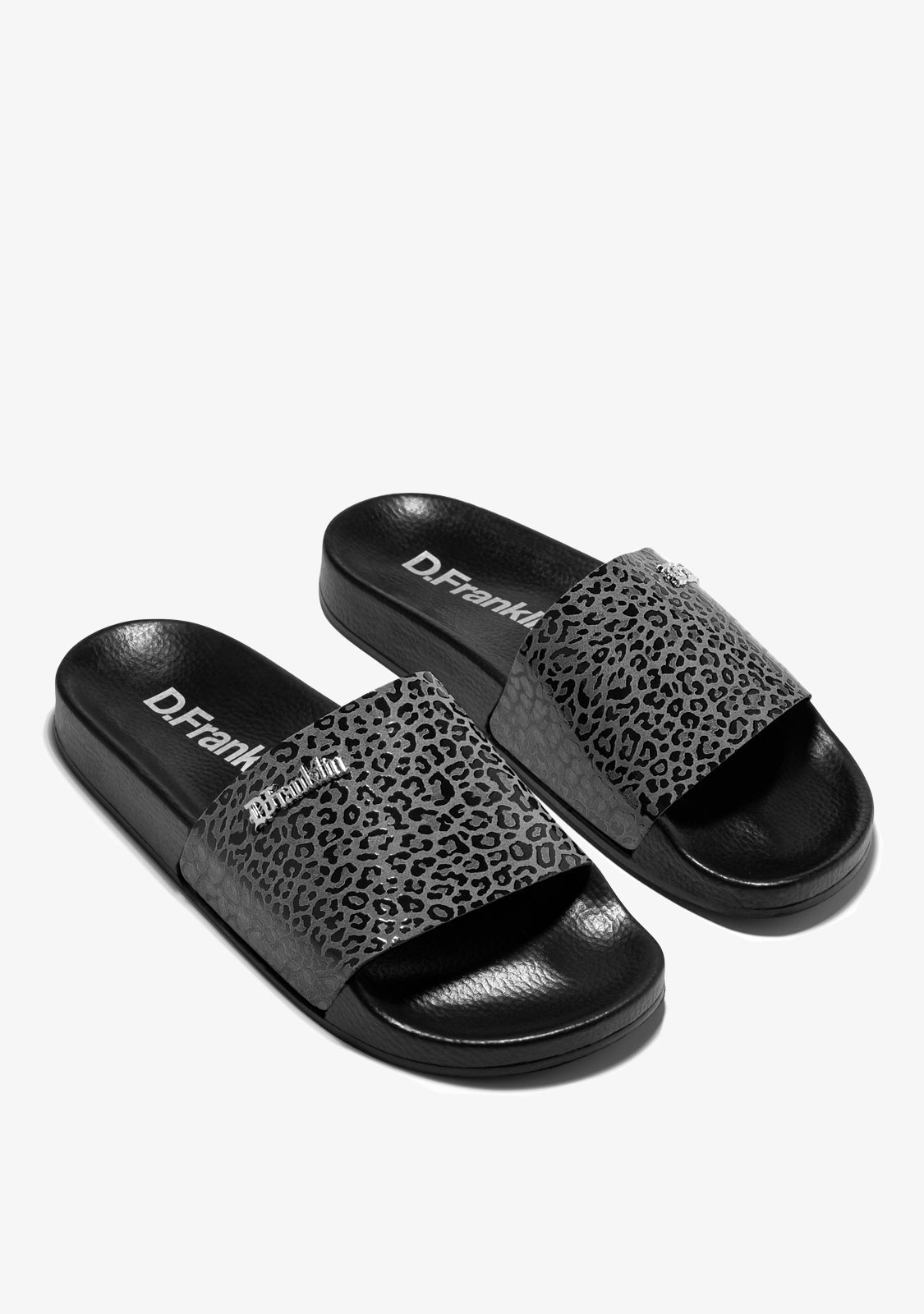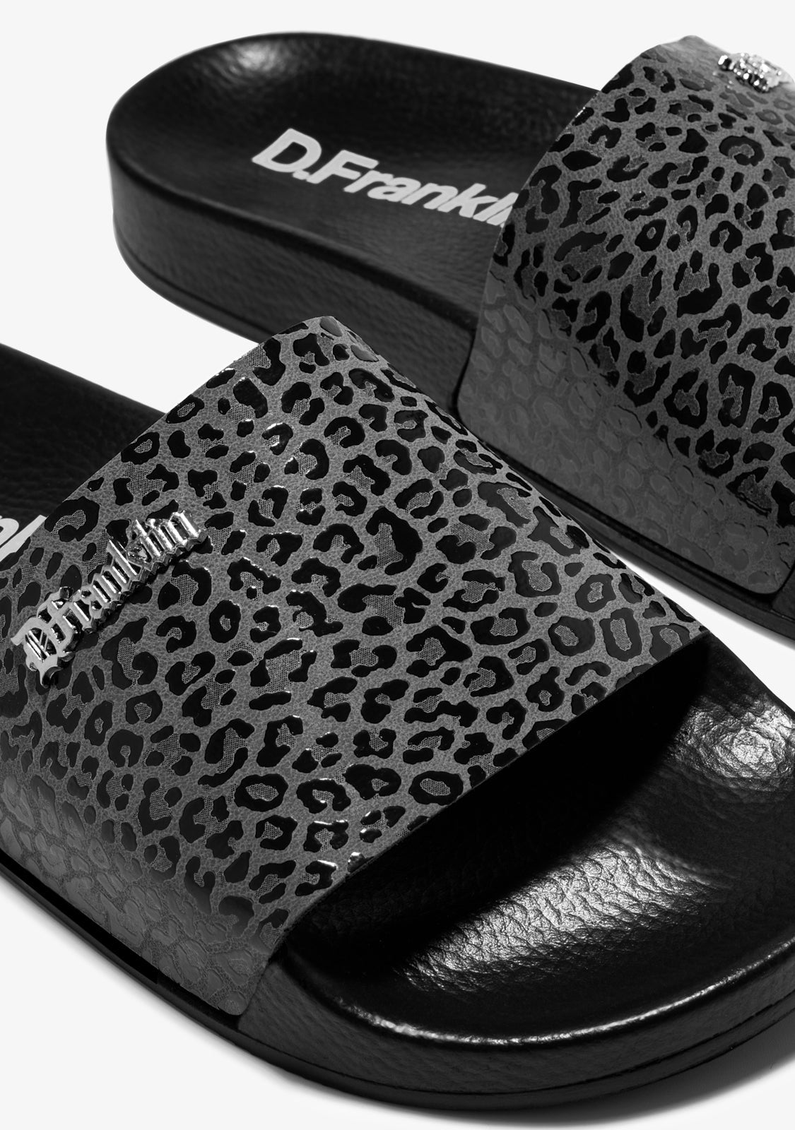 The D.Franklin Pala Slide Patent sandals feature a wide, dark leopard print synthetic strap for a secure fit. They also feature our D.Franklin emblem on the upper. The footbed design is moulded to fit the shape of the foot perfectly.