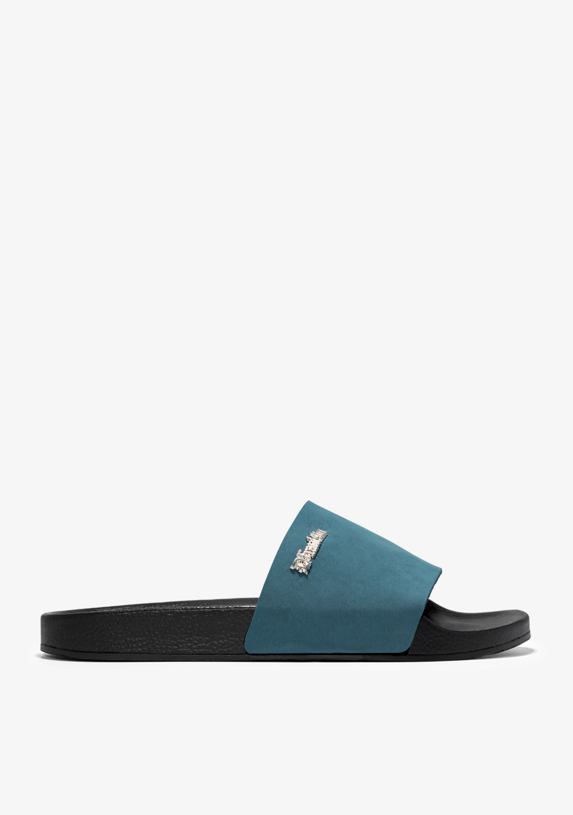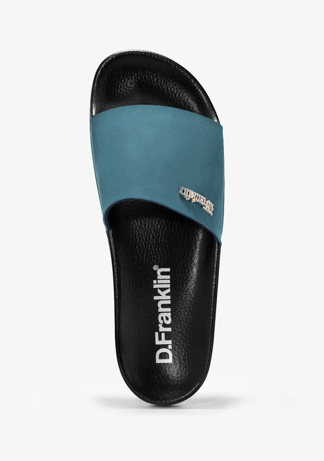The D.Franklin Pala Slide Patent sandals feature a wide, matte blue synthetic strap for a secure fit. They also feature our D.Franklin emblem on the upper. The footbed design is moulded to fit the shape of the foot perfectly.