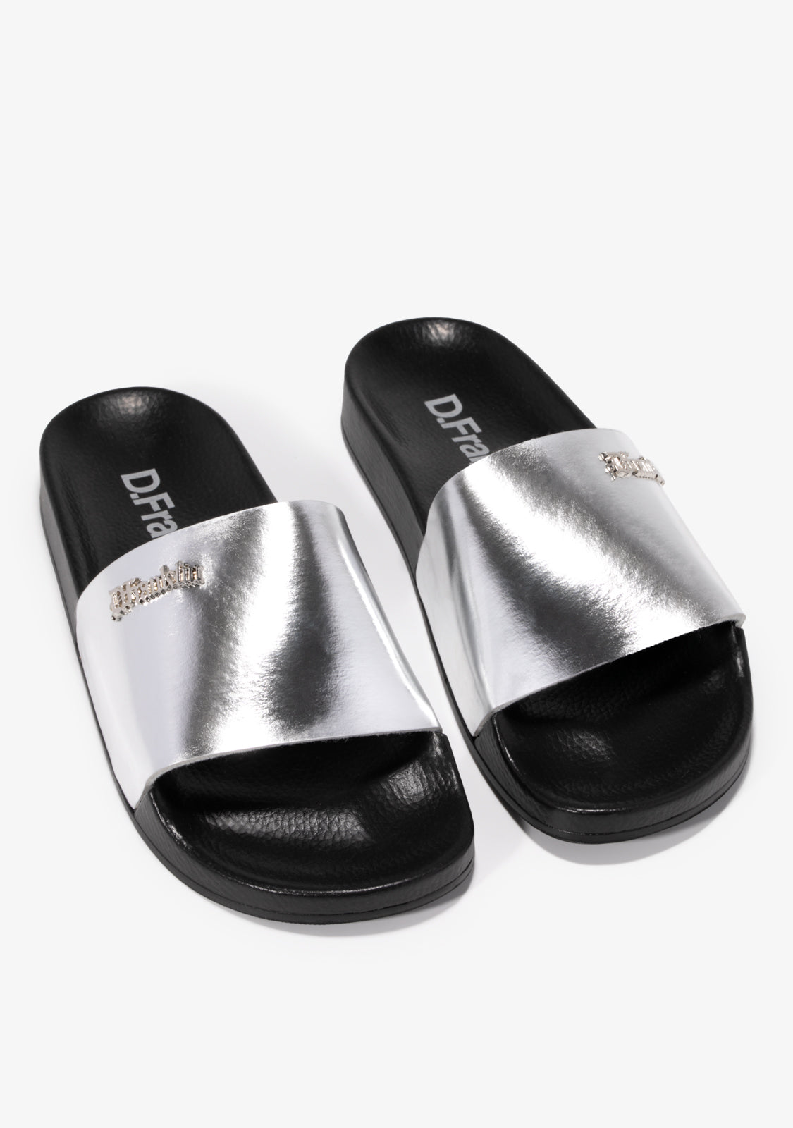The D.Franklin Pala Slide Patent sandals feature a wide, silver-tone synthetic strap for a secure fit. They also feature our D.Franklin emblem on the upper. The black sole design is moulded to fit the shape of the foot perfectly.