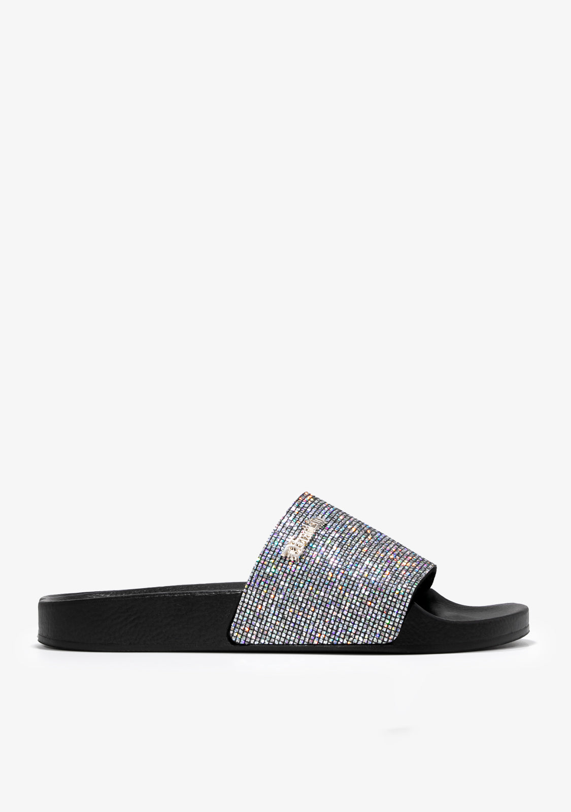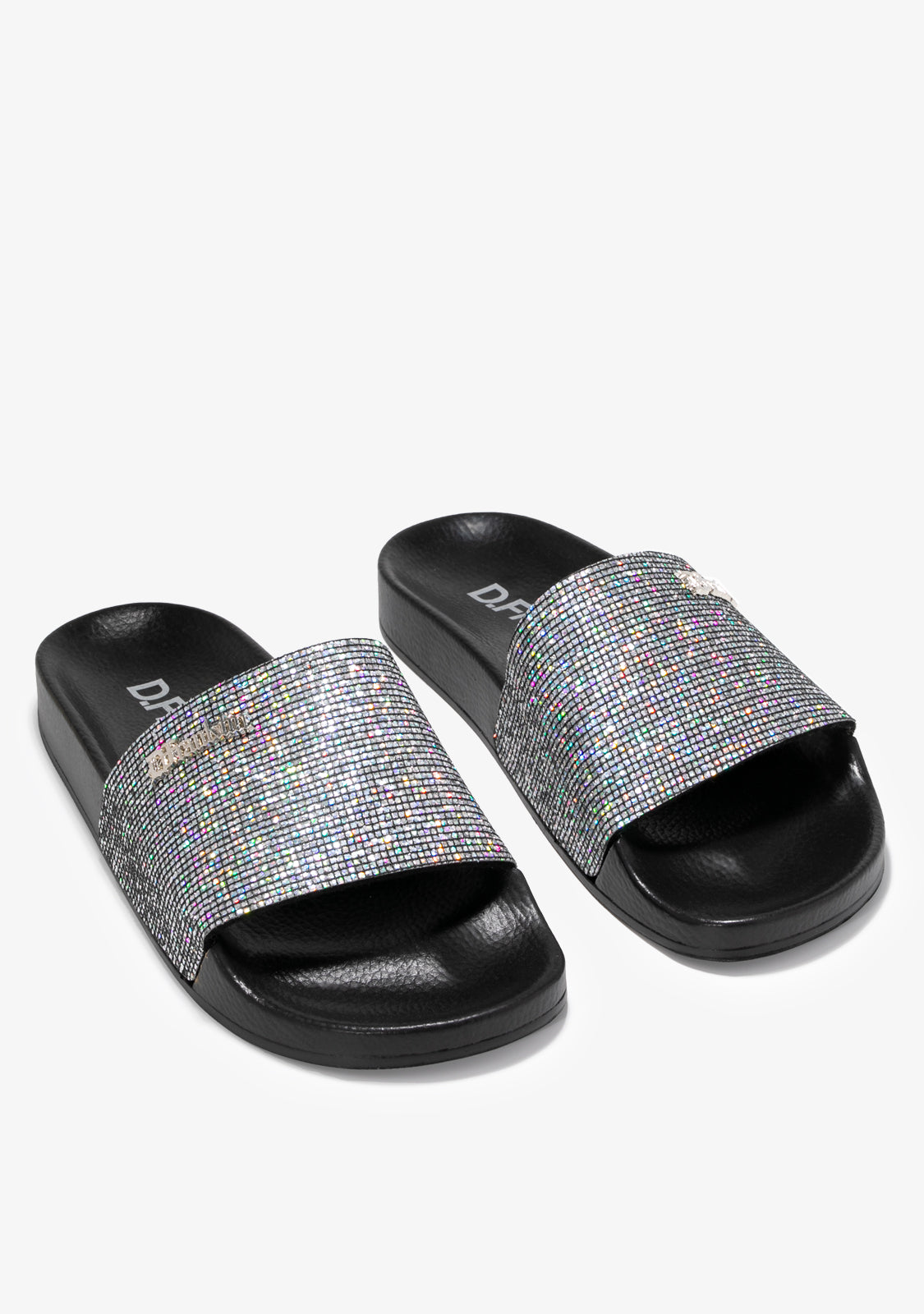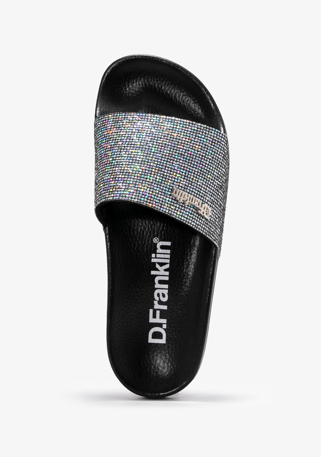 The D.Franklin Pala Slide Patent sandals feature a wide synthetic strap with glitter print for a secure fit. They also feature our D.Franklin emblem on the upper. The footbed design is moulded to fit the shape of the foot perfectly.