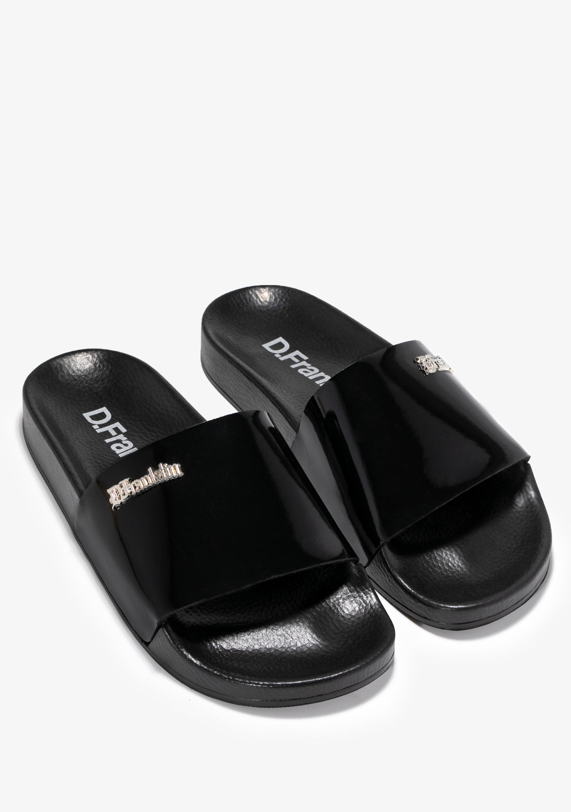 The D.Franklin Pala Slide Patent sandals feature a wide, dark-toned synthetic strap for a secure fit. They also feature our D.Franklin emblem on the upper. The footbed design is moulded to fit the shape of the foot perfectly.