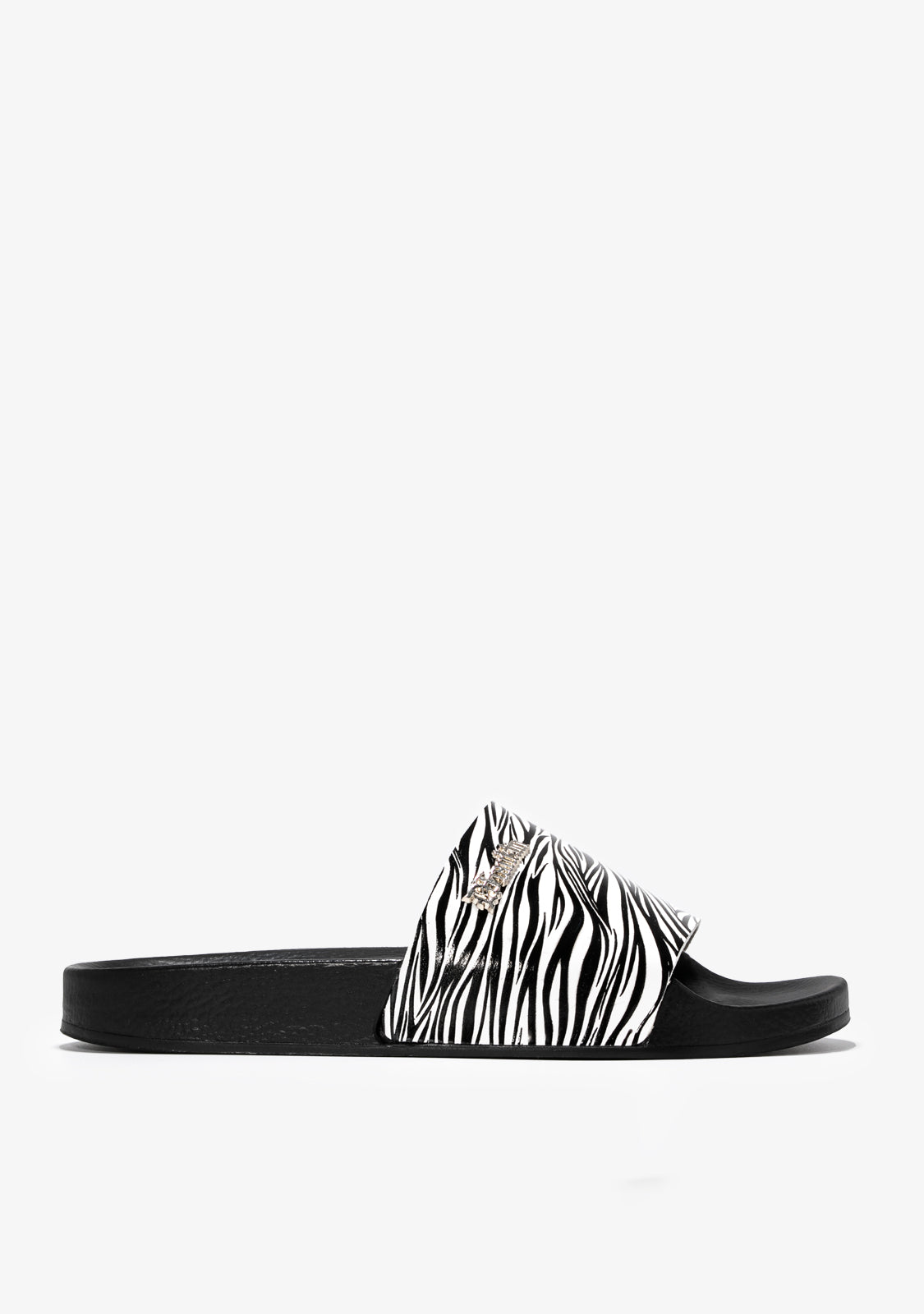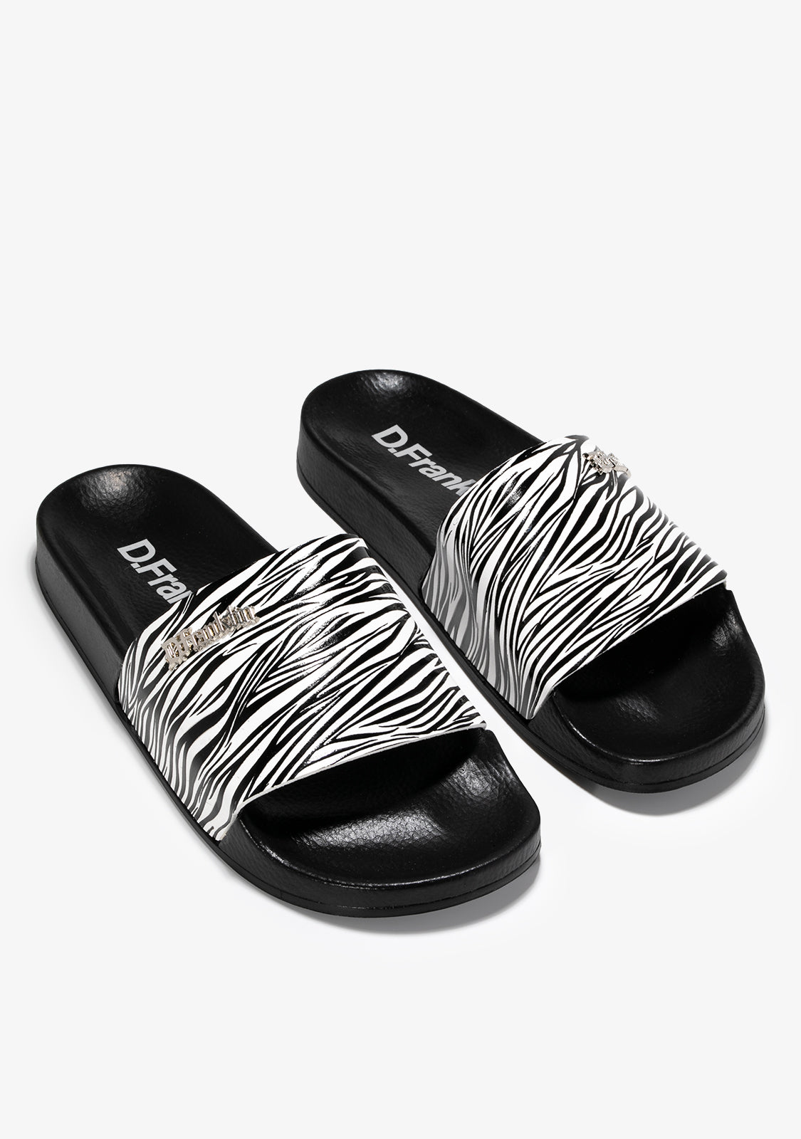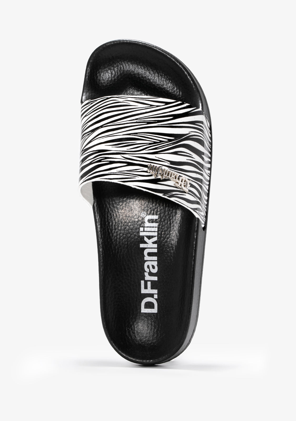 The D.Franklin Pala Slide Patent sandals feature a wide, zebra-print synthetic strap for a secure fit. They also feature our D.Franklin emblem on the upper. The footbed design is moulded to fit the shape of the foot perfectly.