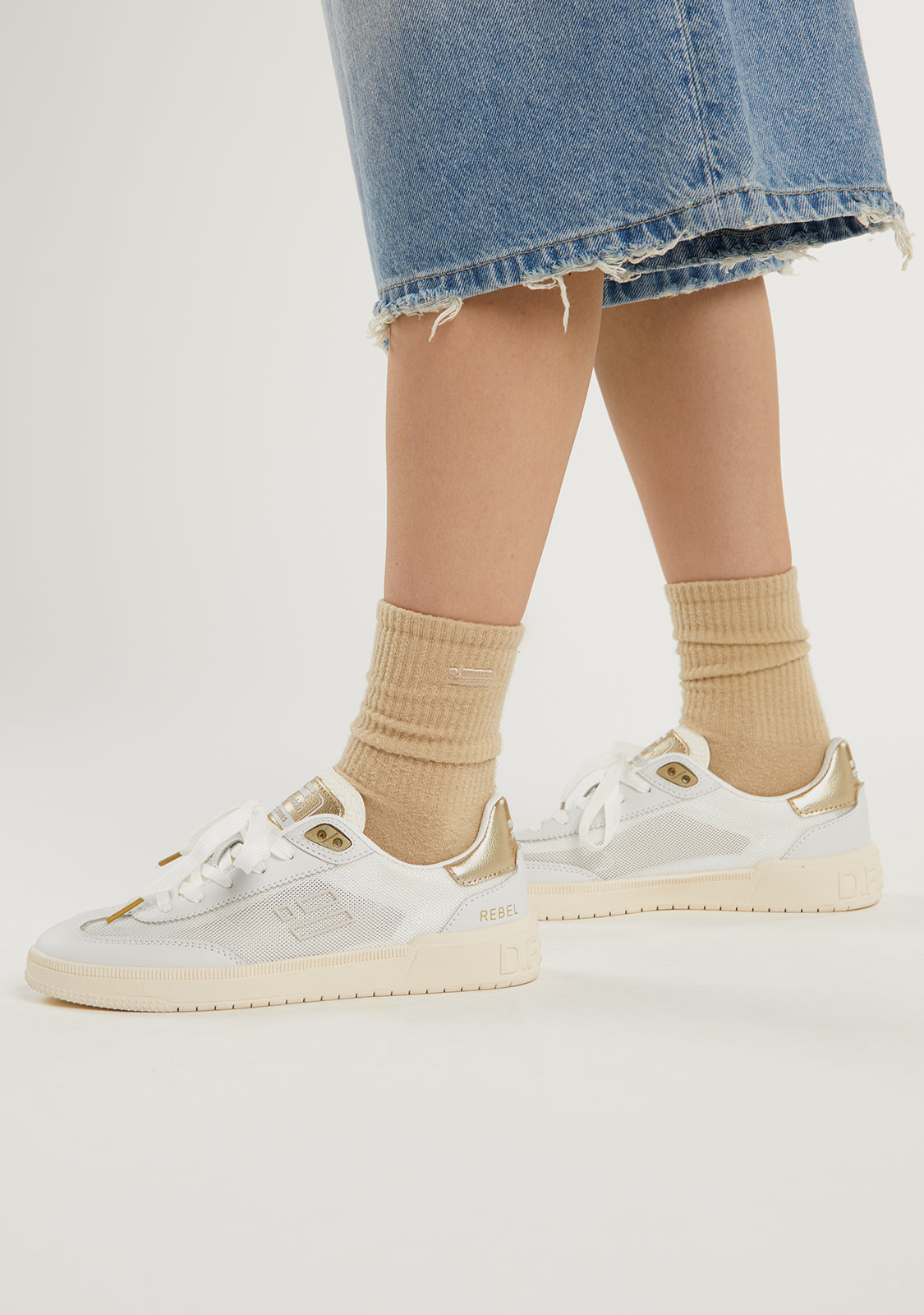 The Rebel Mesh Flag White / Gold trainers by D.Franklin are the perfect casual footwear for those seeking style and comfort in their daily lives. This model, with an elegant suede finish, combines versatility and modern design in a beige tone that easily adapts to any outfit.