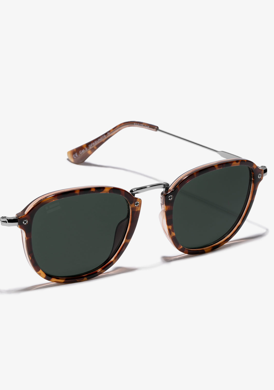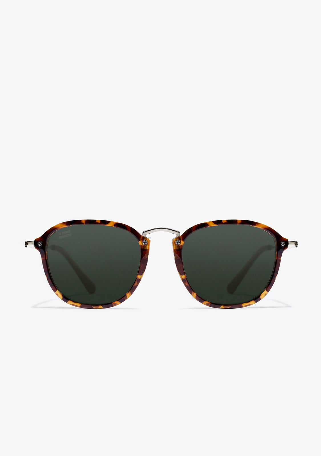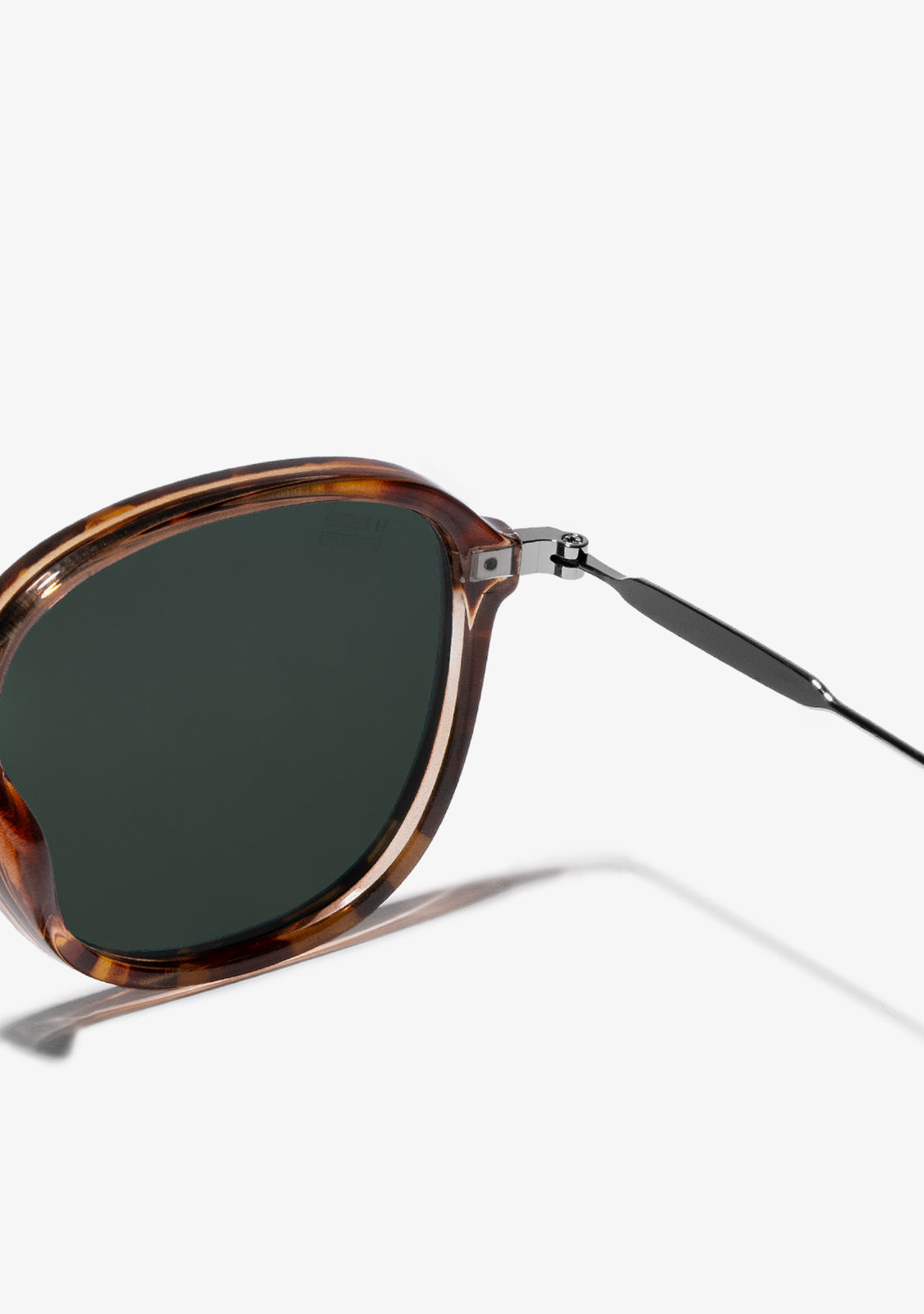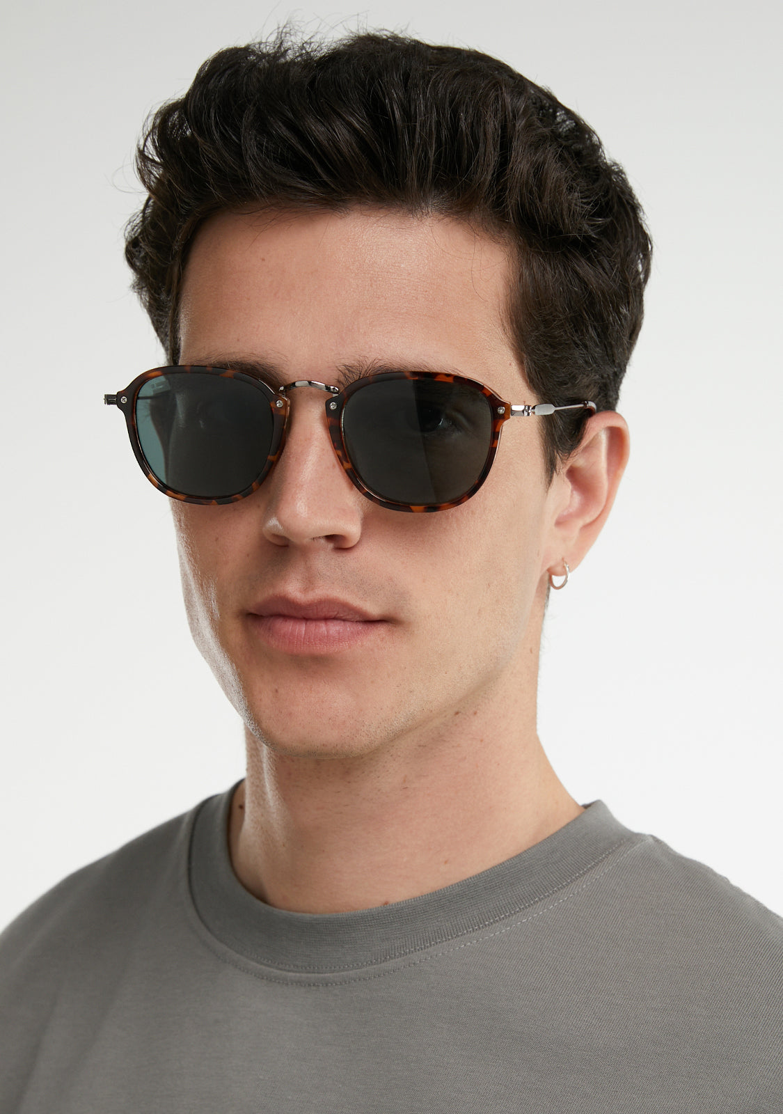 The polycarbonate lenses feature a brown hue on a silver-tone tortoiseshell silhouette with a square frame. It features our brand's signature details: the logo engraved on both metal temples and our emblem on the right lens. With a lens width of 53.5 mm and a 147 mm front frame, these glasses enhance the features of any face. The side temples are made of stainless steel and have a length of 145 mm.