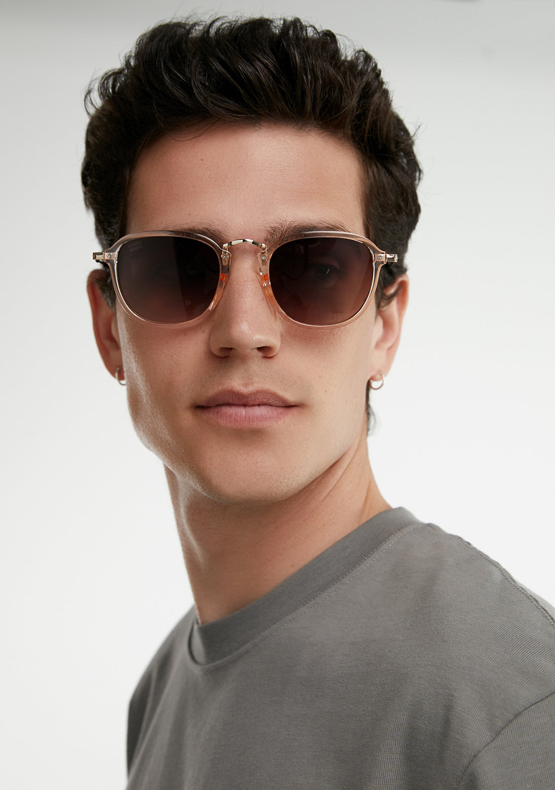 The polycarbonate lenses feature a smoky brown hue on a square champagne silhouette. It features our brand's signature details: the logo engraved on both metal temples and our emblem on the right lens. With a lens width of 53.5 mm and a 147 mm front frame, these glasses enhance any face. The side temples are made of stainless steel and have a length of 145 mm.