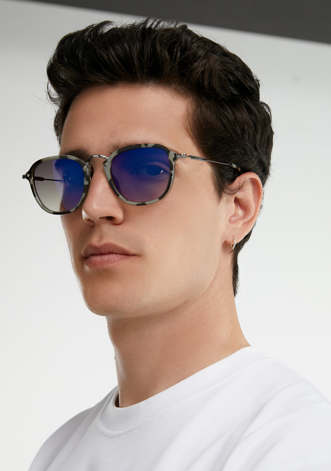 Smoked polycarbonate mirrored REVO lenses feature a metallic silhouette with a square frame. It features our brand's signature details: the logo engraved on both metal temples and our emblem on the right lens. With a lens width of 51 mm and a 147 mm front frame, these glasses enhance any face. The side temples are made of stainless steel and have a length of 145mm.