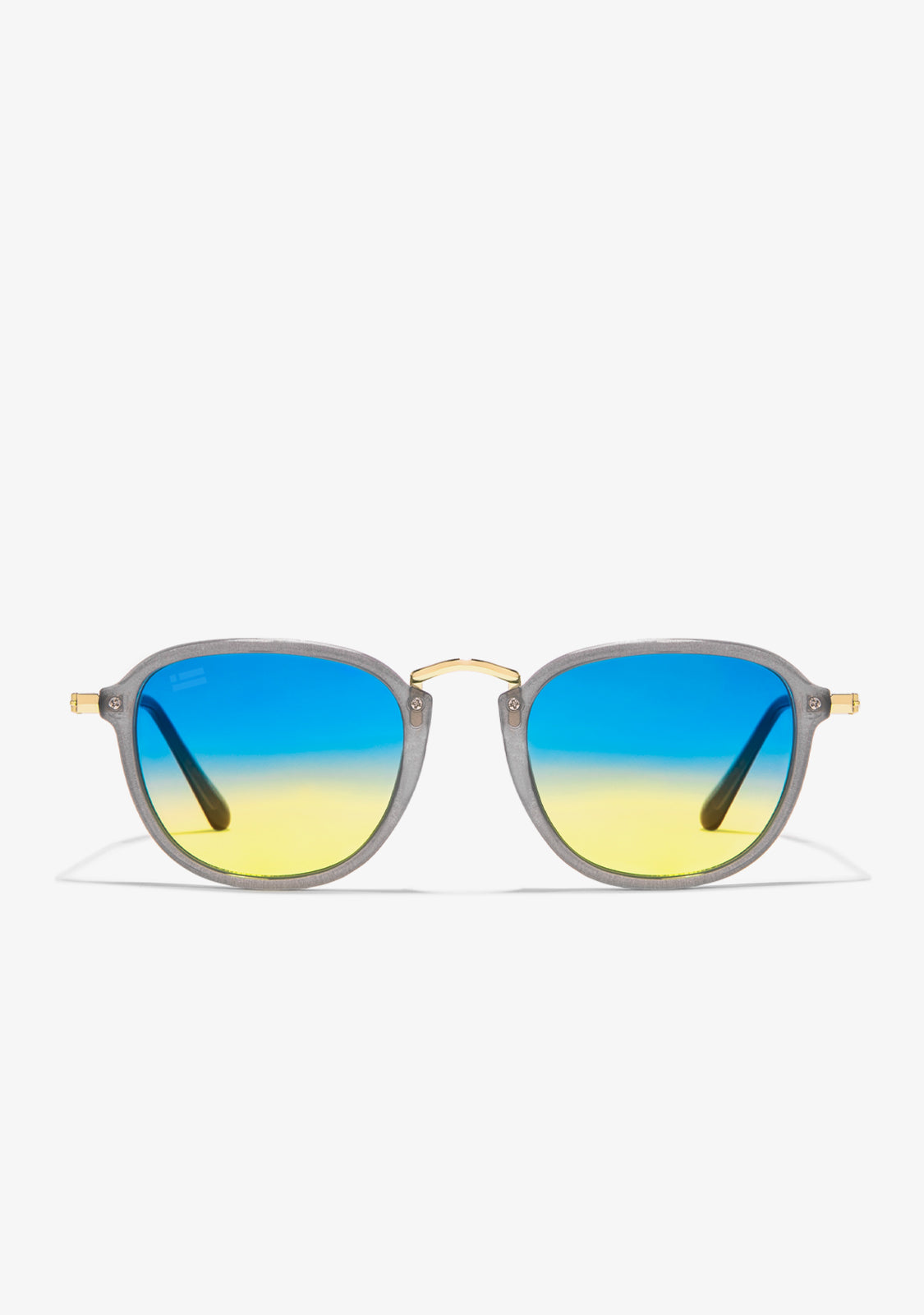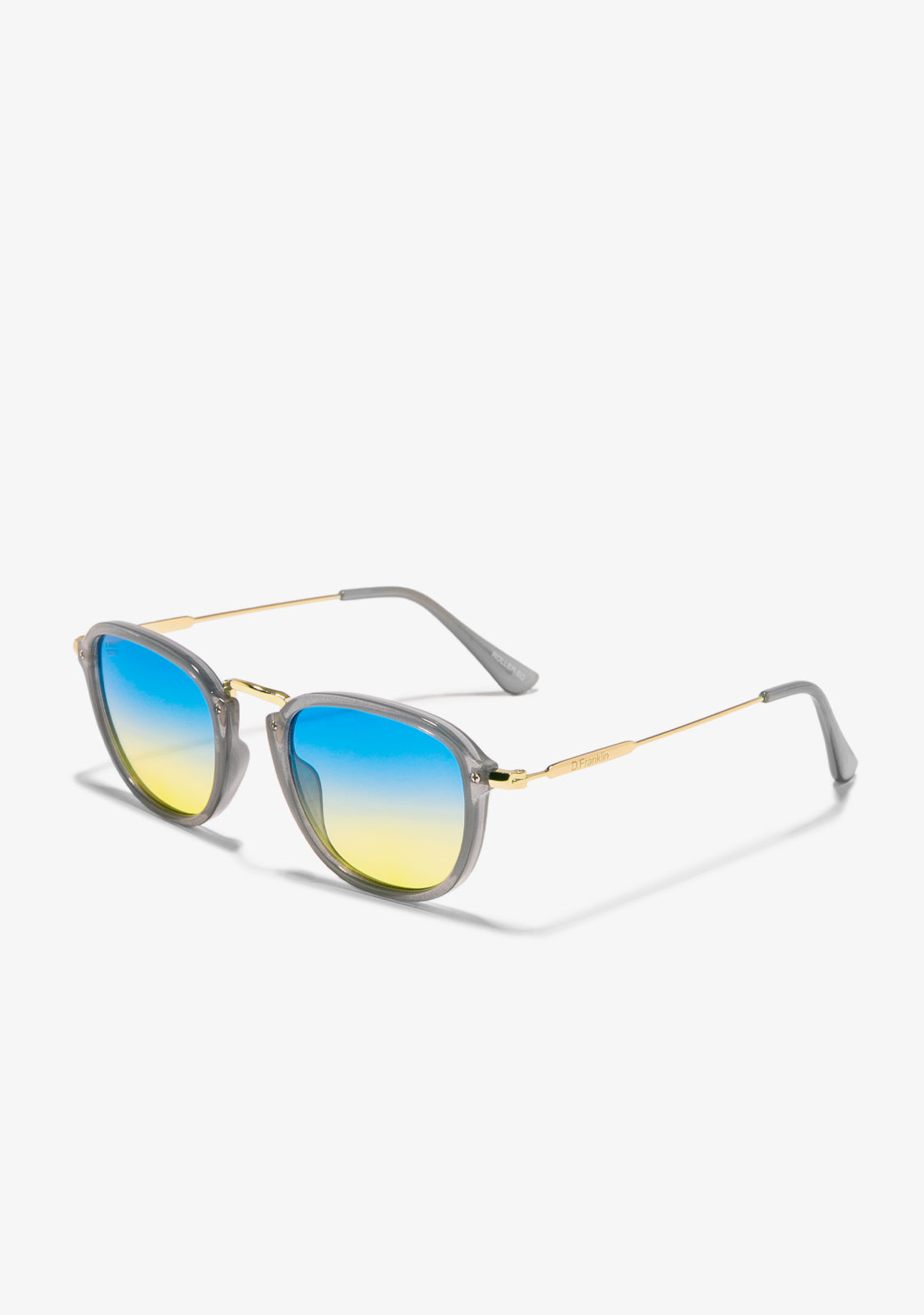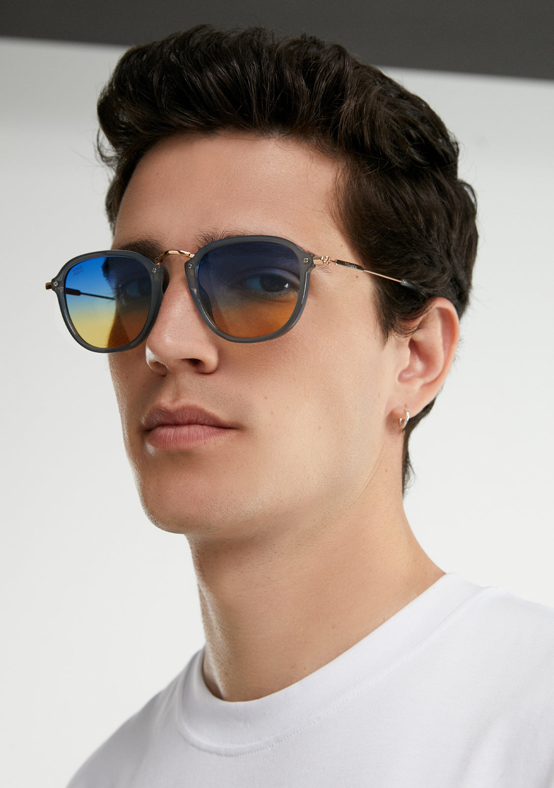 The polycarbonate lenses feature a smoky blue tint on a square-framed gold silhouette. It features our brand's signature details: the logo engraved on both metal temples and our emblem on the right lens. With a 51mm lens width and 147mm front frame, these glasses enhance any face. The side temples are made of stainless steel and have a length of 145mm.
