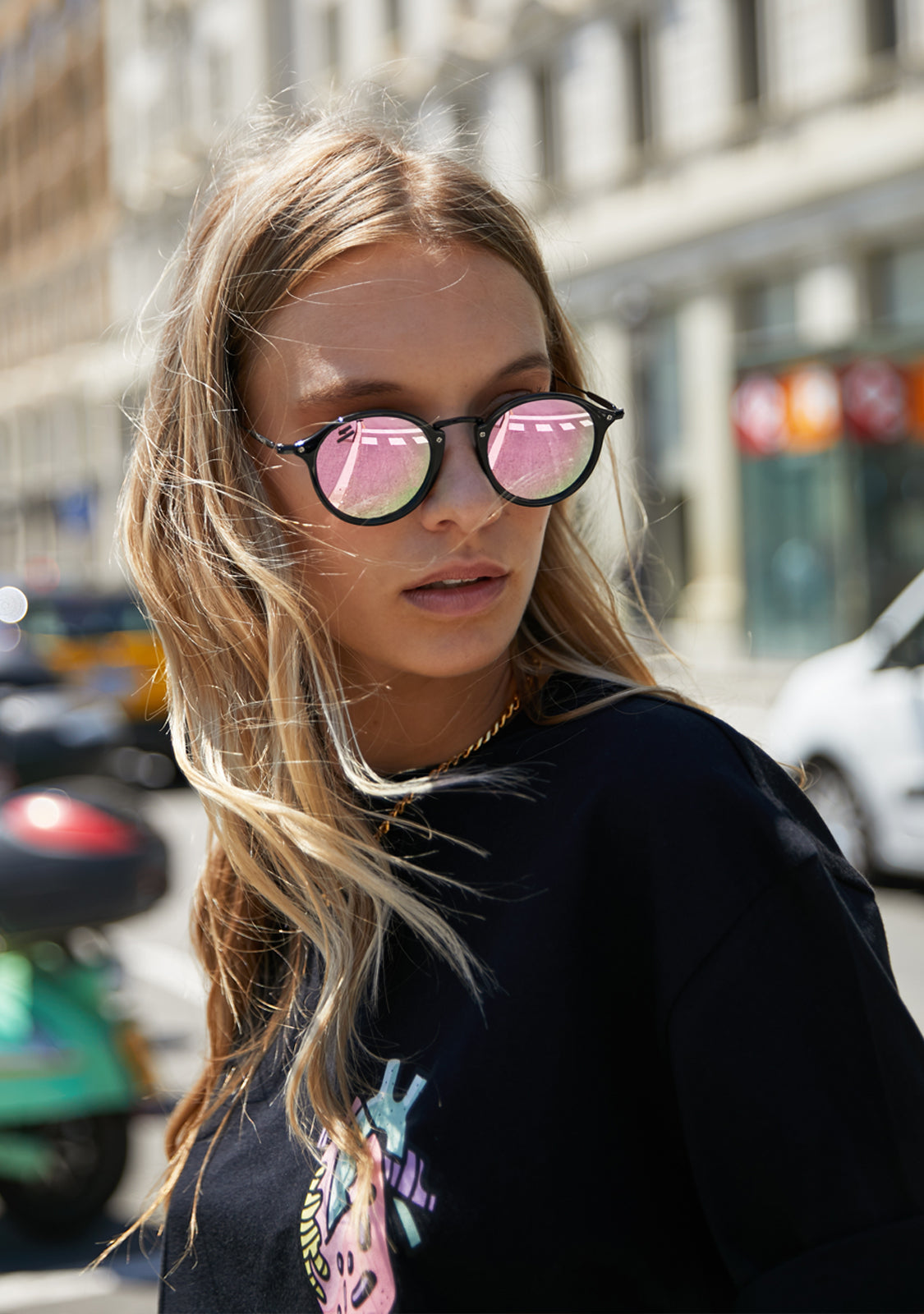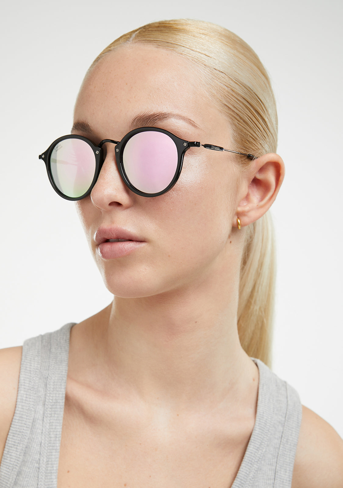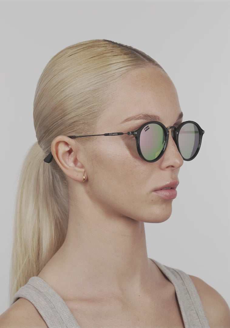 Rounded, mirrored pink tinted lenses and tortoiseshell frames reinforce this model's seventies aesthetic. It features our signature D.Franklin details: the logo engraved on both metal temples and our emblem on the right lens. With a lens width of 49mm and a 148mm front width frame, these glasses will flatter most faces. The side temples are 145mm long.