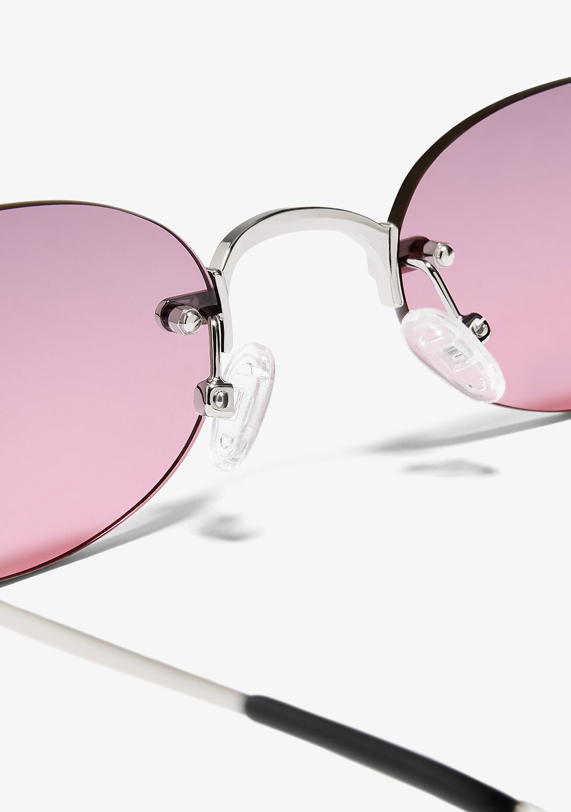 The Smith Oval by D.Franklin reinterprets the oval silhouette with a contemporary twist. Its shiny silver metal frame adds lightness and luminosity, while the pink gradient lenses add an original touch that turns any look into a true style statement.