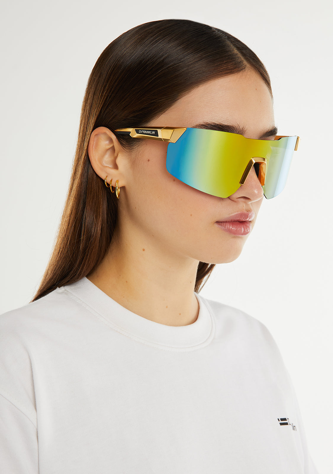 This model delves into the depths of the oceans with mirrored lenses that are limitless and frameless. It has a gold finish and features our signature emblem on the side of the temples. The uniform lens width is 145 mm and the temple width is 130 mm.