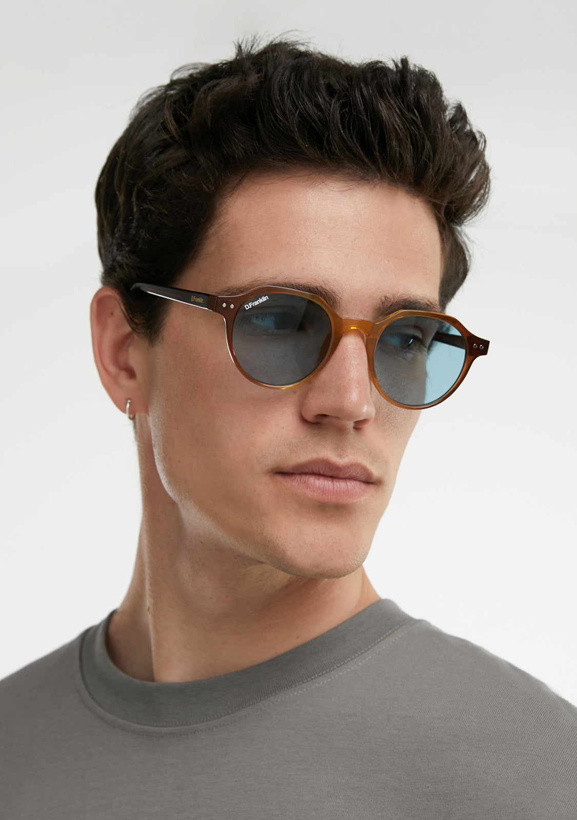 Its blue tinted round smoked lenses and TR90 frame in brown degrade highlight the timelessness of this model, with a unique touch. It features our distinctive D.Franklin details: the logo engraved on both metal temples and our emblem on the right lens. With a lens width of 47 mm and a front frame of 138 mm, these glasses flatter most faces. The side temples have a length of 145 mm.