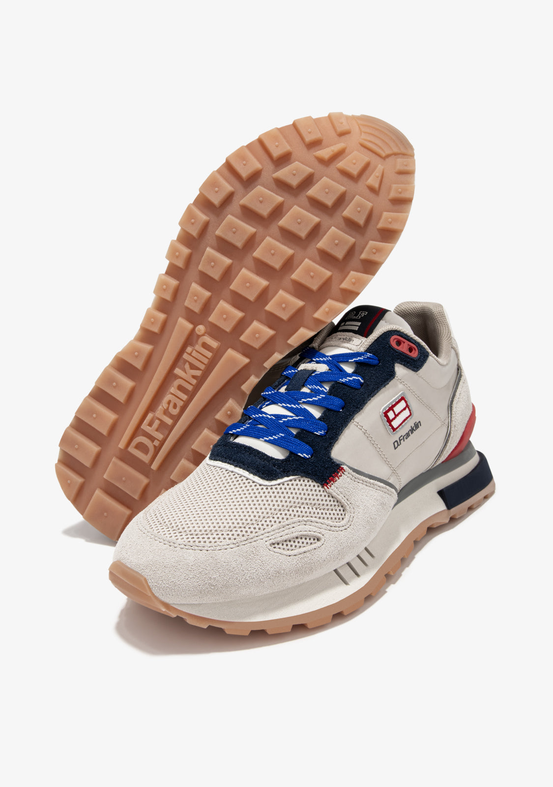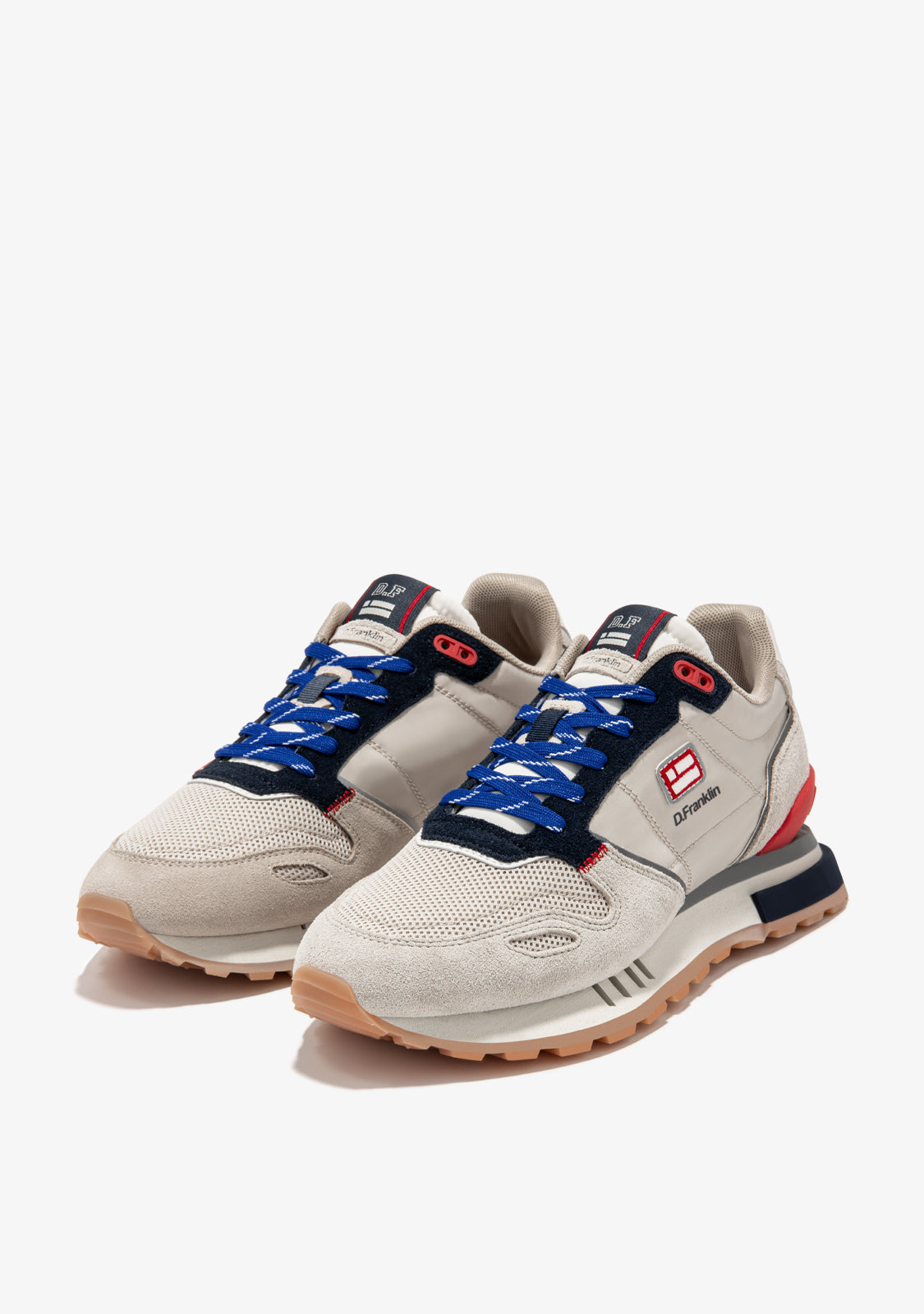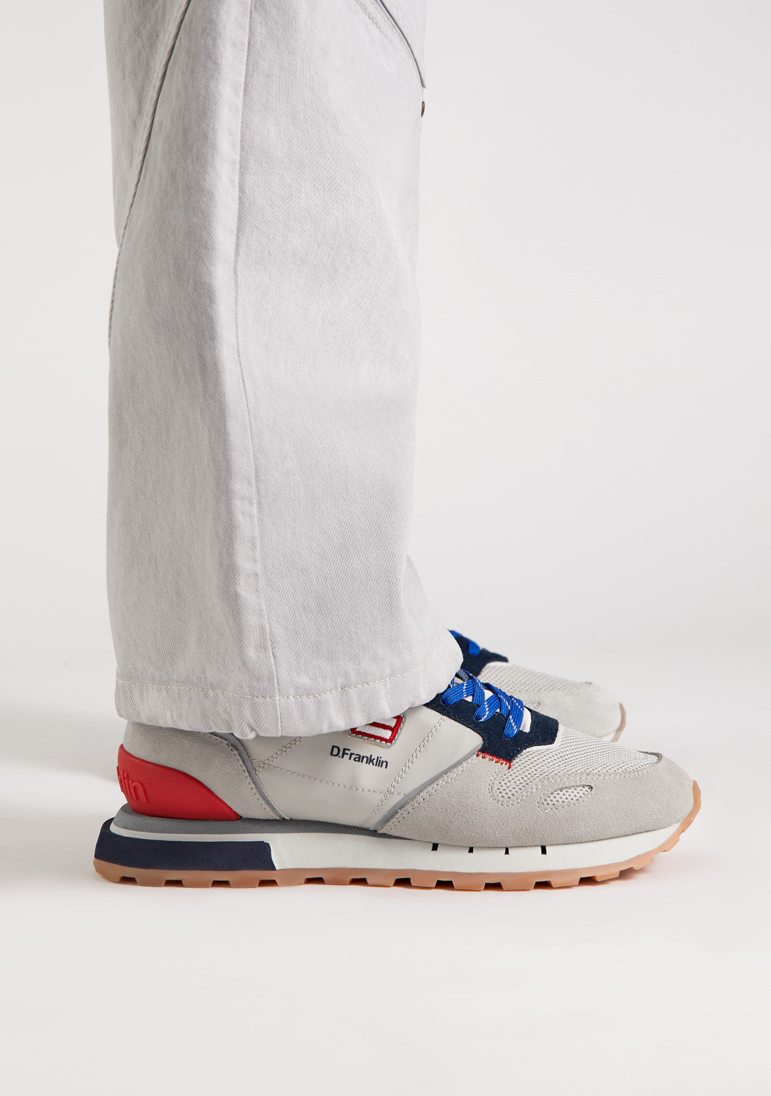 These sneakers are made with grey, navy and red details. They also feature blue printed laces. They have a TR sole and a pyramid outsole for enhanced comfort and traction. The toe area has a mixed toe piece for added flexibility. Our emblem can be found on the front and side as well as on the back.