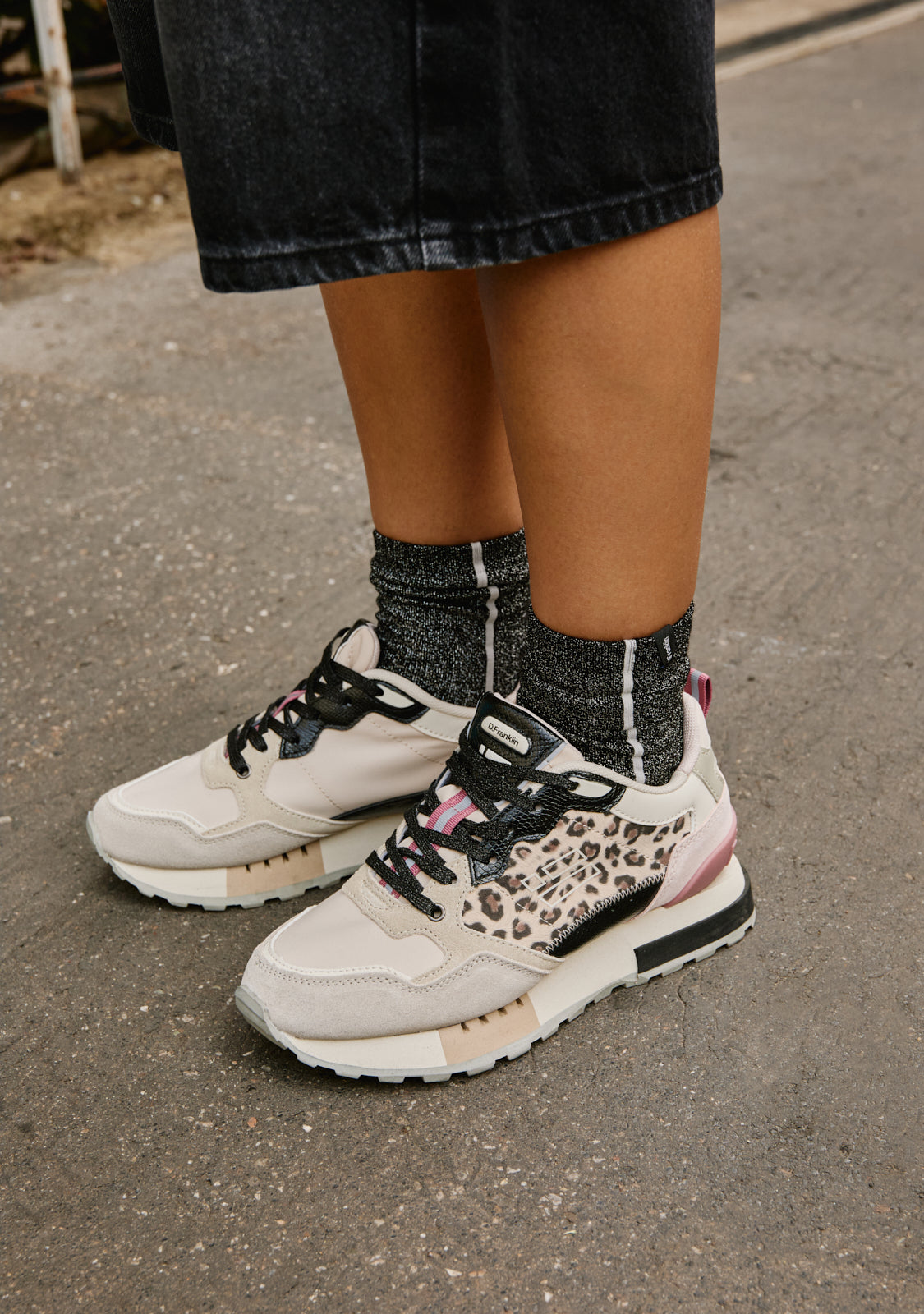These sneakers are made with white, beige and pink details. They also feature leopard print on the sides. They feature a TR sole and pyramid finish for enhanced comfort and traction. The toe part has a mixed piece that provides greater flexibility. Our emblem can be found on the front and sides as well as on the back.