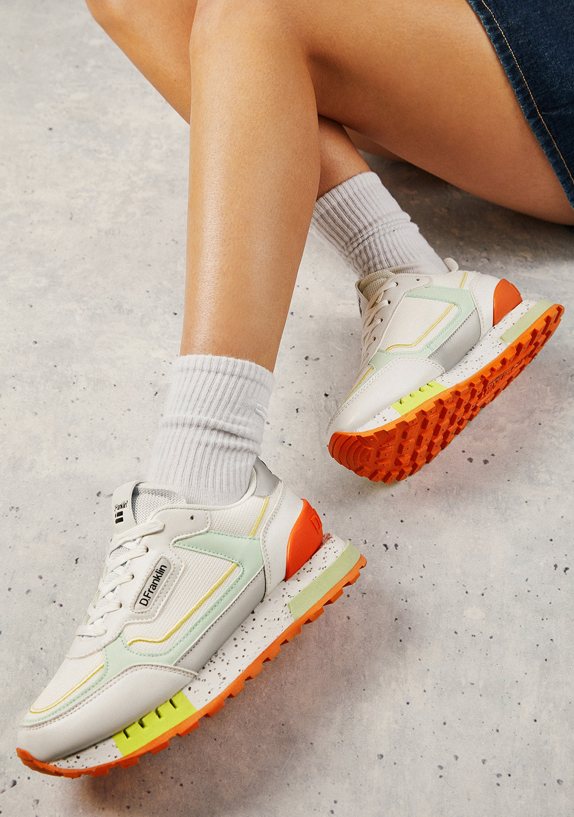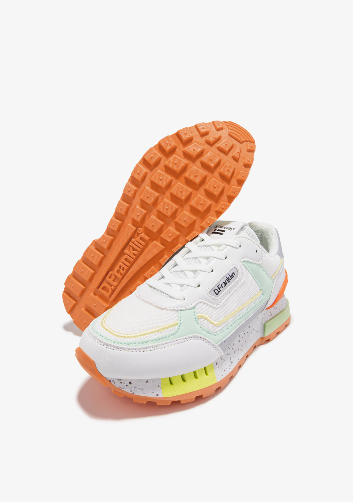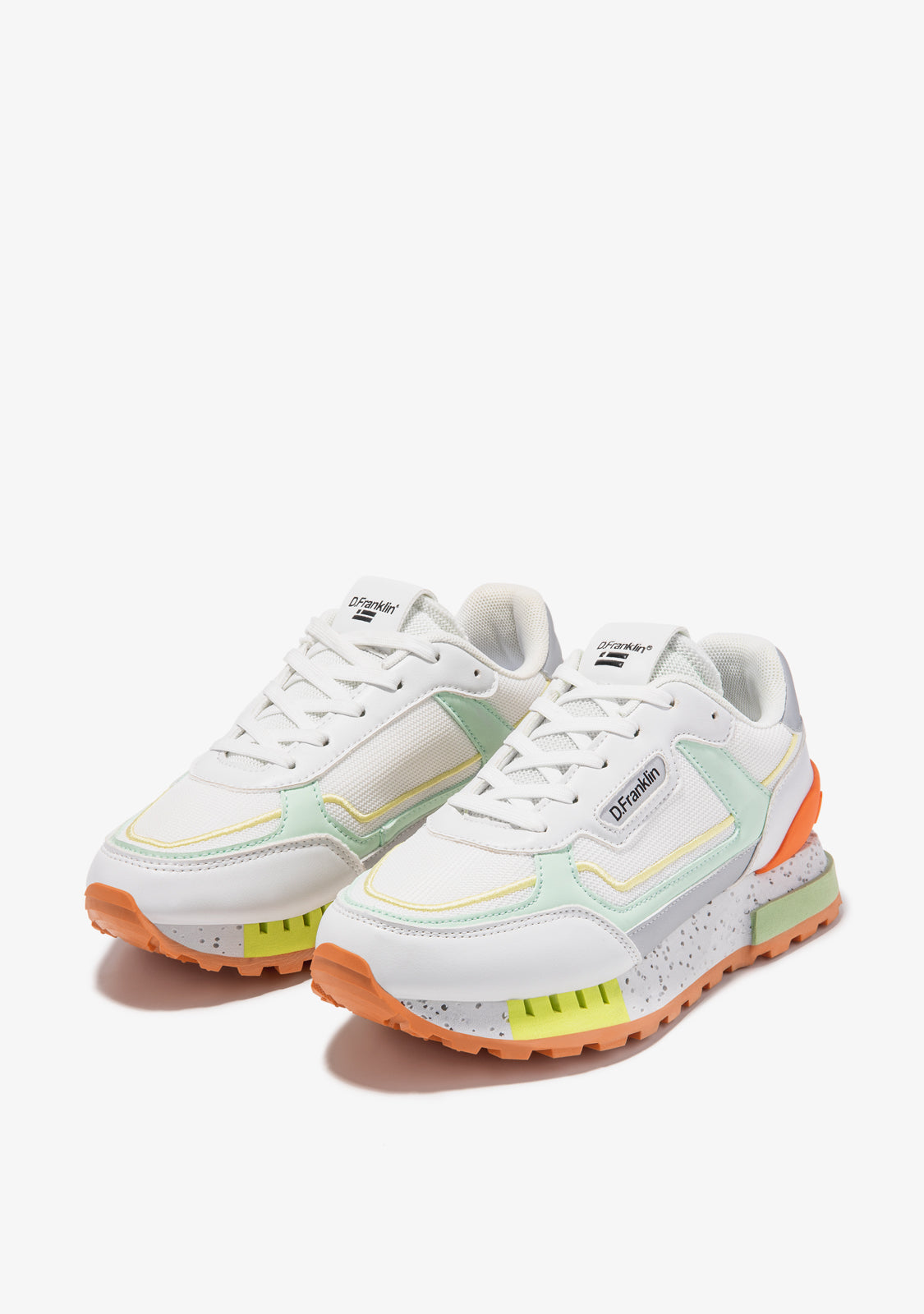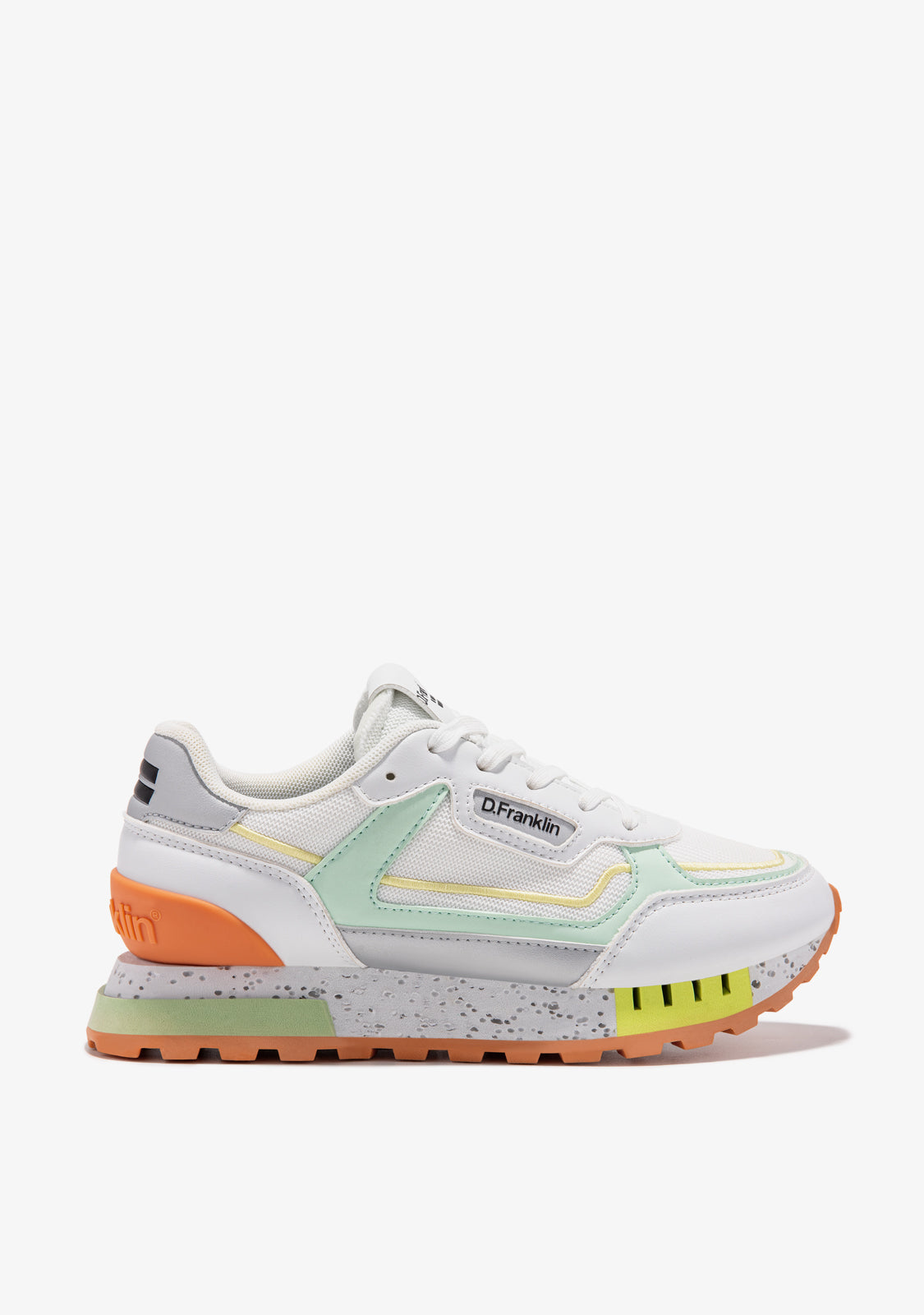 These sneakers feature white, grey, orange, green and yellow details. They feature a TR sole with perforated detailing and a pyramid finish for enhanced comfort and traction. They also feature a mixed toe cap for added flexibility. Our emblem can be found on the front and side as well as on the back.