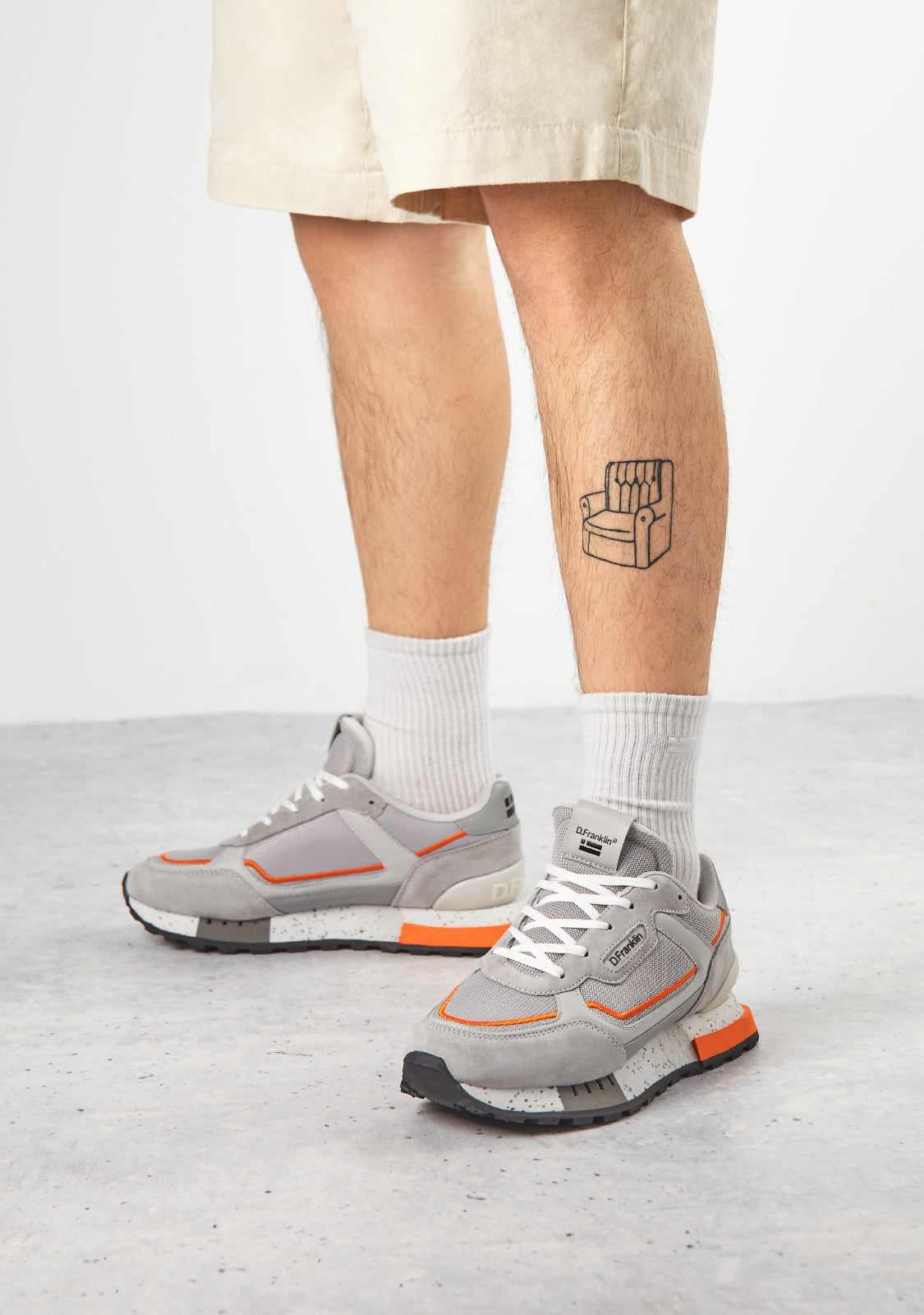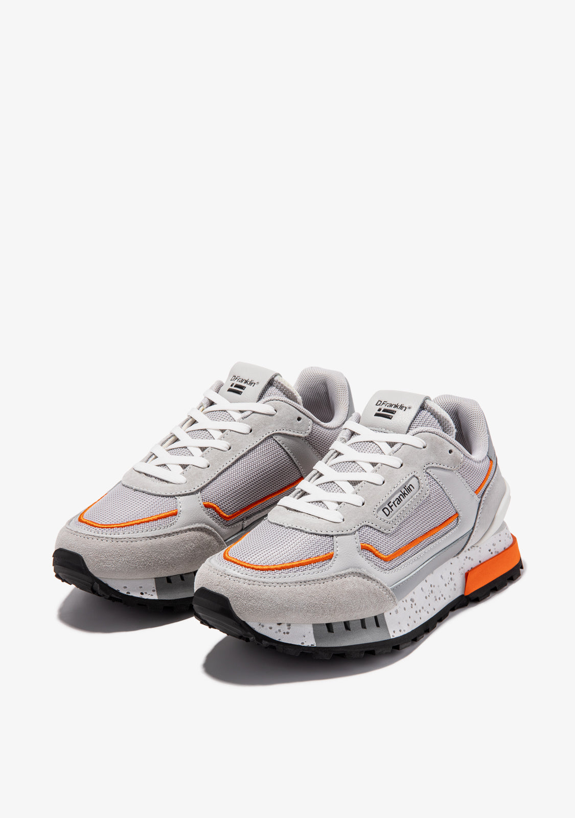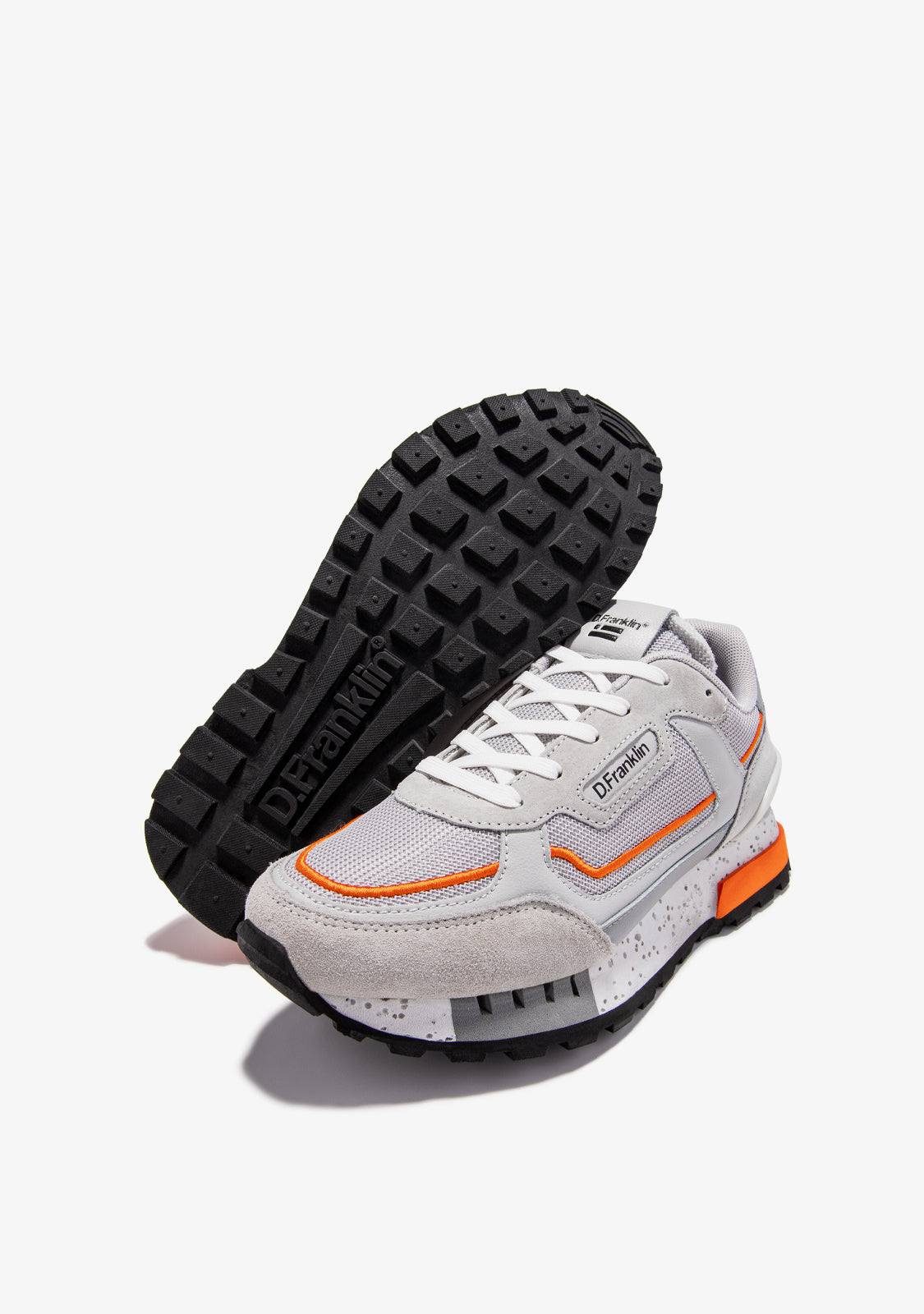 These sneakers are crafted with grey and orange detailing. They feature a TR sole with perforated detailing and pyramid-shaped finish for enhanced comfort and traction. They also feature a mixed toe cap for added flexibility. Our emblem can be found on the front and side as well as on the back.