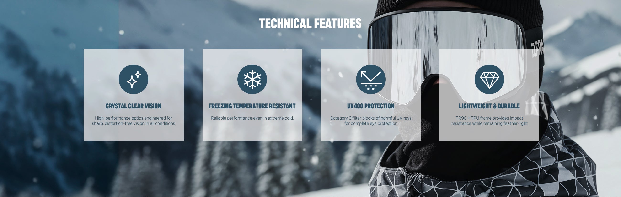 They feature UV400 protection and a Category 3 filter, offering optimal shielding in high-sunlight environments. Built with a TR90 + TPU frame, they ensure durability, flexibility and reliable performance even in freezing temperatures. The adjustable elastic strap (nylon, polyester, rubber) guarantees a secure fit all day long.