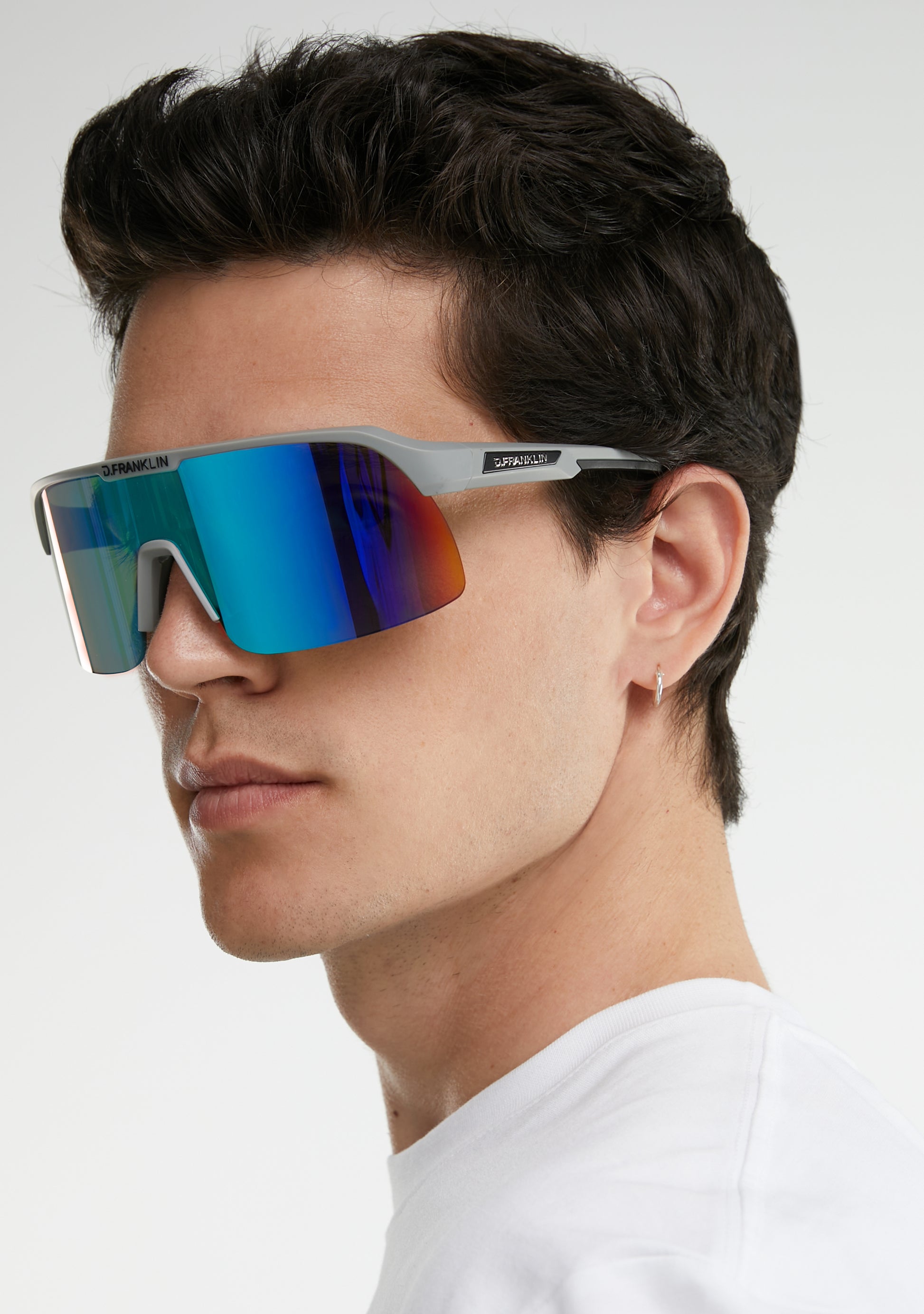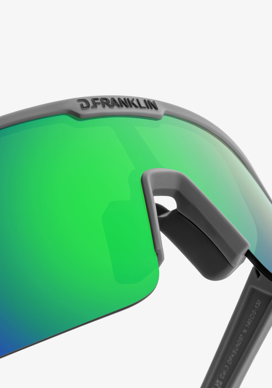 Designed with performance in mind, the new Wind collection by D.Franklin gives you a bold and versatile look that you can confidently wear everywhere. Unmistakable sports sunglasses, created with high quality materials and superior lightness. The Wind Fifty Cool Gray / Green model guarantees maximum protection and comfort thanks to its panoramic lenses and silicone nose pads.- UV protection, 400 cat. 3